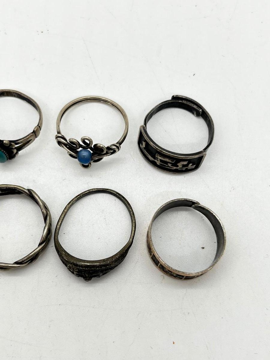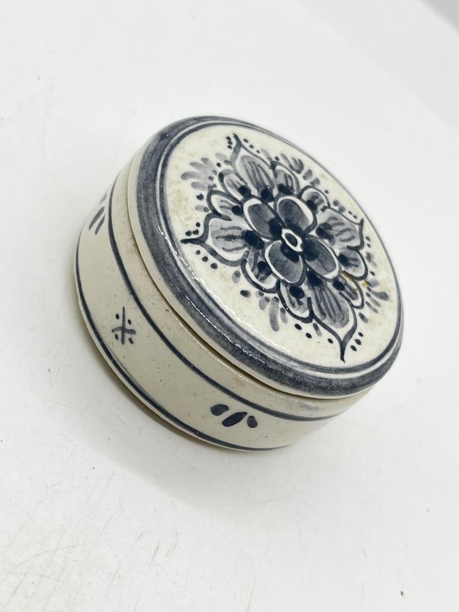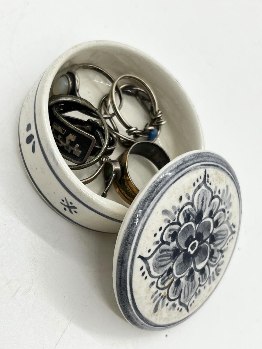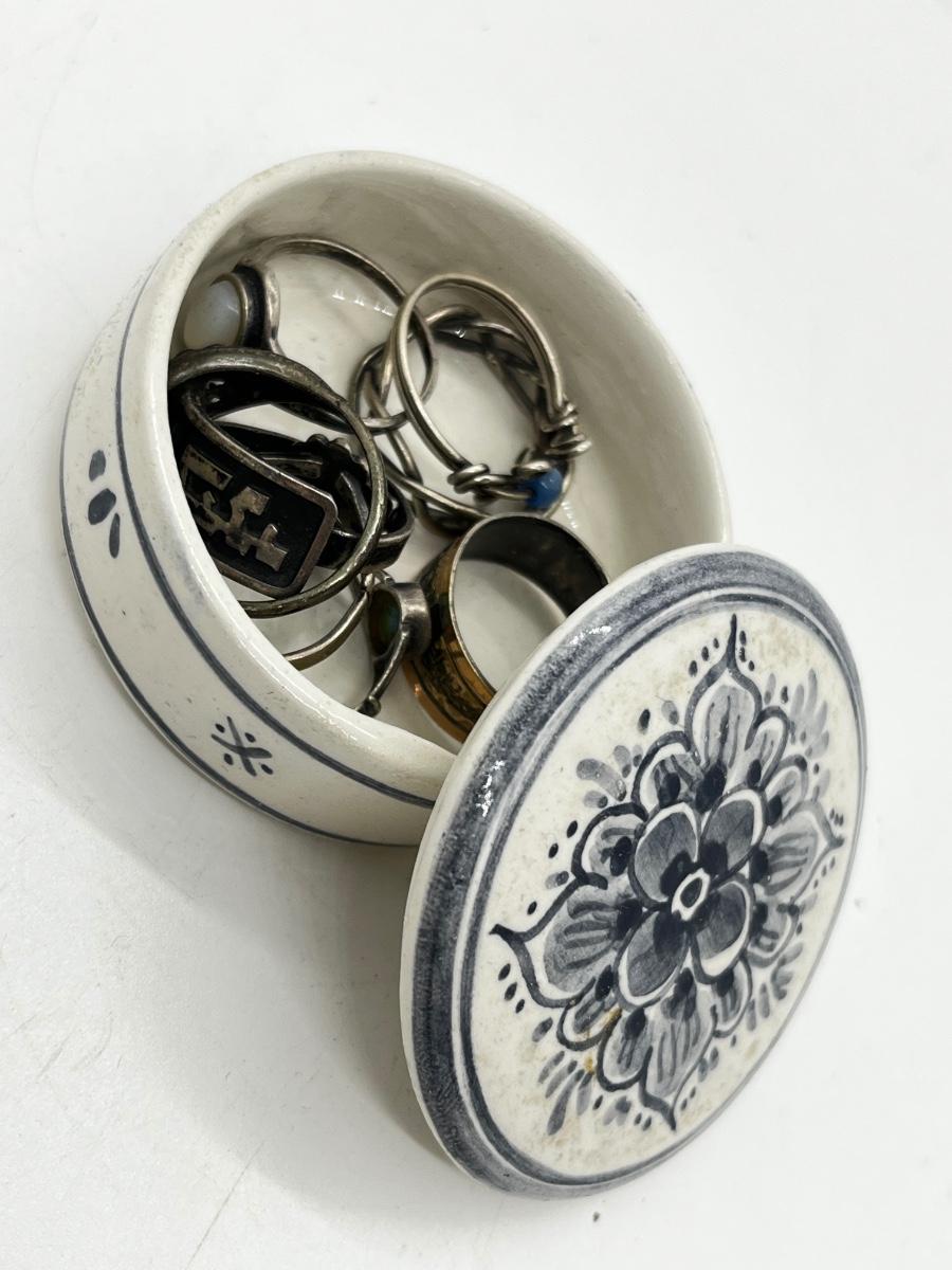 LOT 148: Vintage Delft Blue Ceramic Trinket Box With Assortment of 925 Rings - Sizes 5 and Up