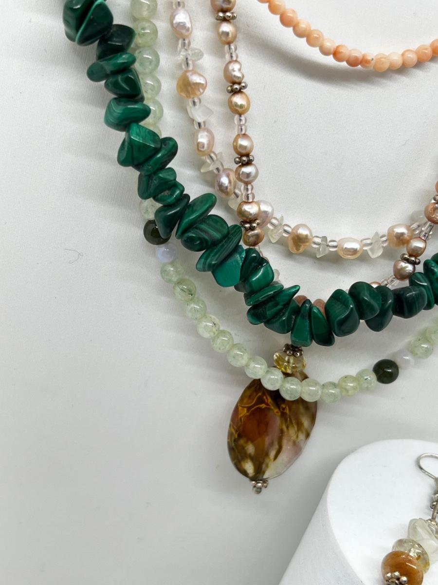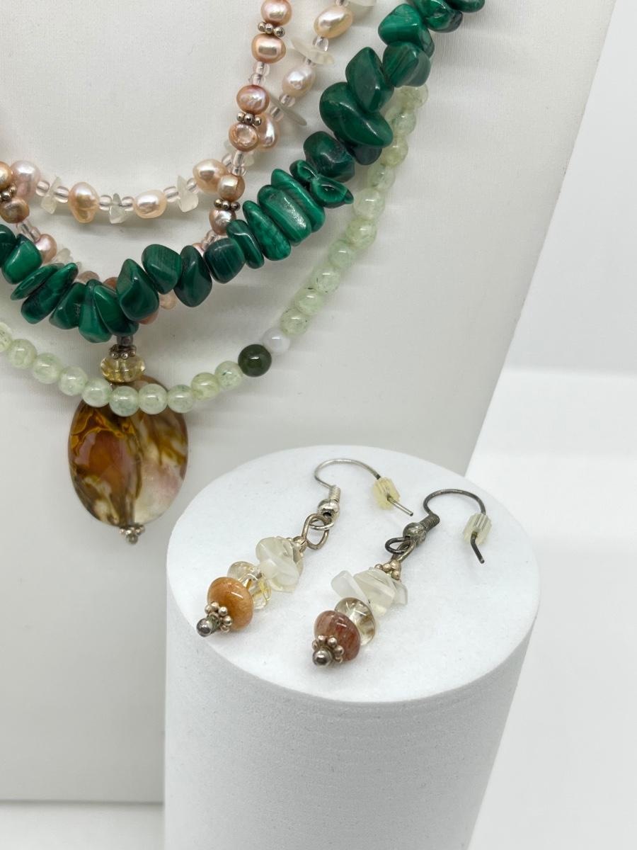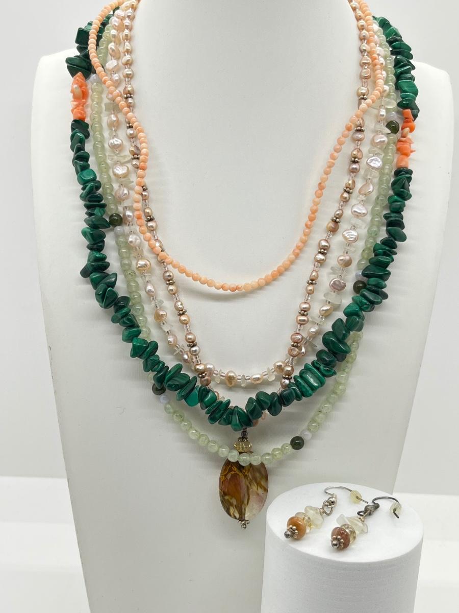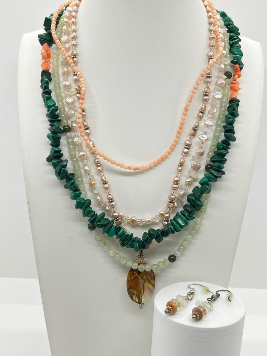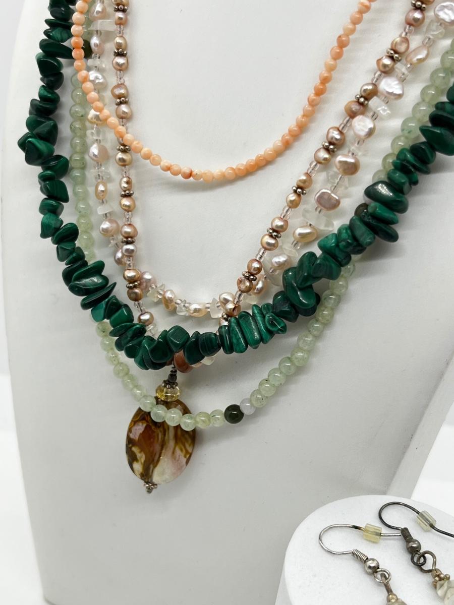 LOT 164: Freshwater Pearl & Quarts 17" Necklace and Matching Earrings, Malachite and Coral 19" Necklace and JAde Bead 19" Necklace