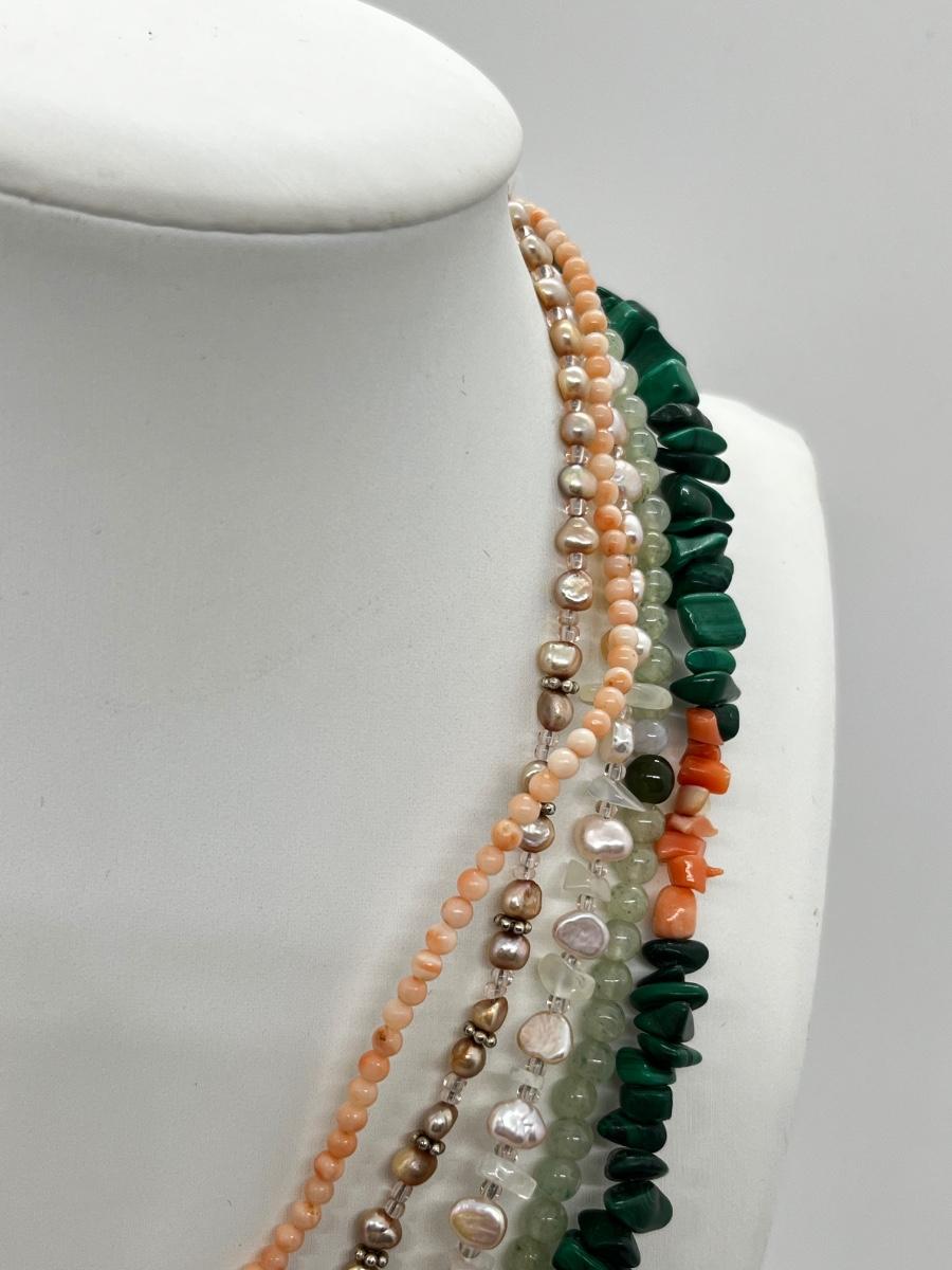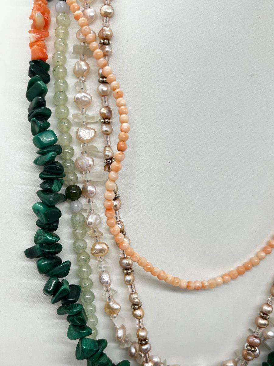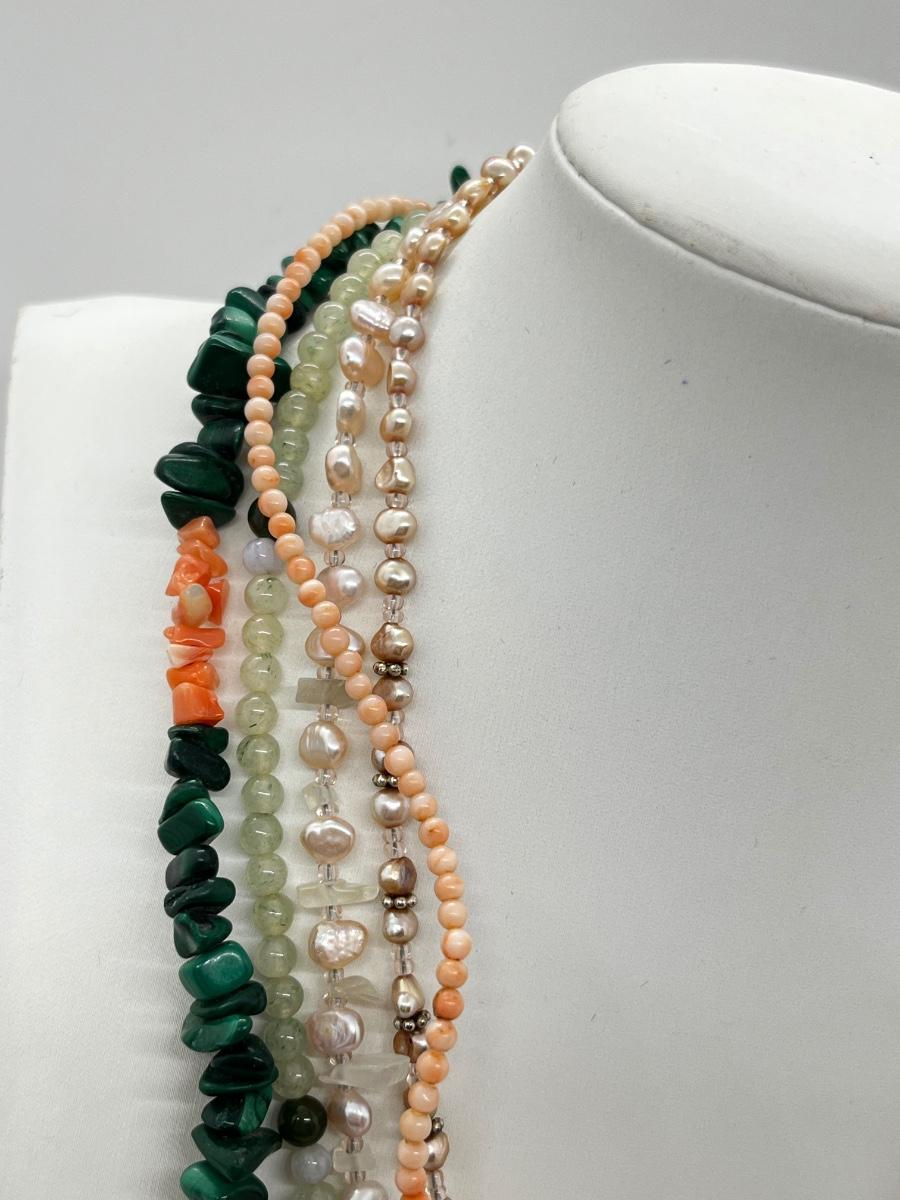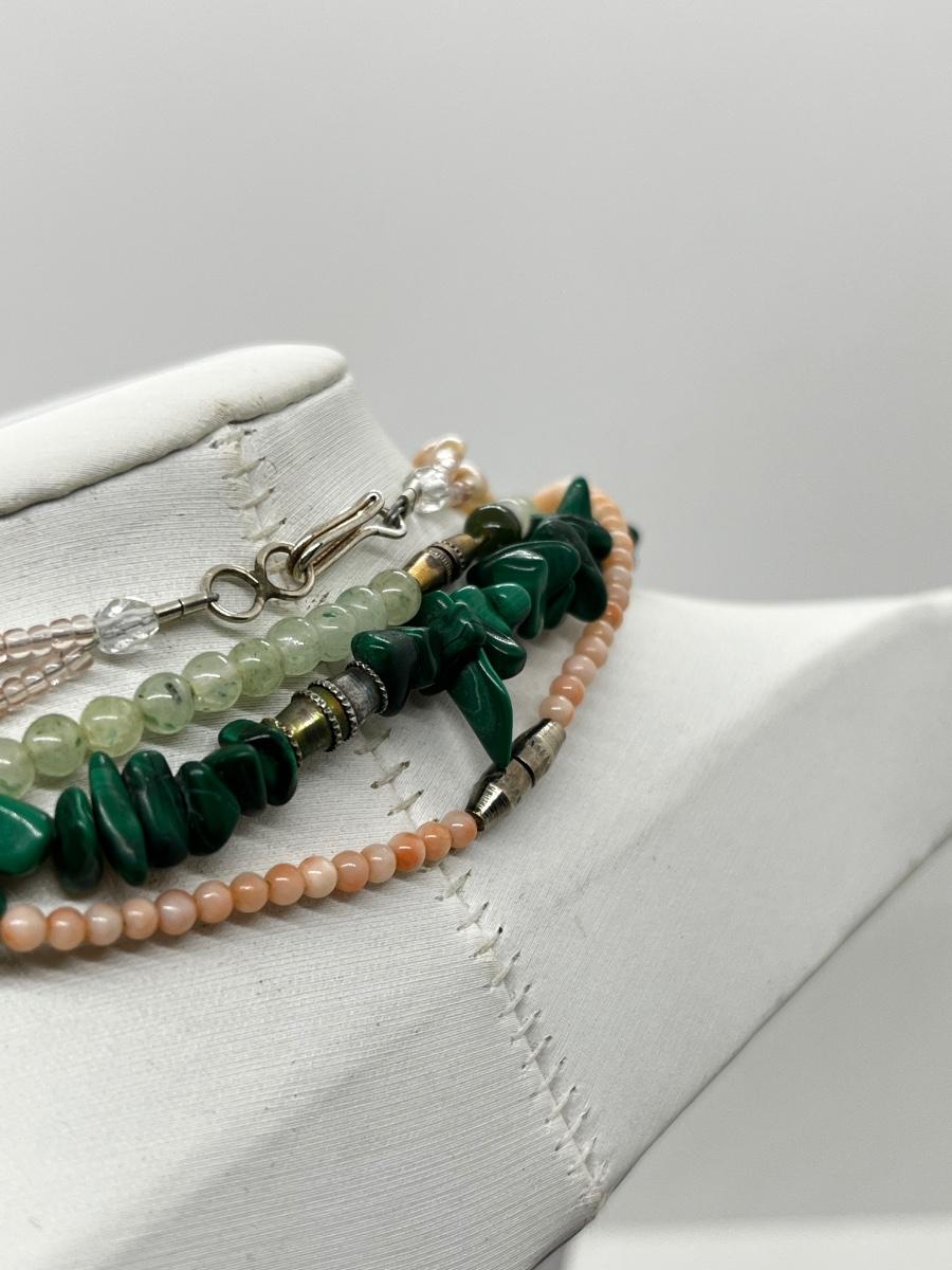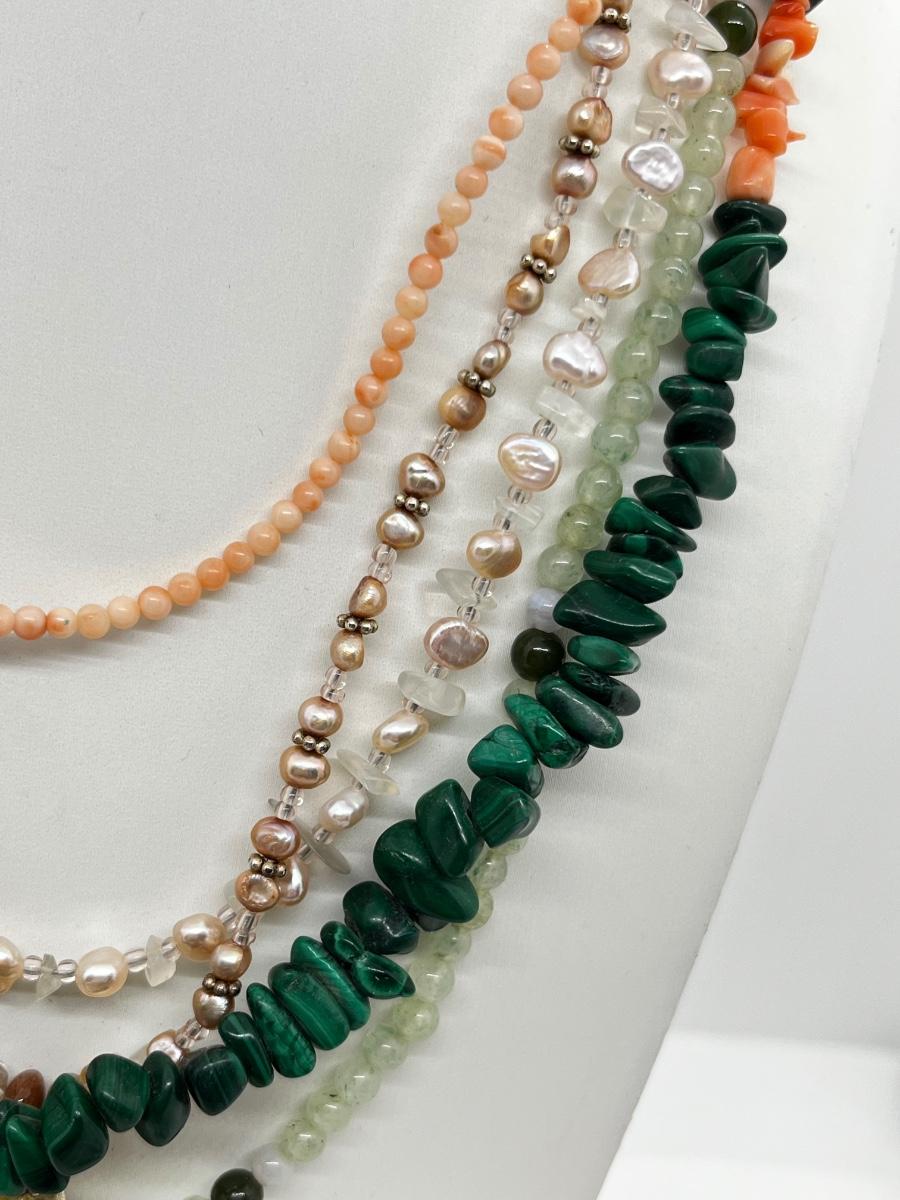 LOT 164: Freshwater Pearl & Quarts 17" Necklace and Matching Earrings, Malachite and Coral 19" Necklace and JAde Bead 19" Necklace