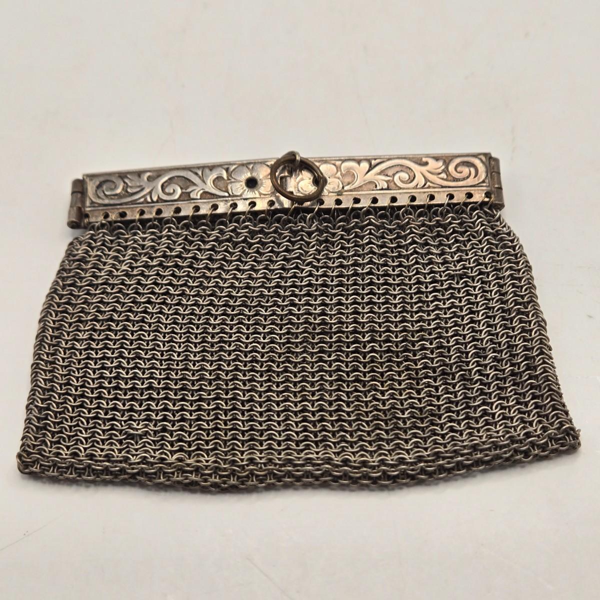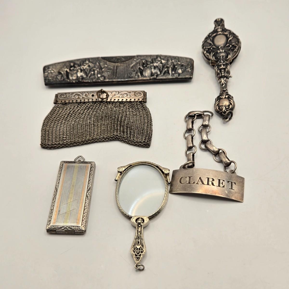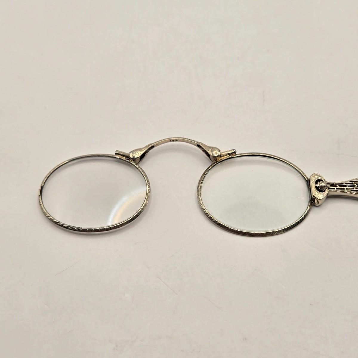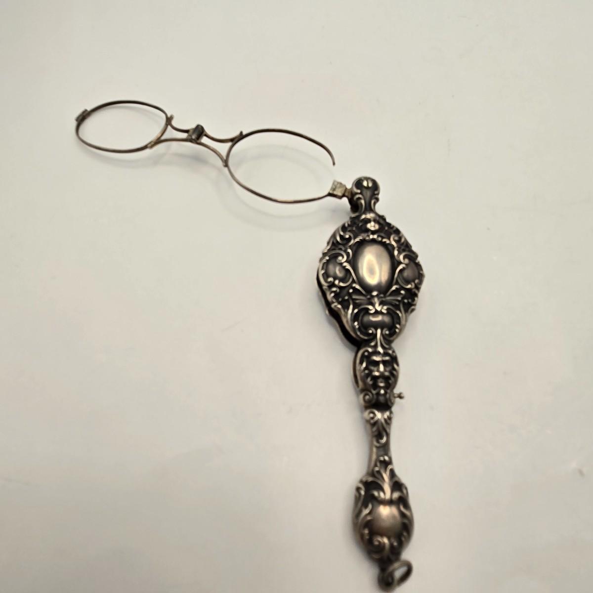 LOT 25: Antique Art Nouveau Silver Toned Lorgnette, Silver Tone Folding Spectacles, Silver Toned Mesh Change Purse, Denmark Silver Plated Repousse Comb Holder w/ Comb and More