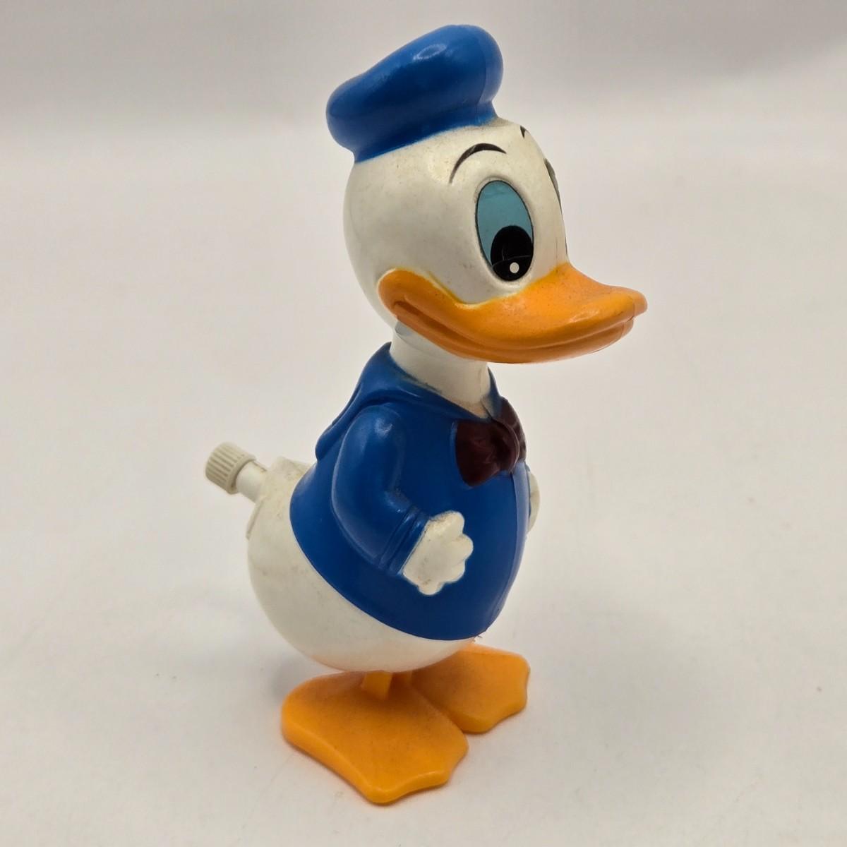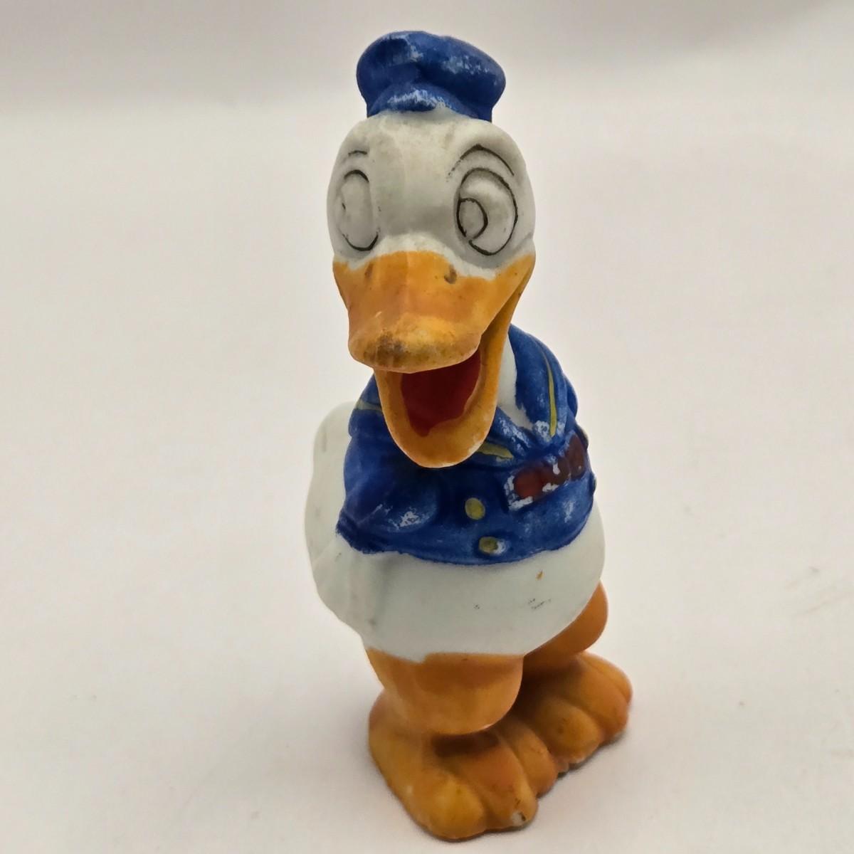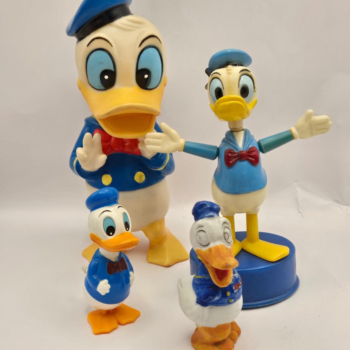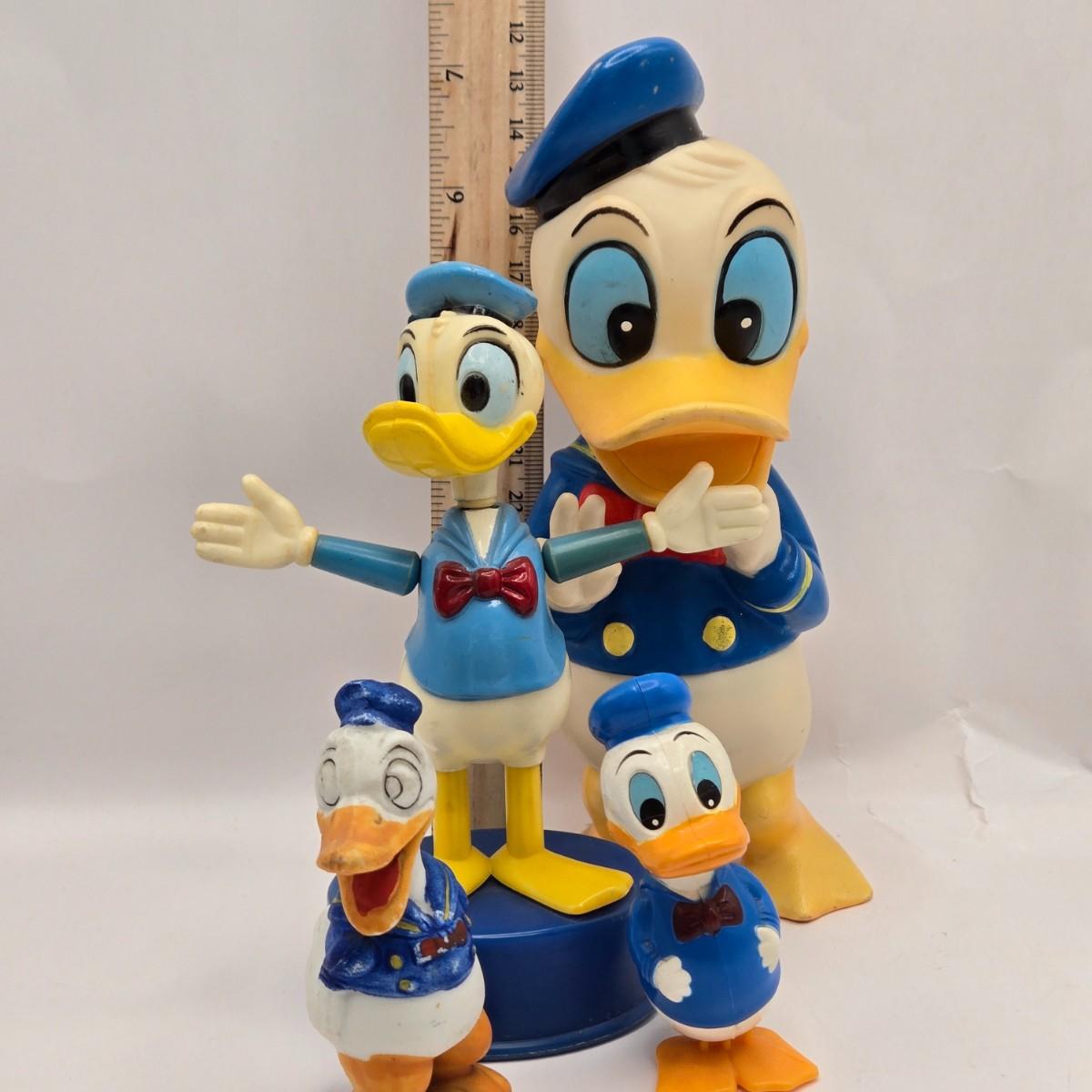 LOT 30: Poor Donald is Always Second Fiddle to Mickey: Vintage Donald Duck Squeak Toy, Kohner Donald Duck Push- Button Toy, Donald Duck Wind-Up Toy, and Bisque Donald Duck Figurine