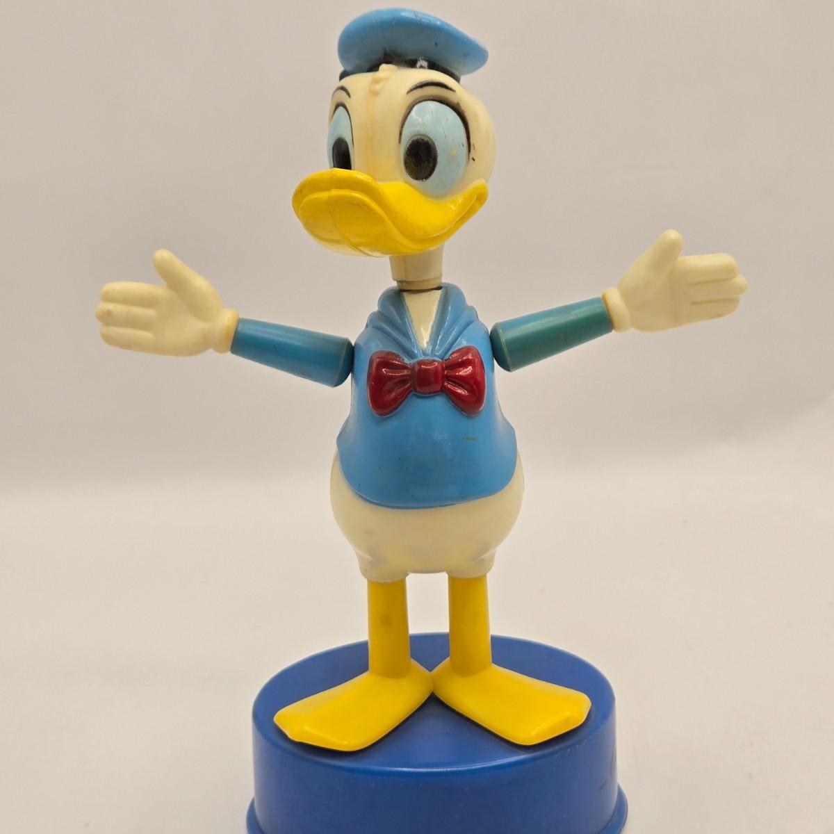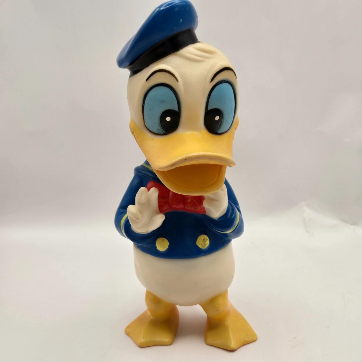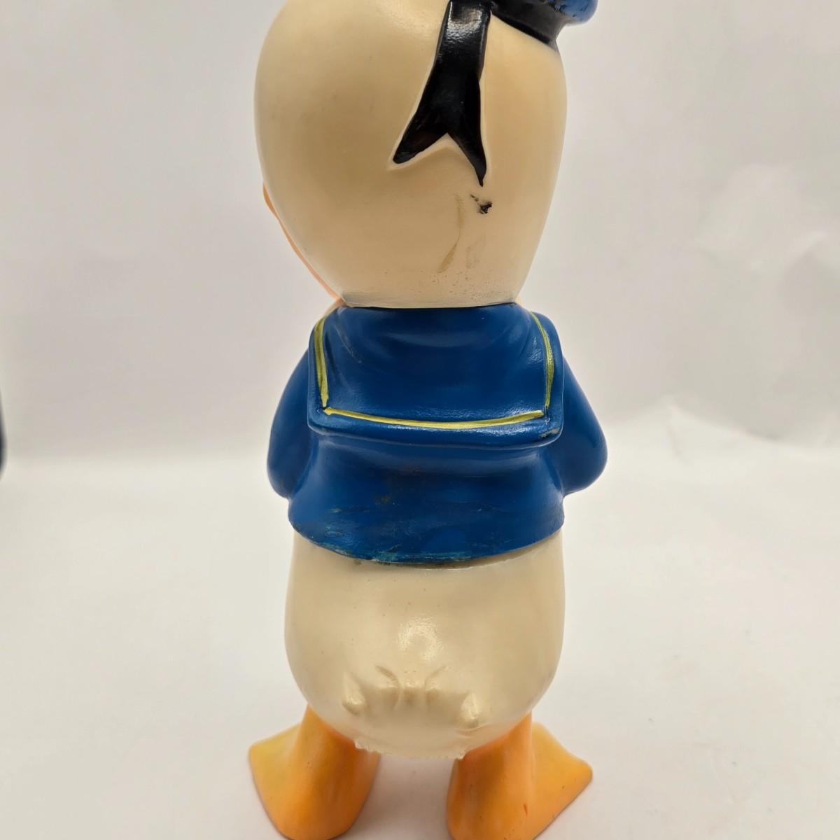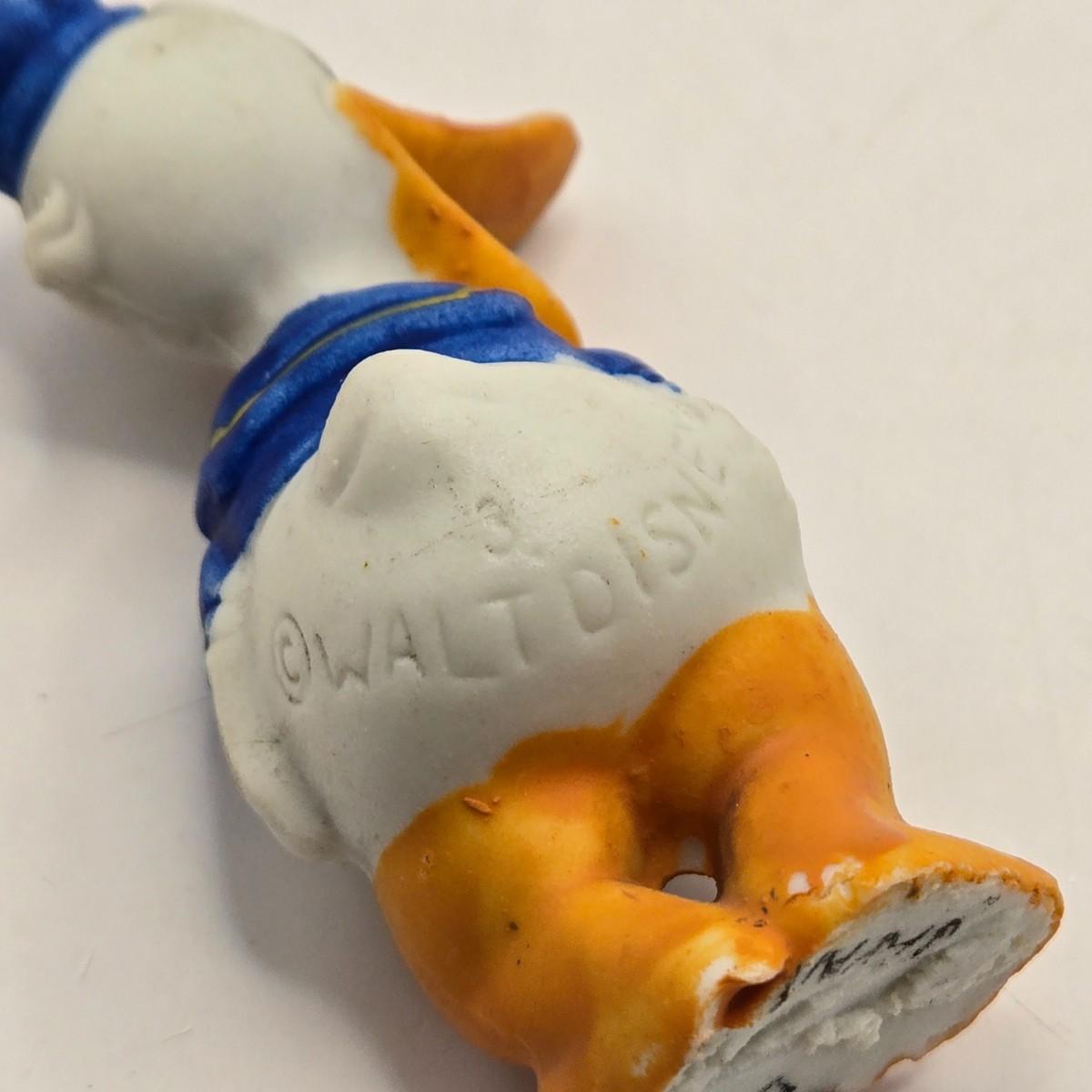 LOT 30: Poor Donald is Always Second Fiddle to Mickey: Vintage Donald Duck Squeak Toy, Kohner Donald Duck Push- Button Toy, Donald Duck Wind-Up Toy, and Bisque Donald Duck Figurine