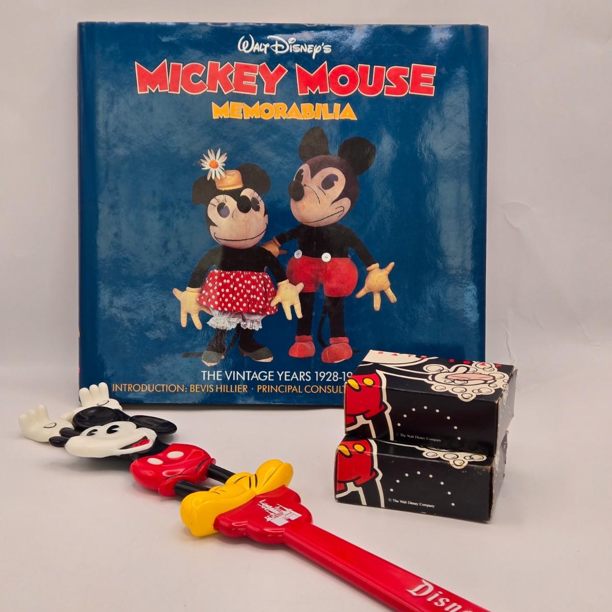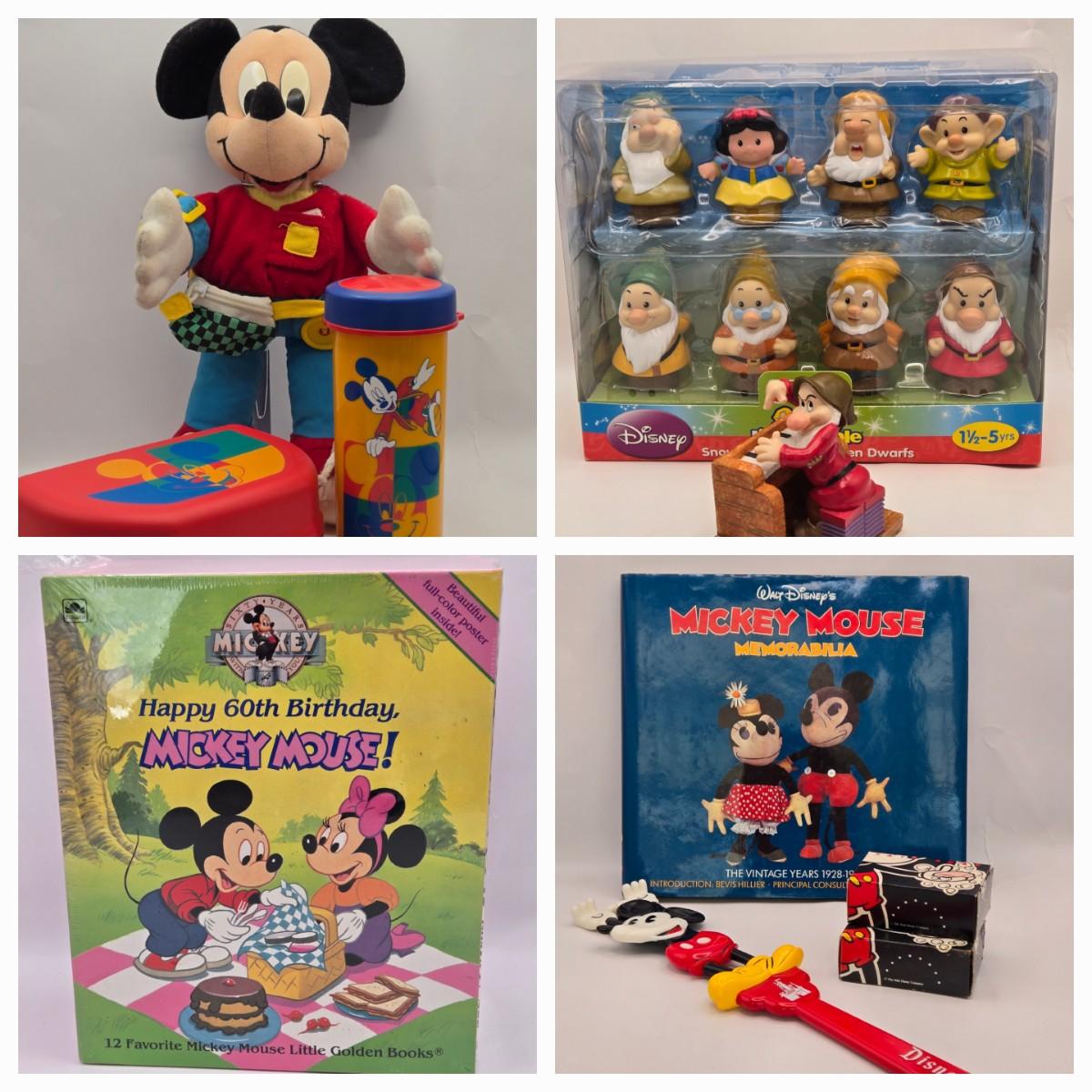 LOT 34: Vintage "Learn to Dress' Mickey Mouse, Lunch Set, NIB Snow White & the 7 Dwarfs, New Set of Books for Mickey's 60th, Memorabilia Book, Back Scratcher, and 2 Bars of Soap from W.D. Resort
