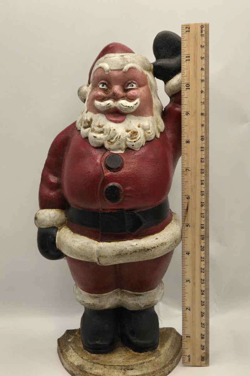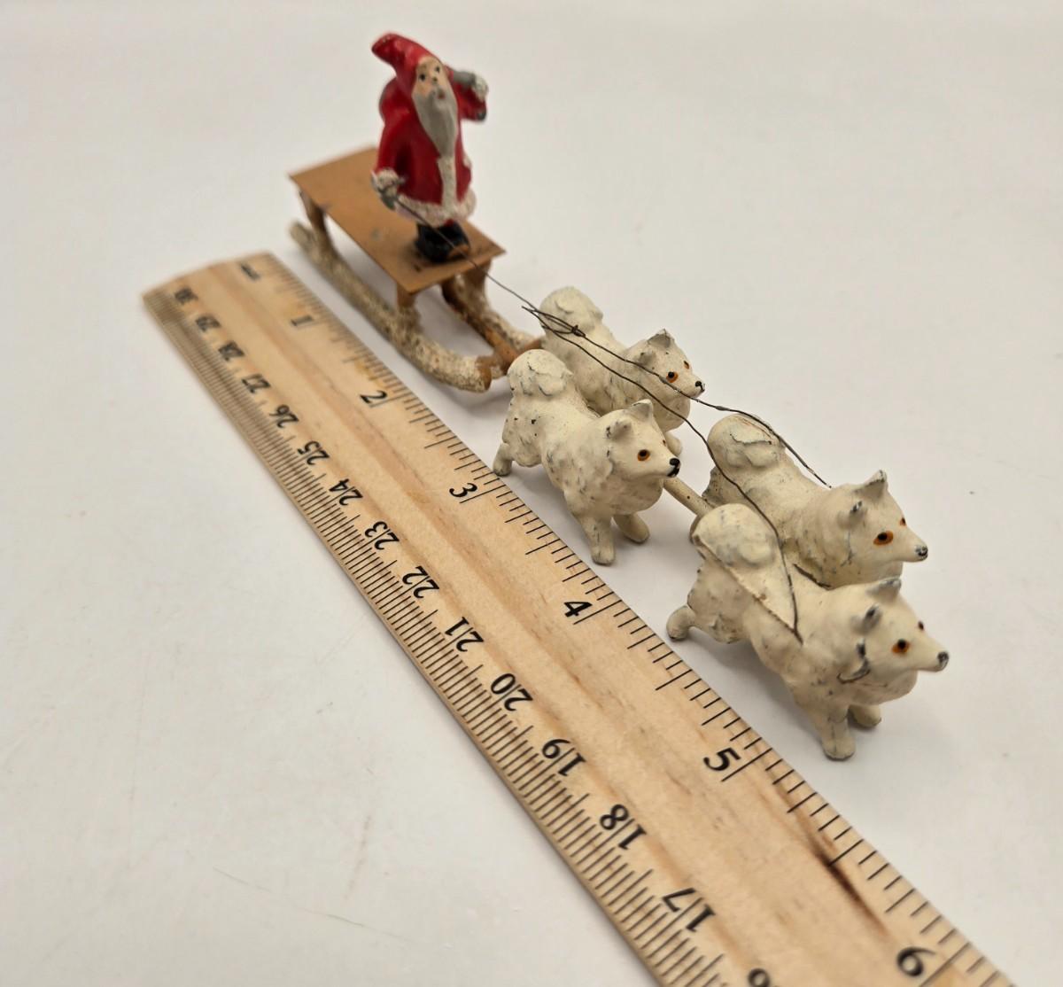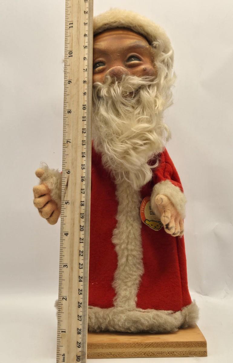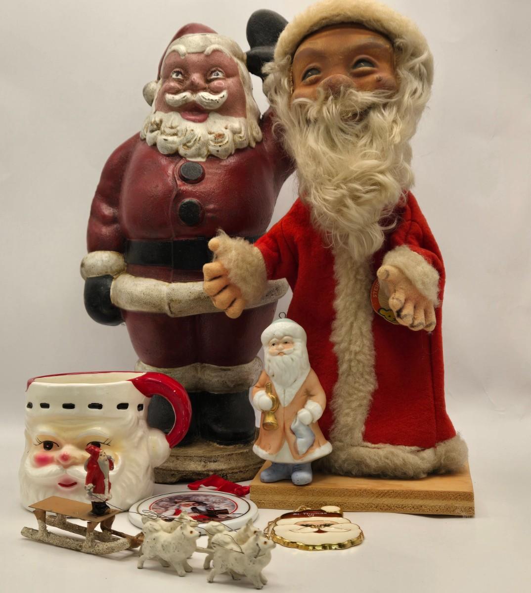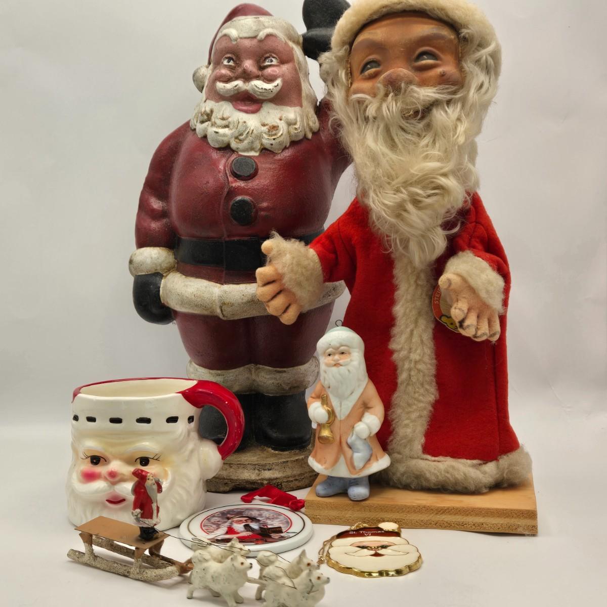 LOT 36: Vintage Cast Iron Santa Door Stop, Steiff Santa Hand Puppet, Putz Germany Santa Sleigh, Ceramic Santa & JC Penny Ornaments, and Santa Ornament from St. Thomas