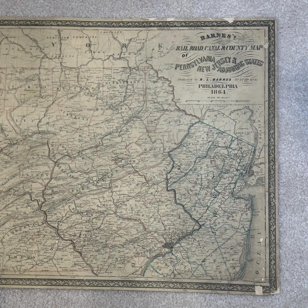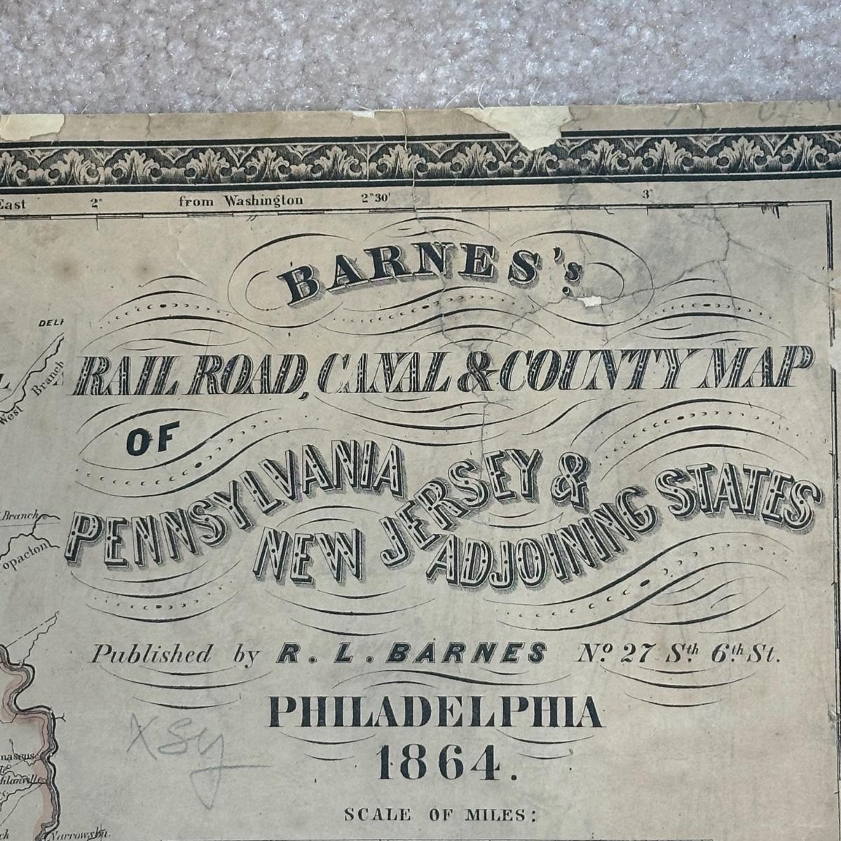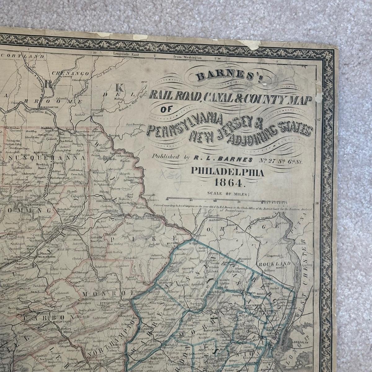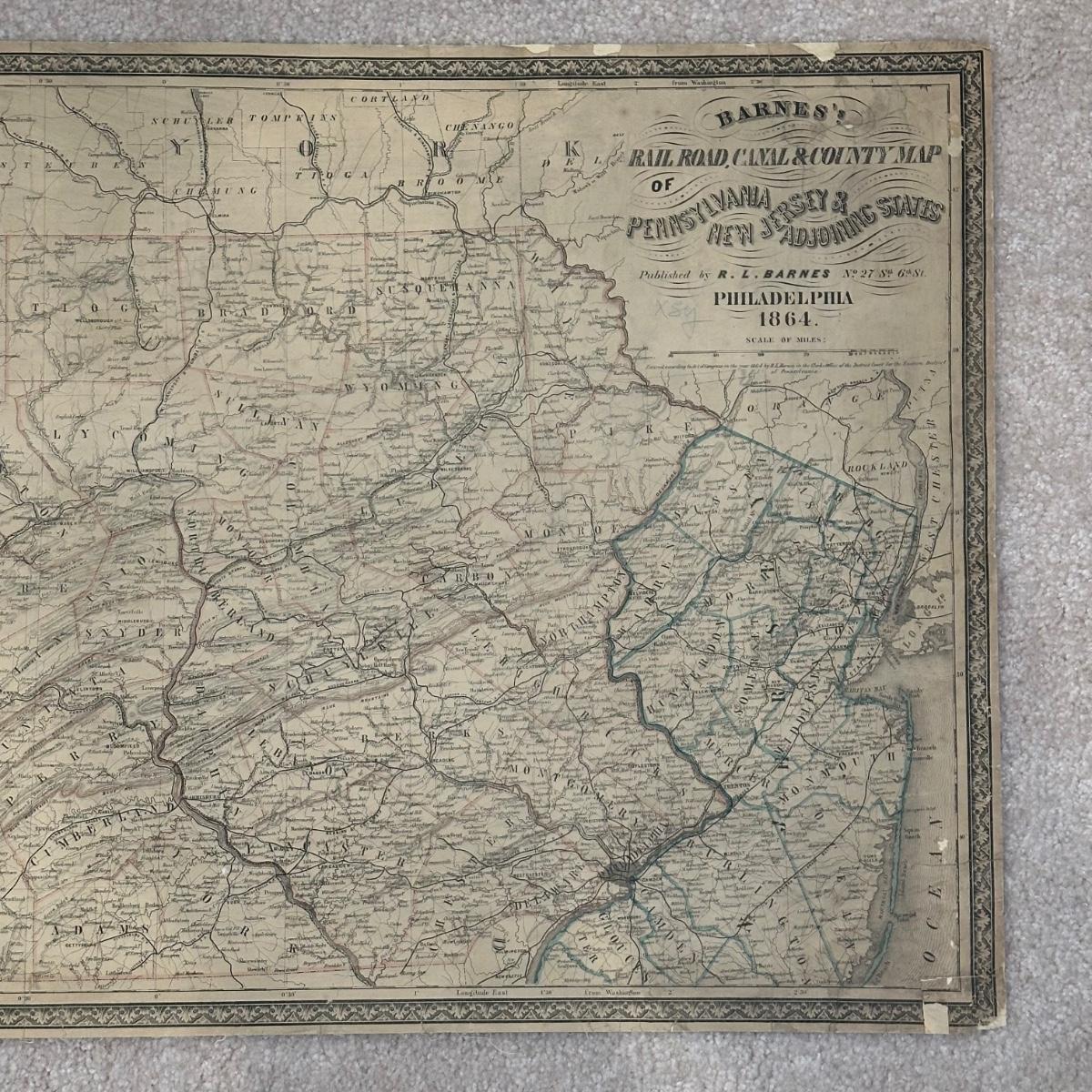 LOT 67: Antique 1864 Railroad Canal & County Map of Pennsylvania New Jersey & Adjoining States