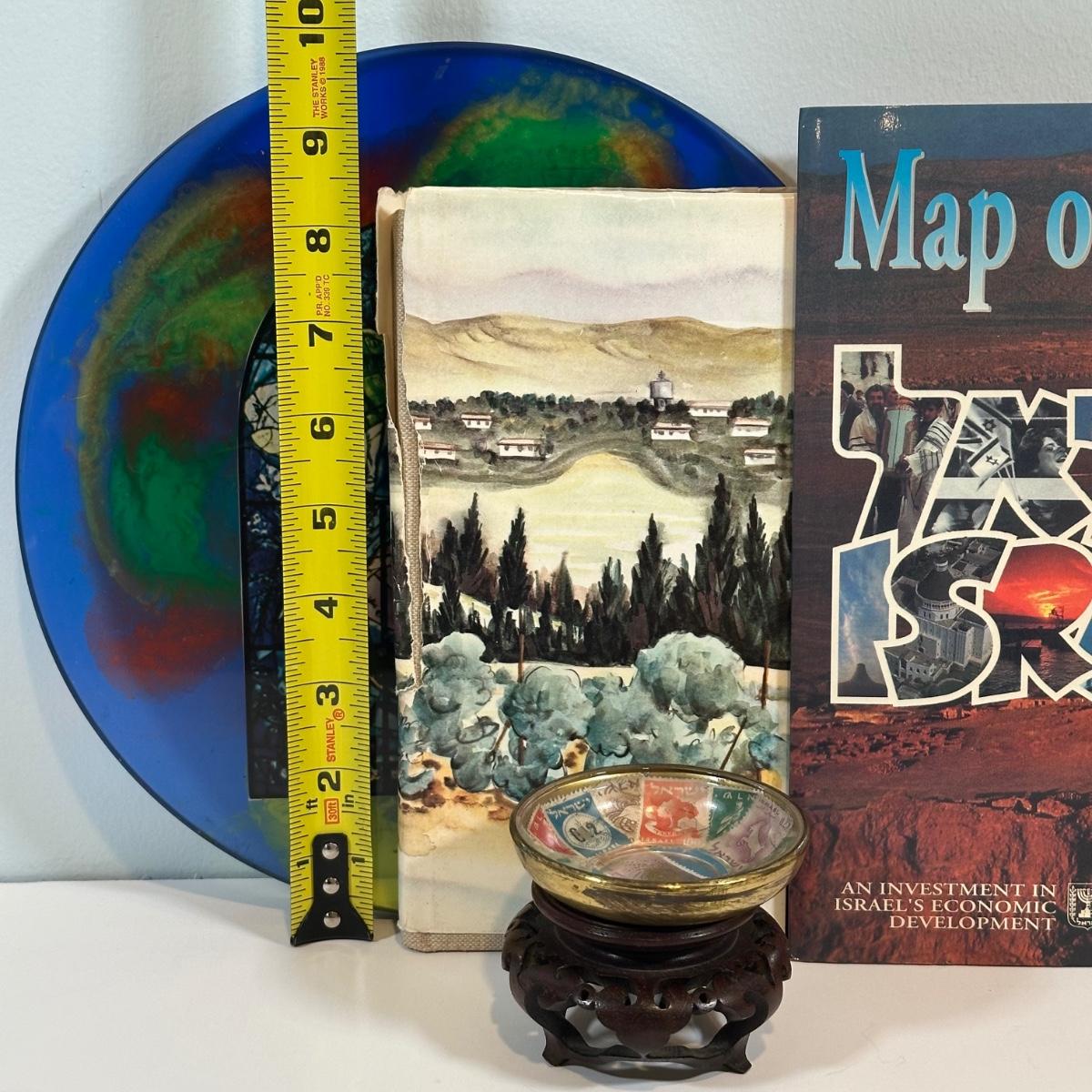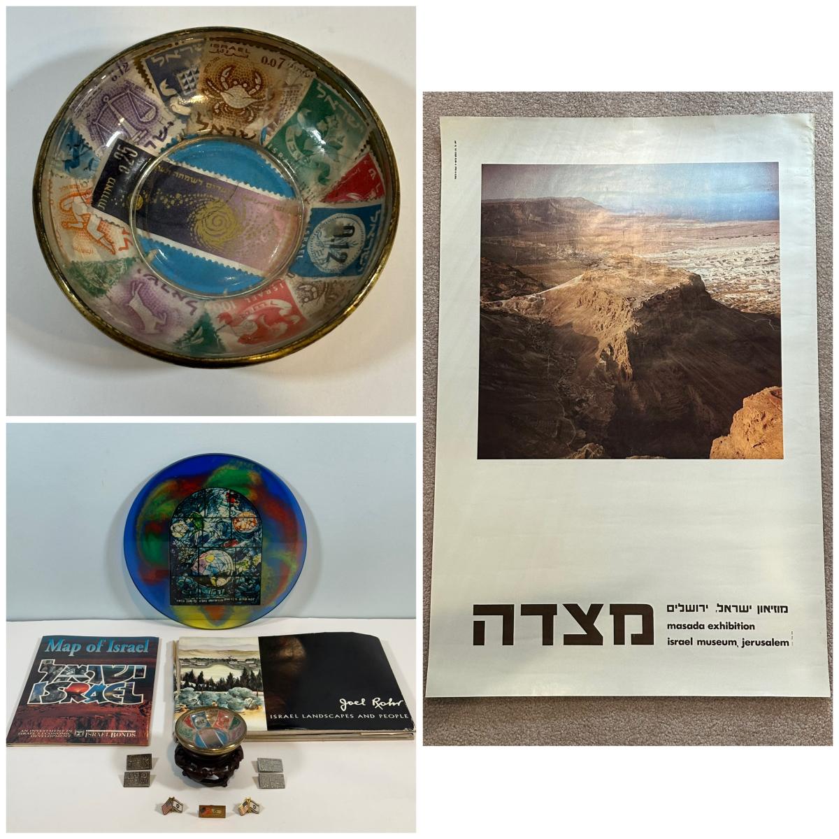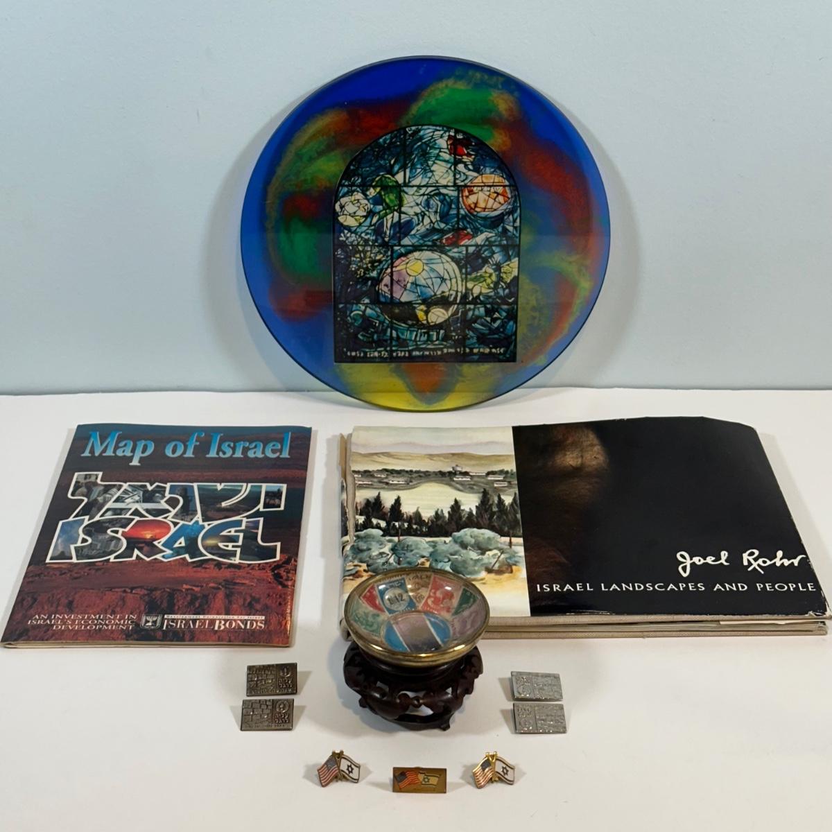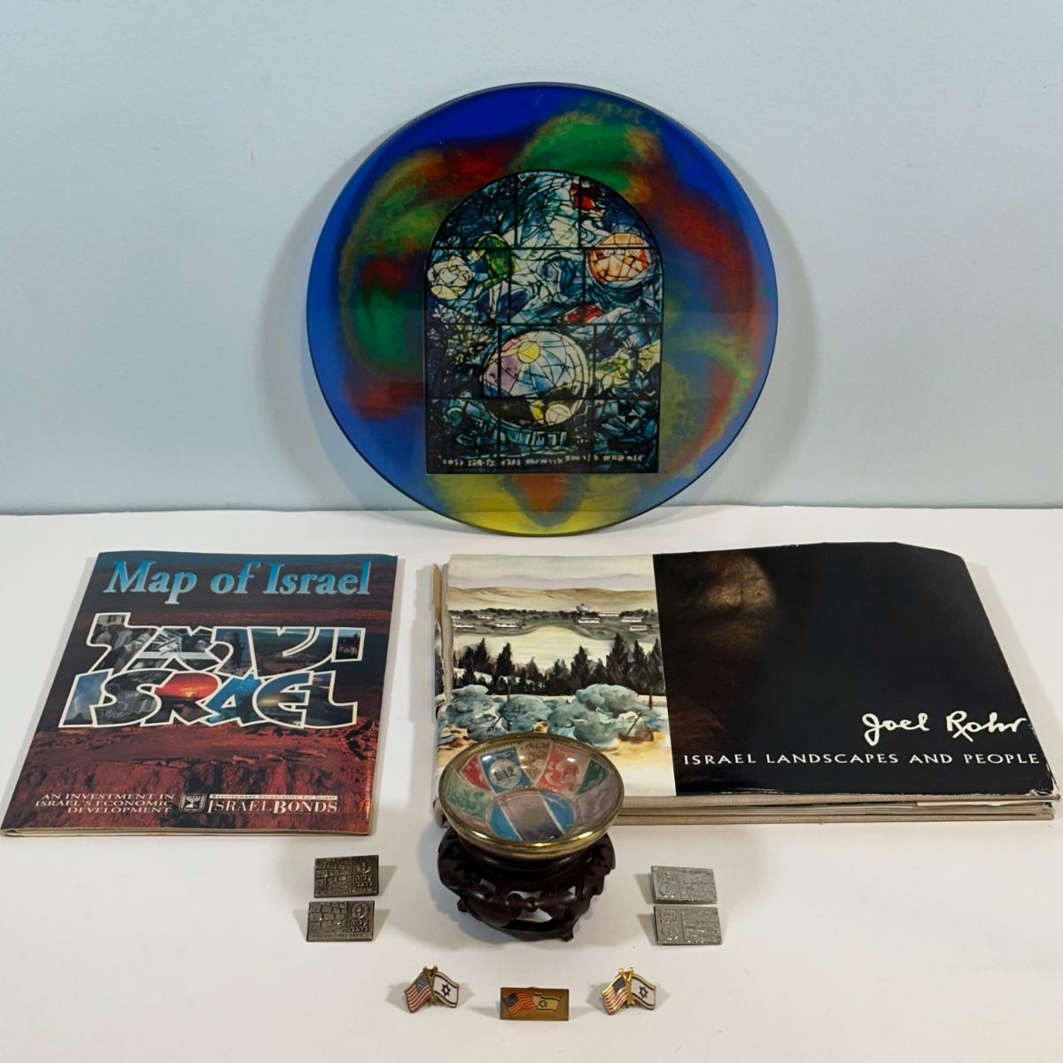 LOT 77: Israel Lucite Stained Glass Window, Israeli Stamp Brass Trinket Dish & More