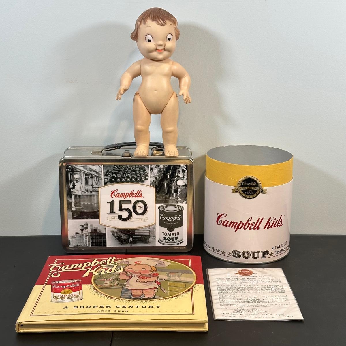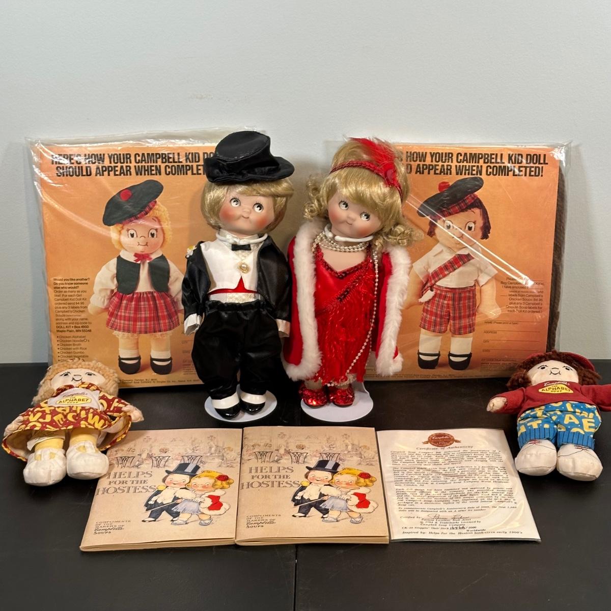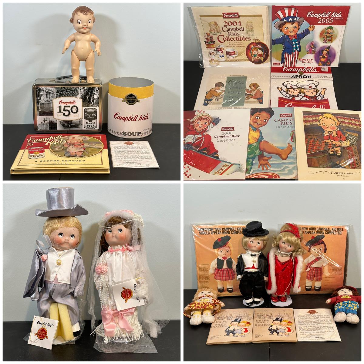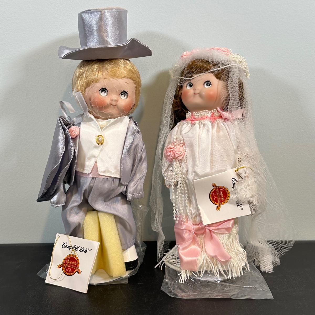 LOT 85: Vintage Campbell’s Soup Collectibles Campbell Kid Dolls NIP, Lunchbox & Thermos, Campbell's Kids Bride & Groom Porcelain Dolls & More