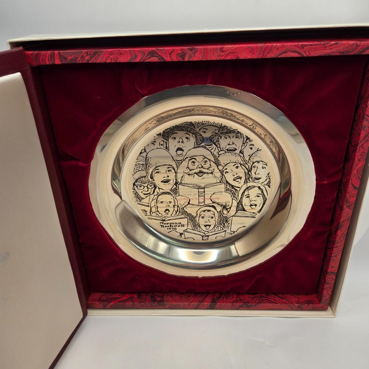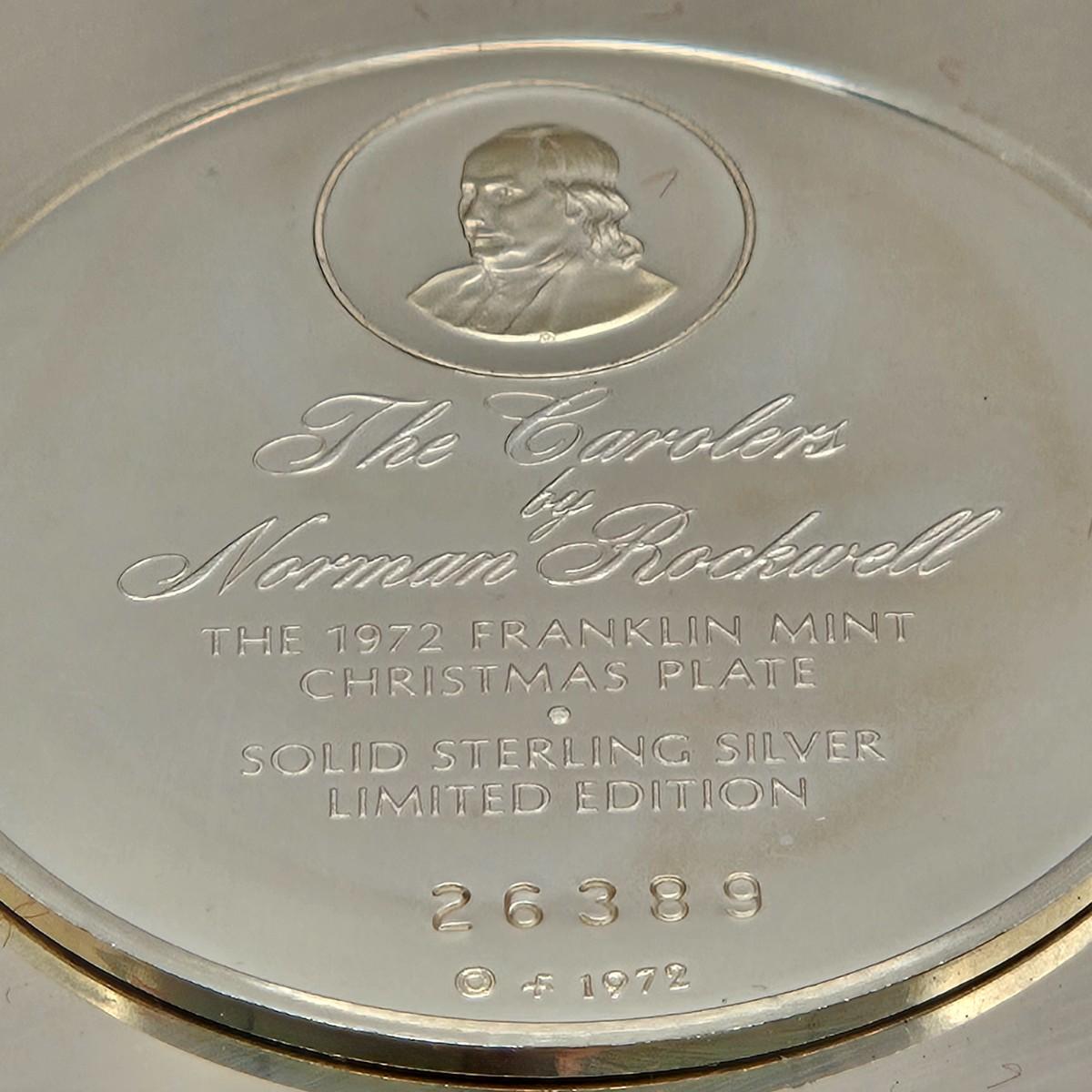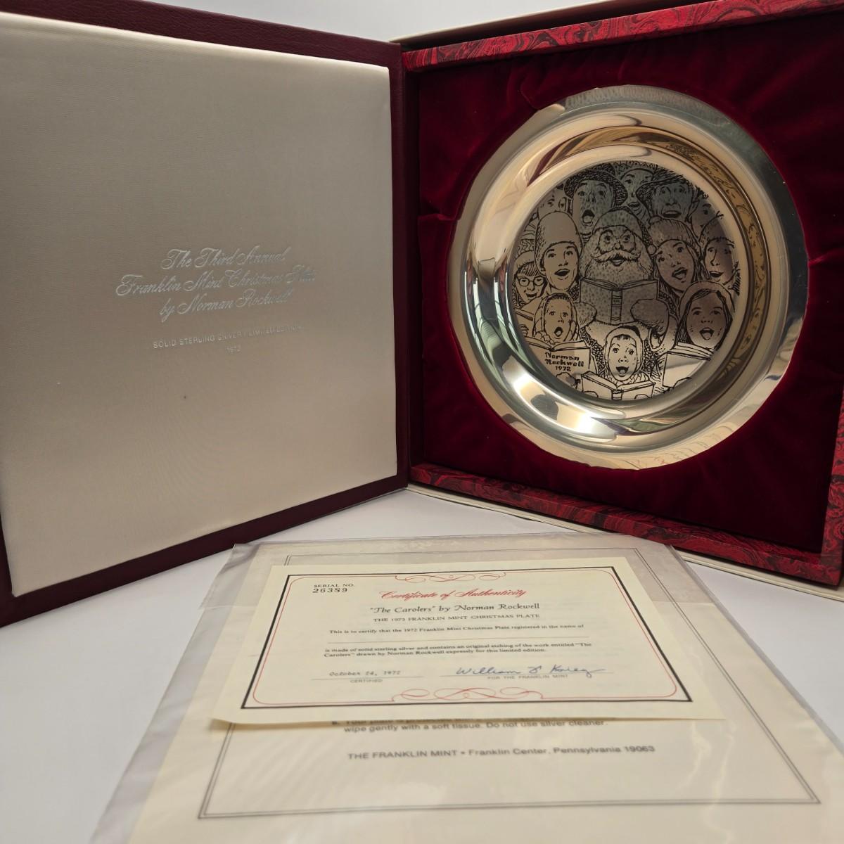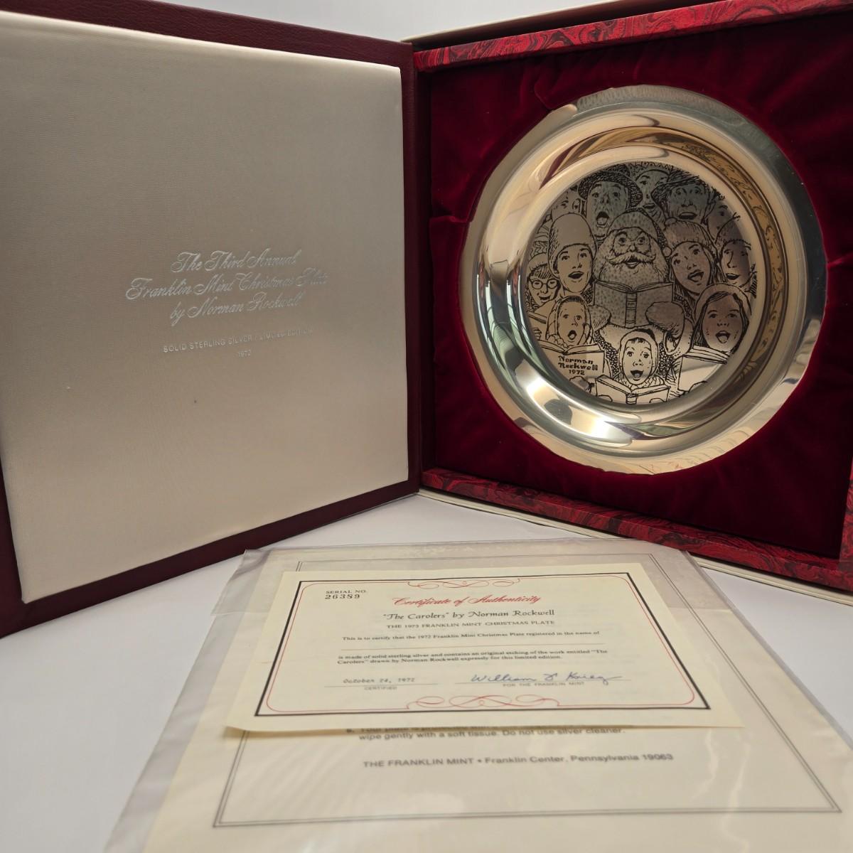 LOT 173: 1972 Franklin Mint "The Carolers" by Norman Rockwell Sterling Silver Christmas Plate w/ COA (216.7 Grams)