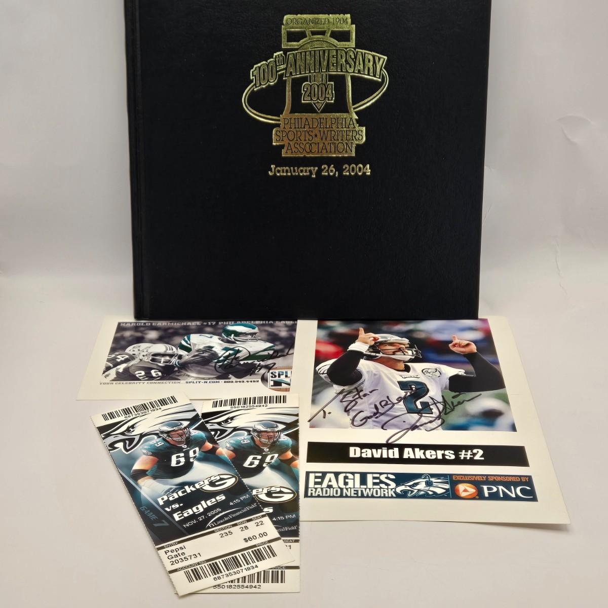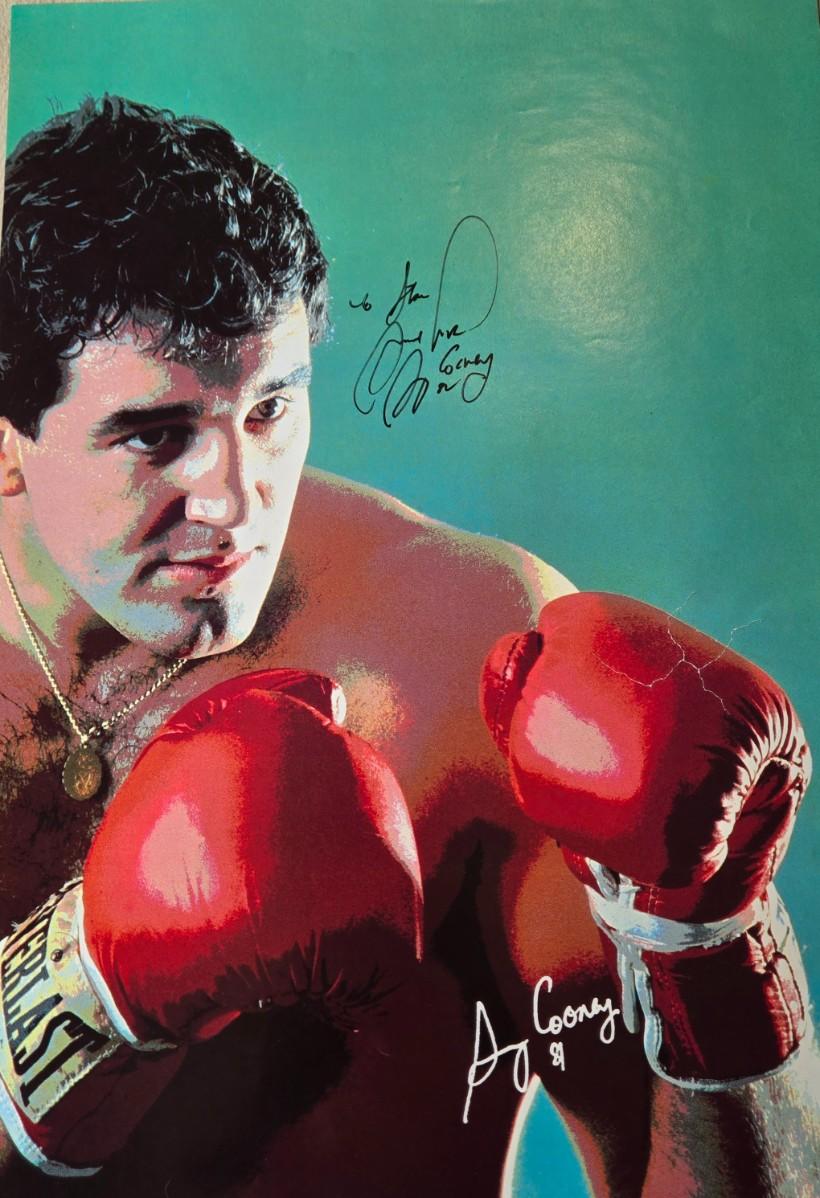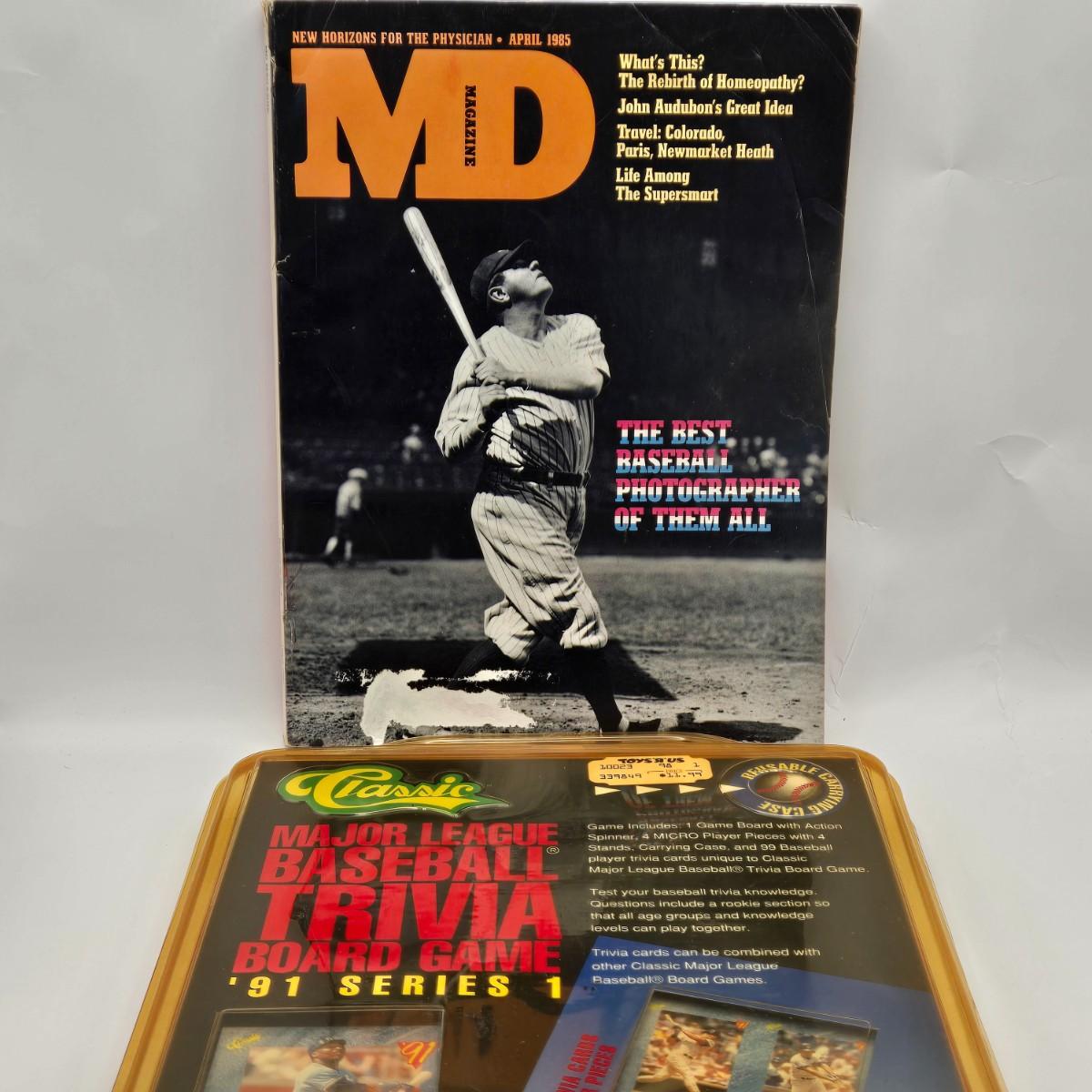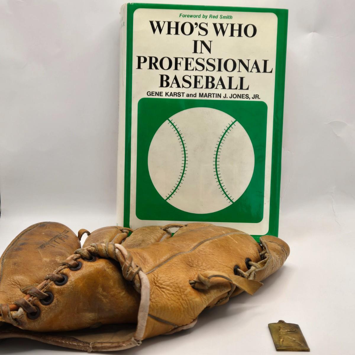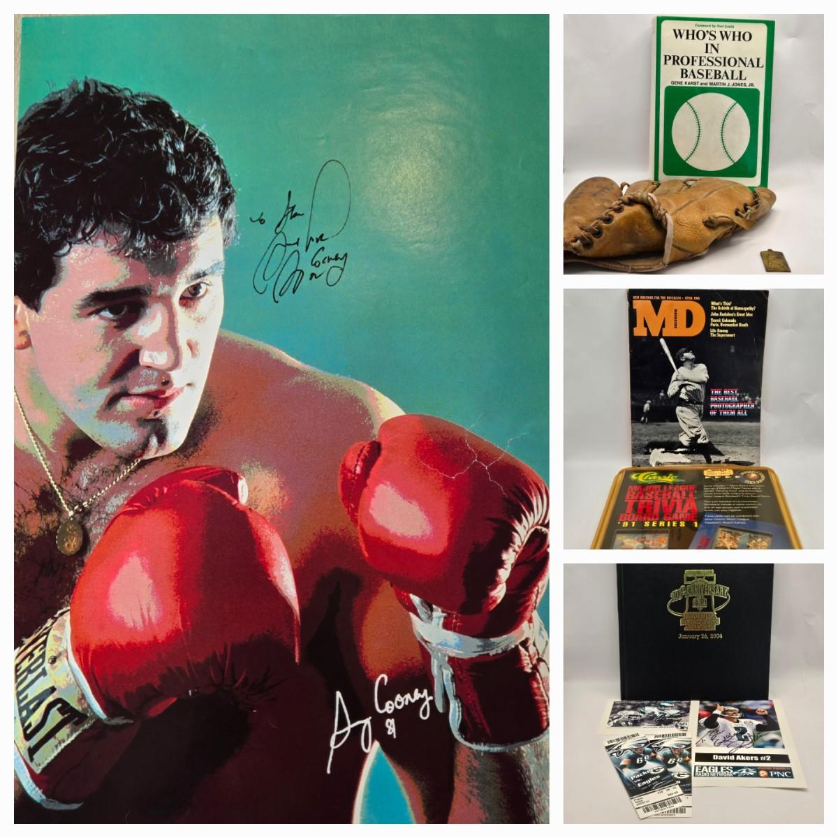LOT 175: Signed Gerry Cooney Poster, Vintage Baseball Glove, Baseball Pendant, April 1985 MD Magazine, Baseball Trivia Game, 100th Anniversary of PSWA Book, & Akers & Carmichael Signed Cards and More!