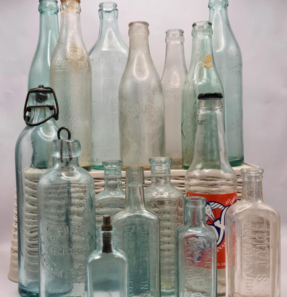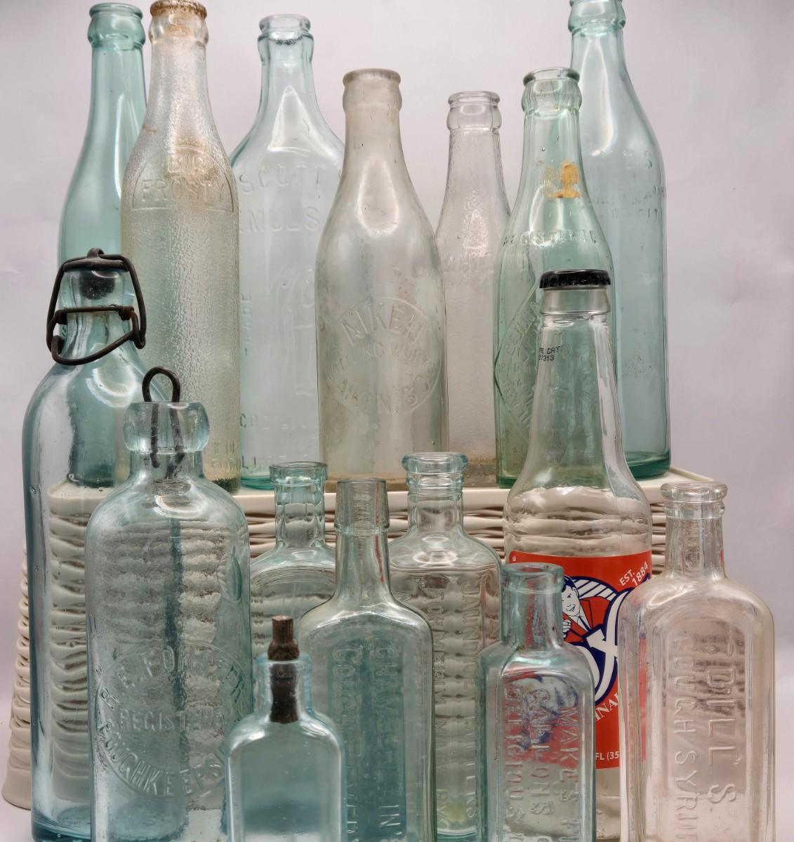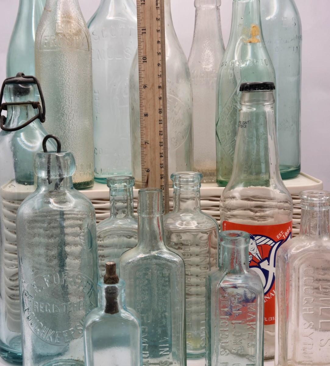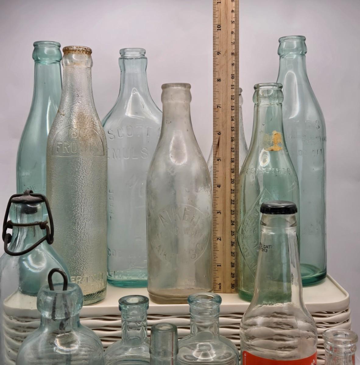 LOT 183: Multiple Vintage Glass Bottles Including Whistle, Scott's Emulsion, Hires, Big Frosty, and Many More