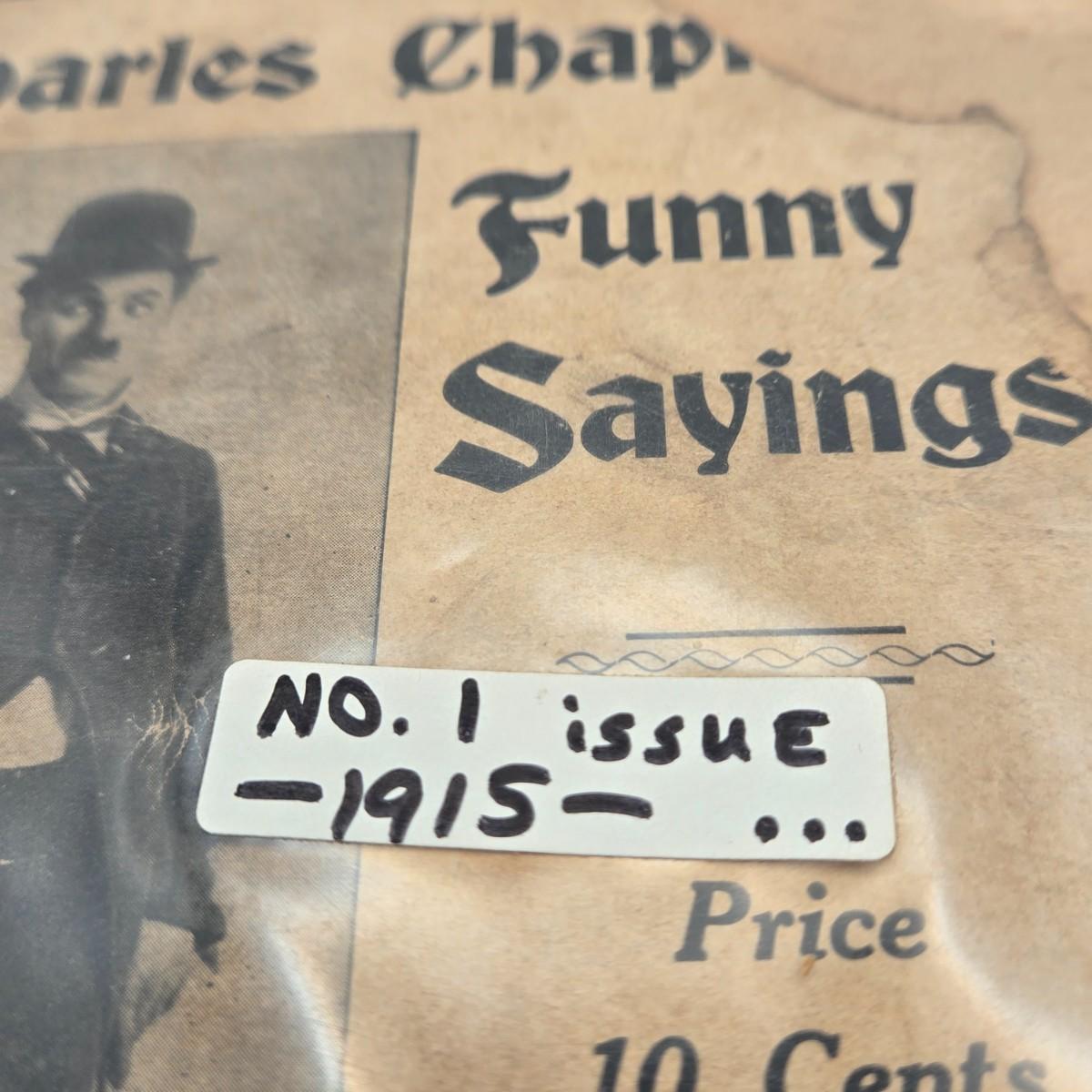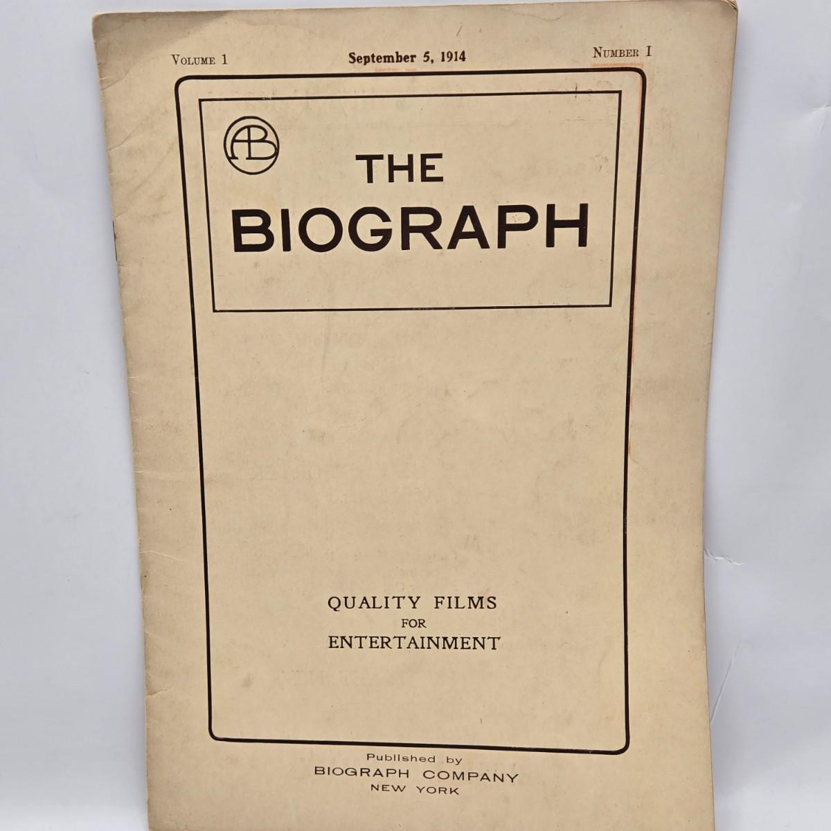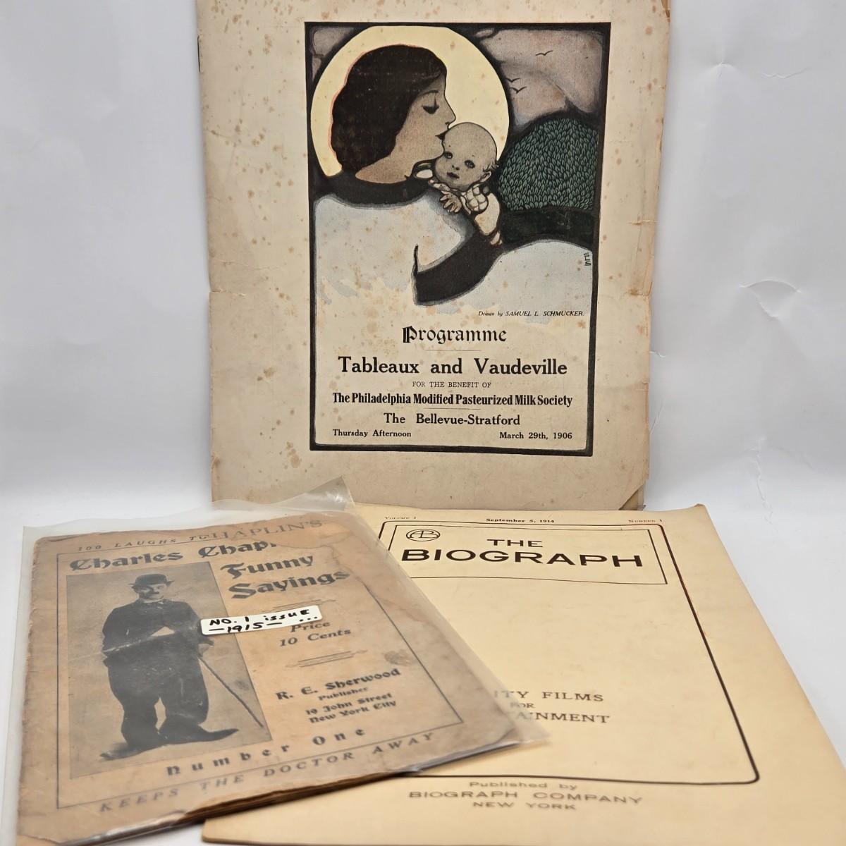 LOT 187: Antique 1906 Program from the Bellevue Stratford, The Biograph September 5, 1914 Volume 1 Number 1 and Charlie Chaplin Funny Sayings Number 1 Issue from 1915