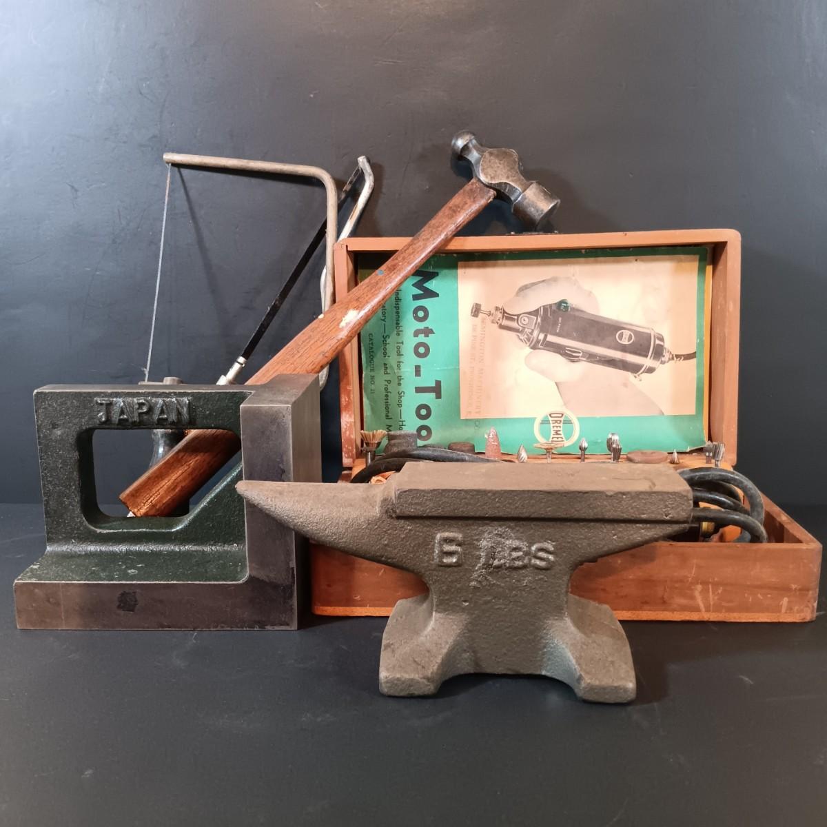 LOT 275: Right Angle Iron (4"x5"x3-3/4"), 6lbs Anvil, Vintage Dremel Moto-Tool & More