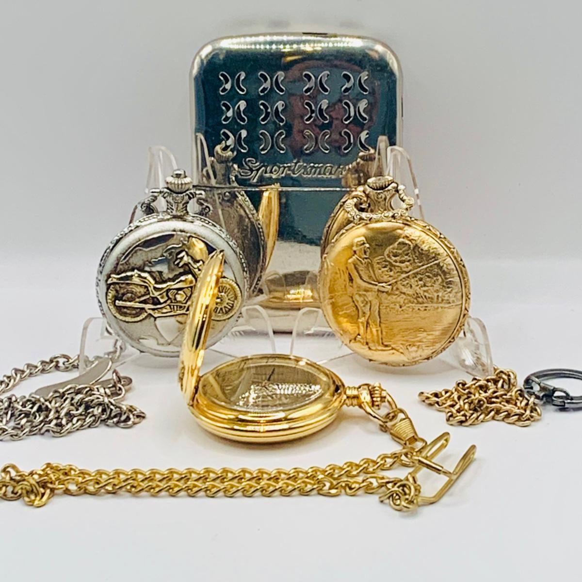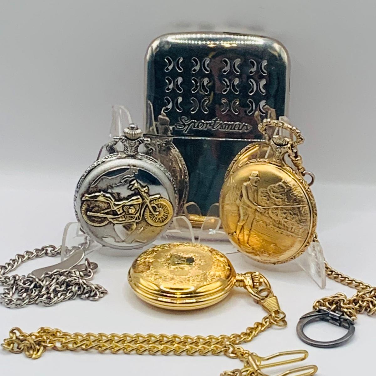 LOT 300: Collection of Vintage Pockets Watches by Benus, Rene Pavot, & Majestron and Vintage Large Sportsman Lighter from Japan