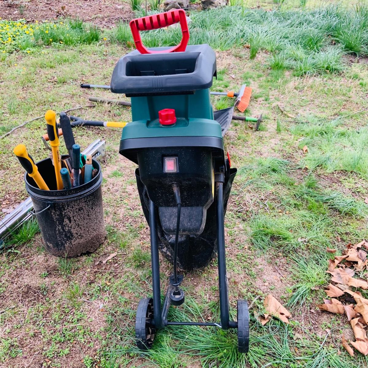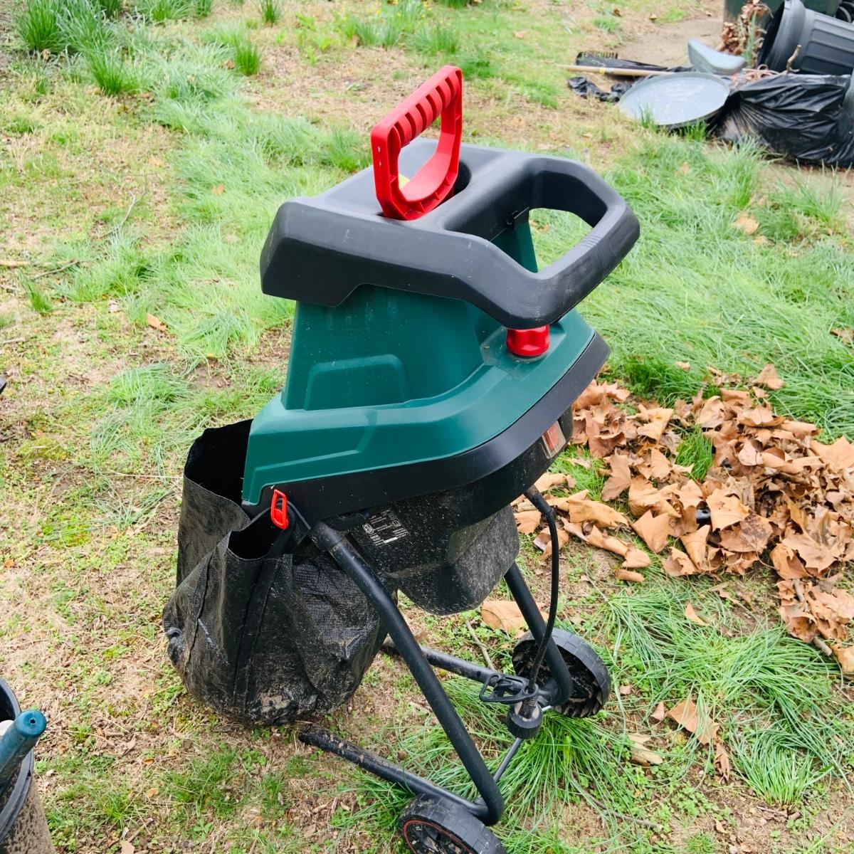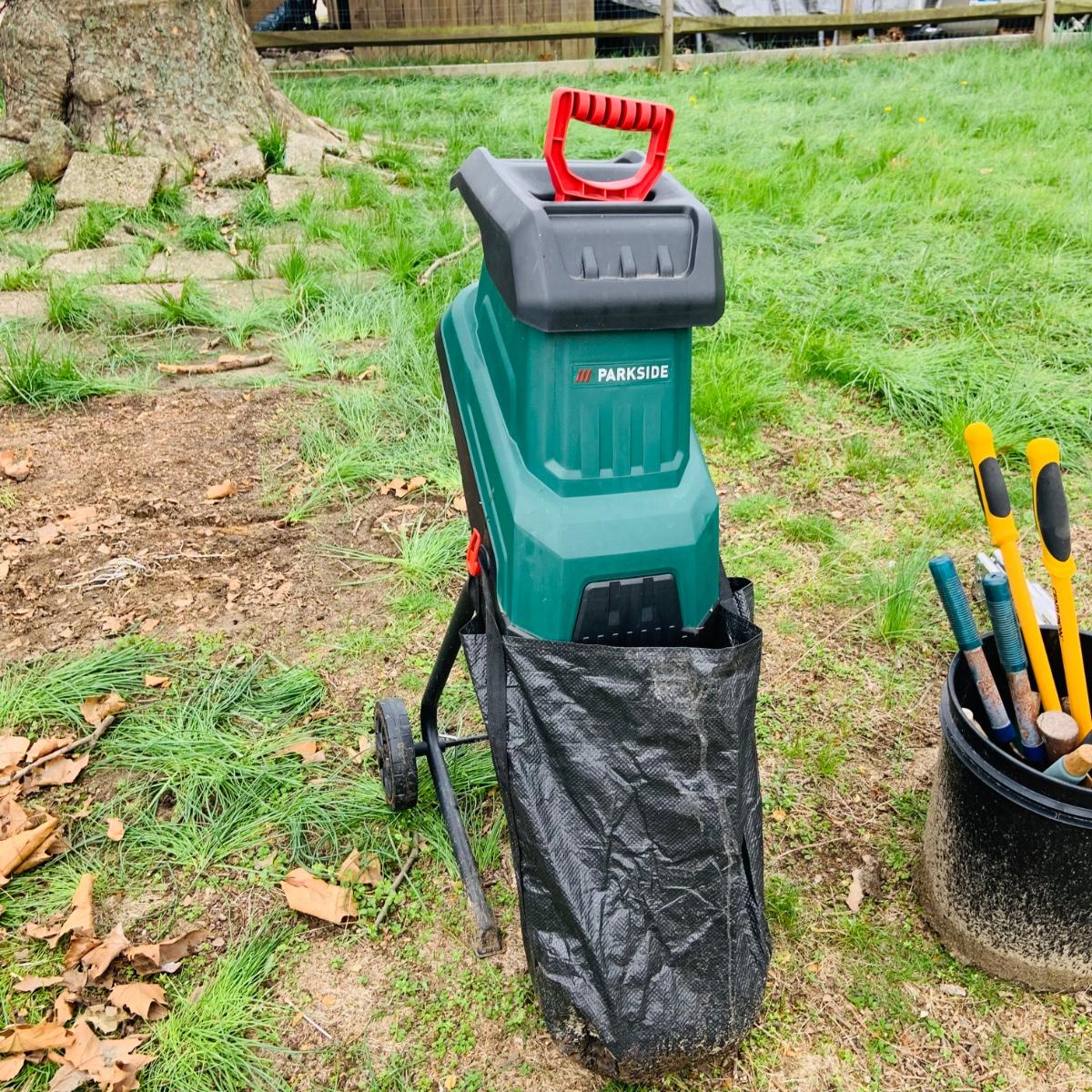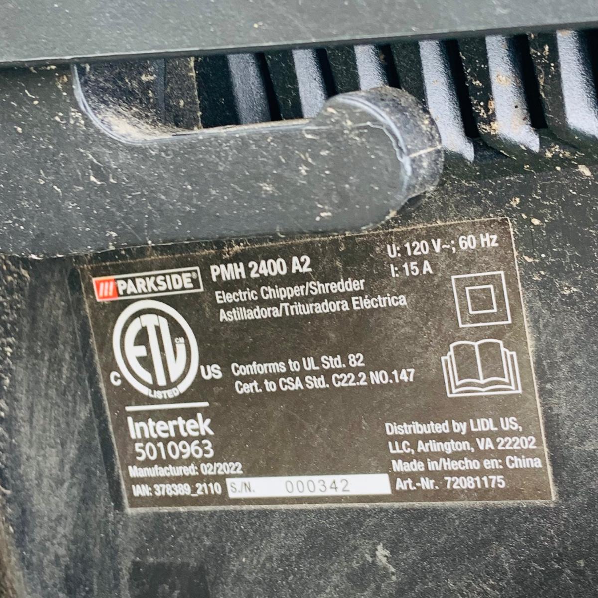 LOT 321: Lawn Care Tool and Supplies Including a Parkside Model PMH 2400 A2 Electric Chipper/Shredder, Metal Trash Can with Lid Tools and More
