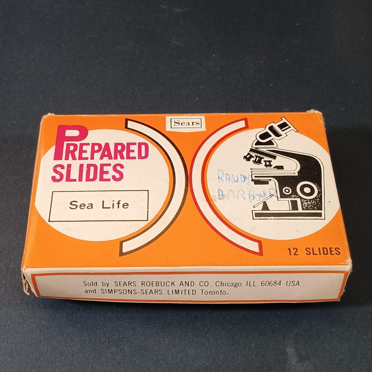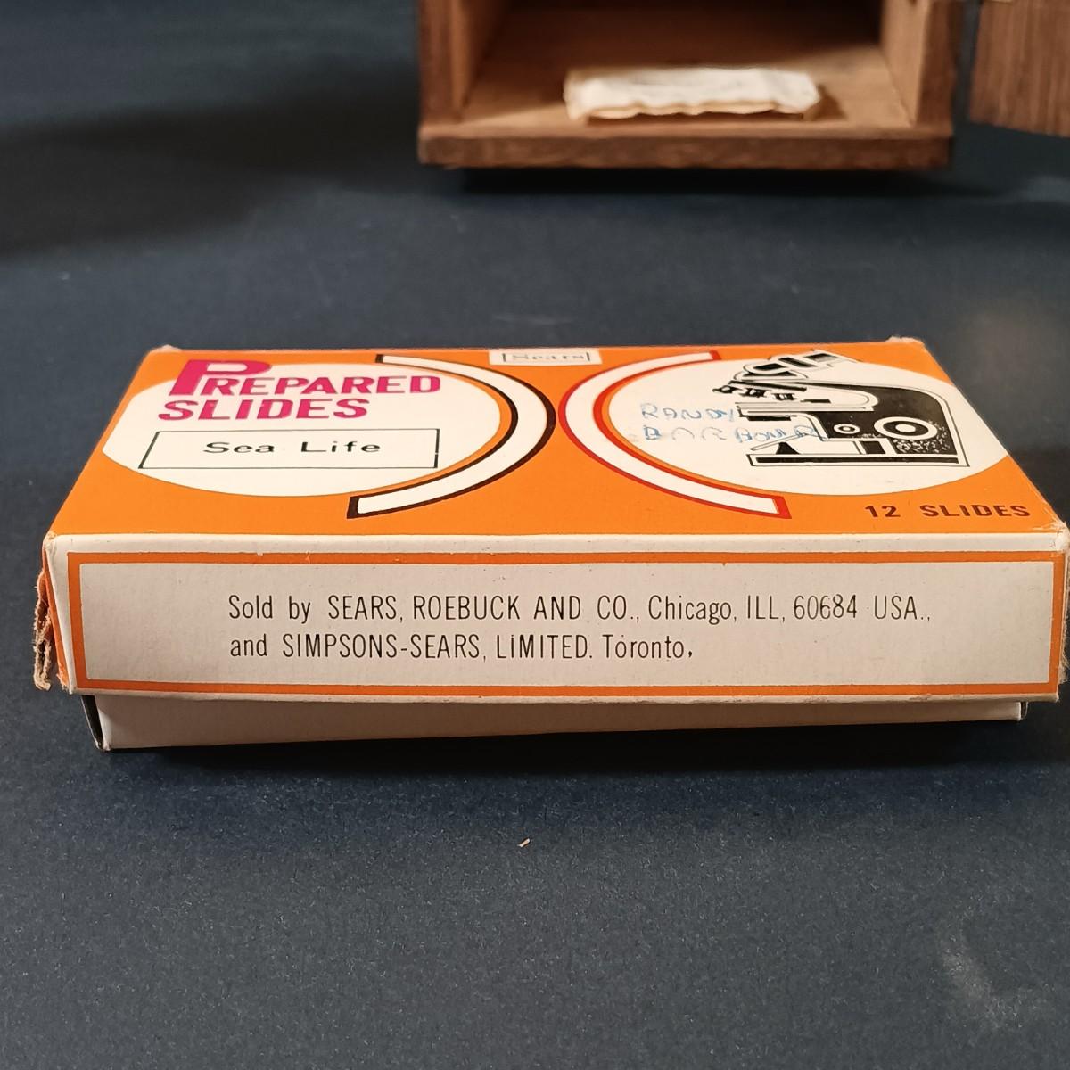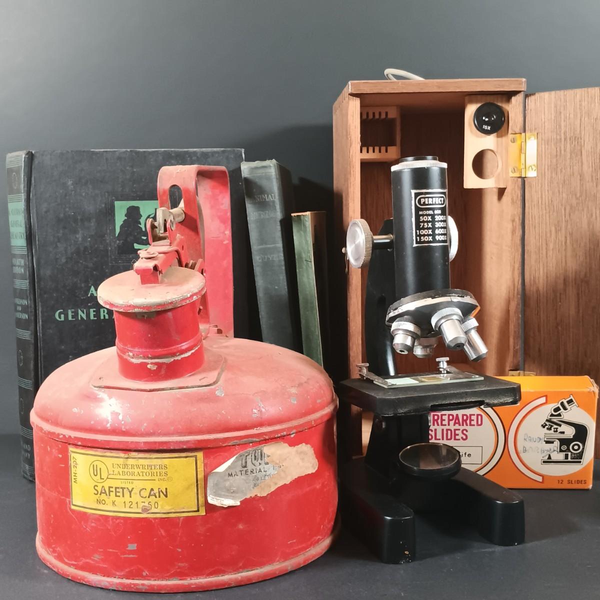 LOT 349: Vintage Perfect Model 805 Microscope w/ Sears Sea Life Slide Set, Underwriters Lab. Safety Can & Books