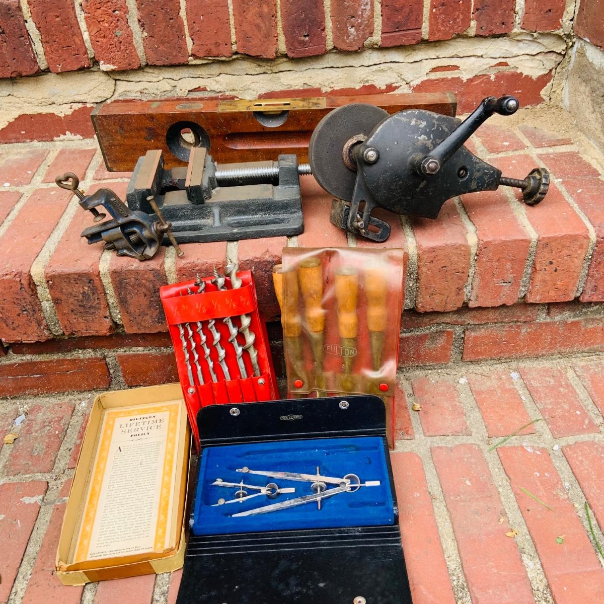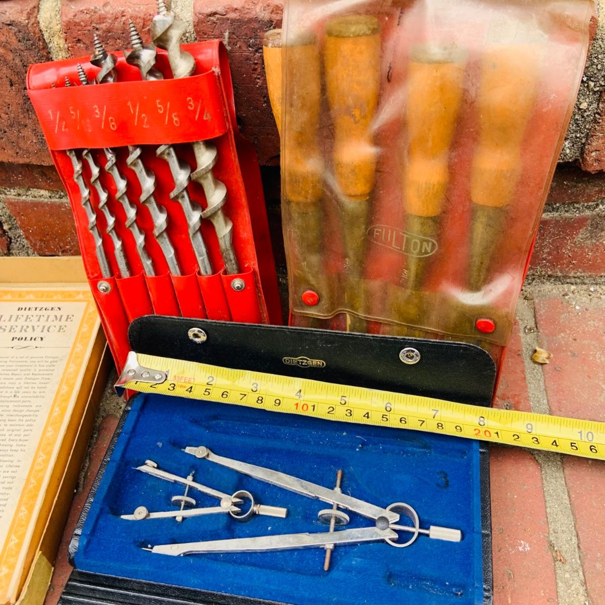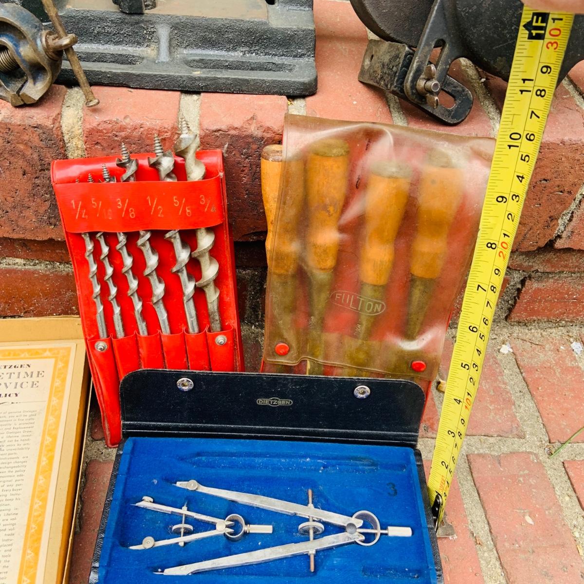 LOT 352: Dietzgen Drafting Set (not complete) Drill Bits, Fulton Carving Tools, Hand Crank Grinder, Clamp and Level