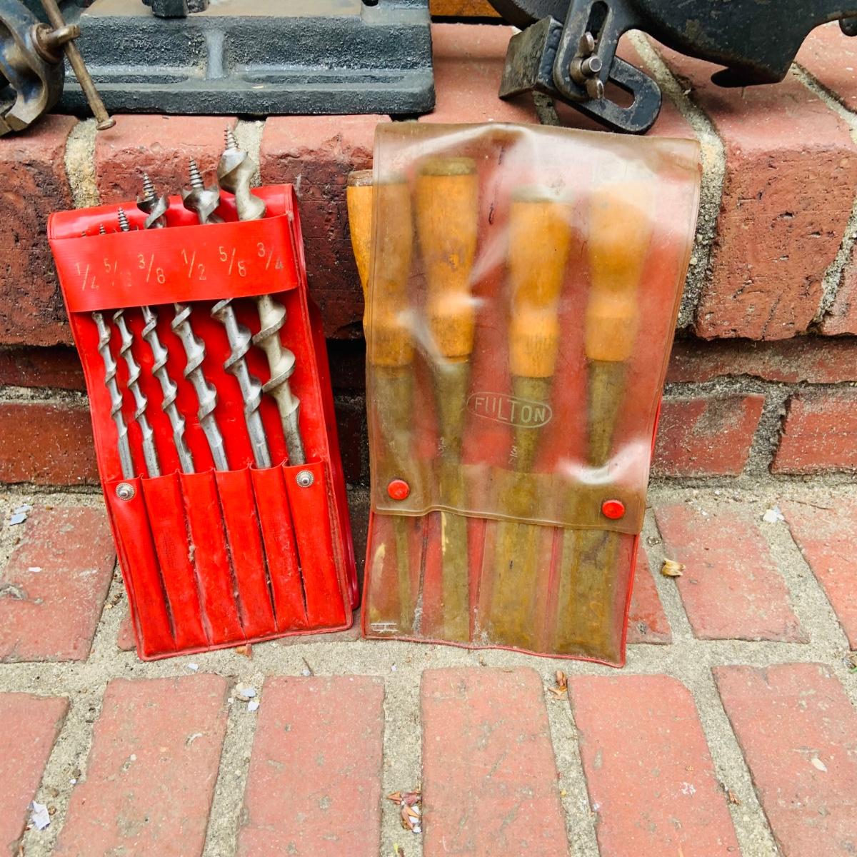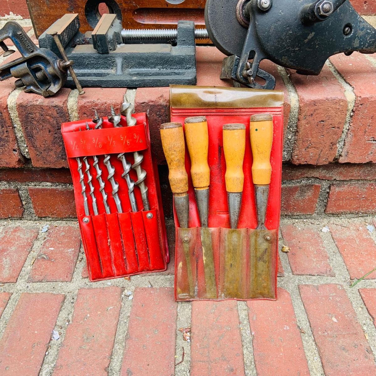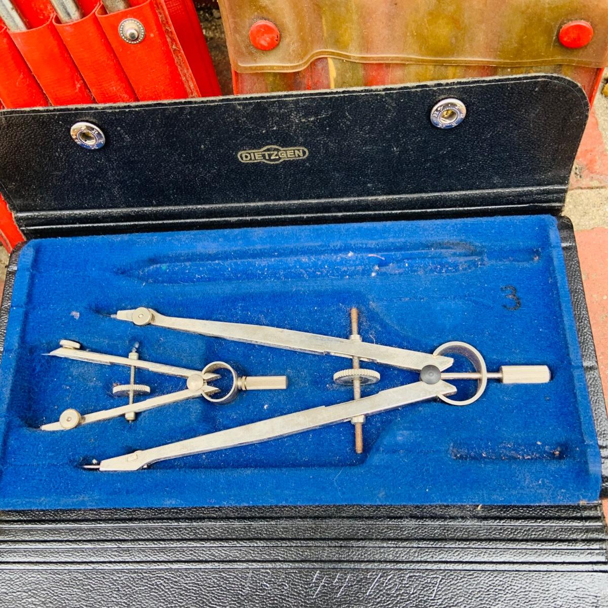 LOT 352: Dietzgen Drafting Set (not complete) Drill Bits, Fulton Carving Tools, Hand Crank Grinder, Clamp and Level