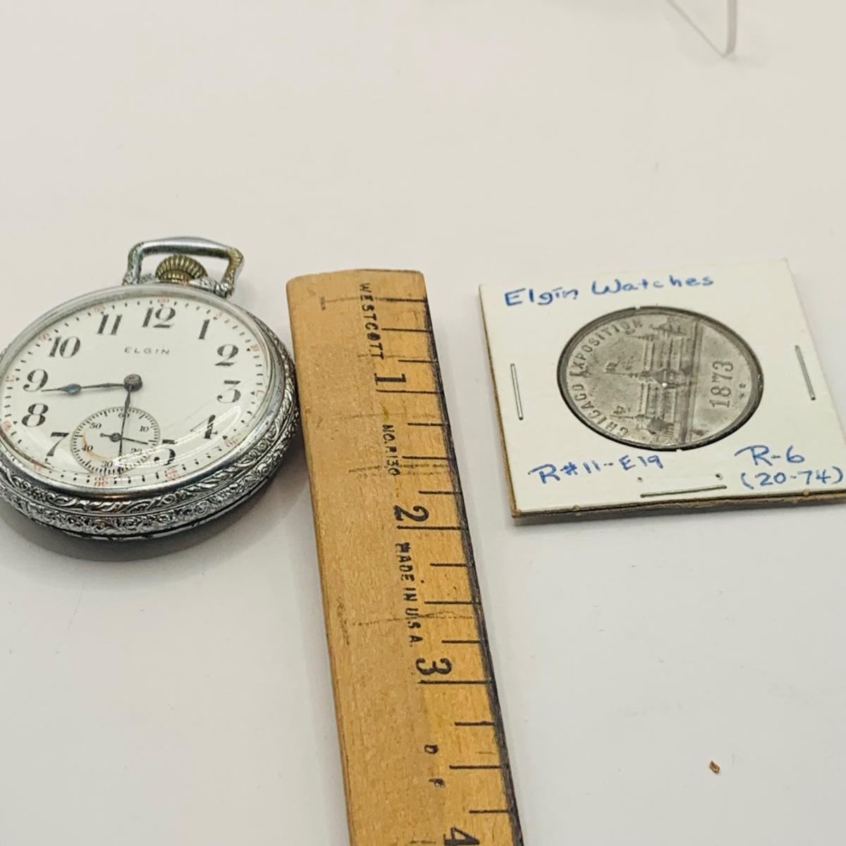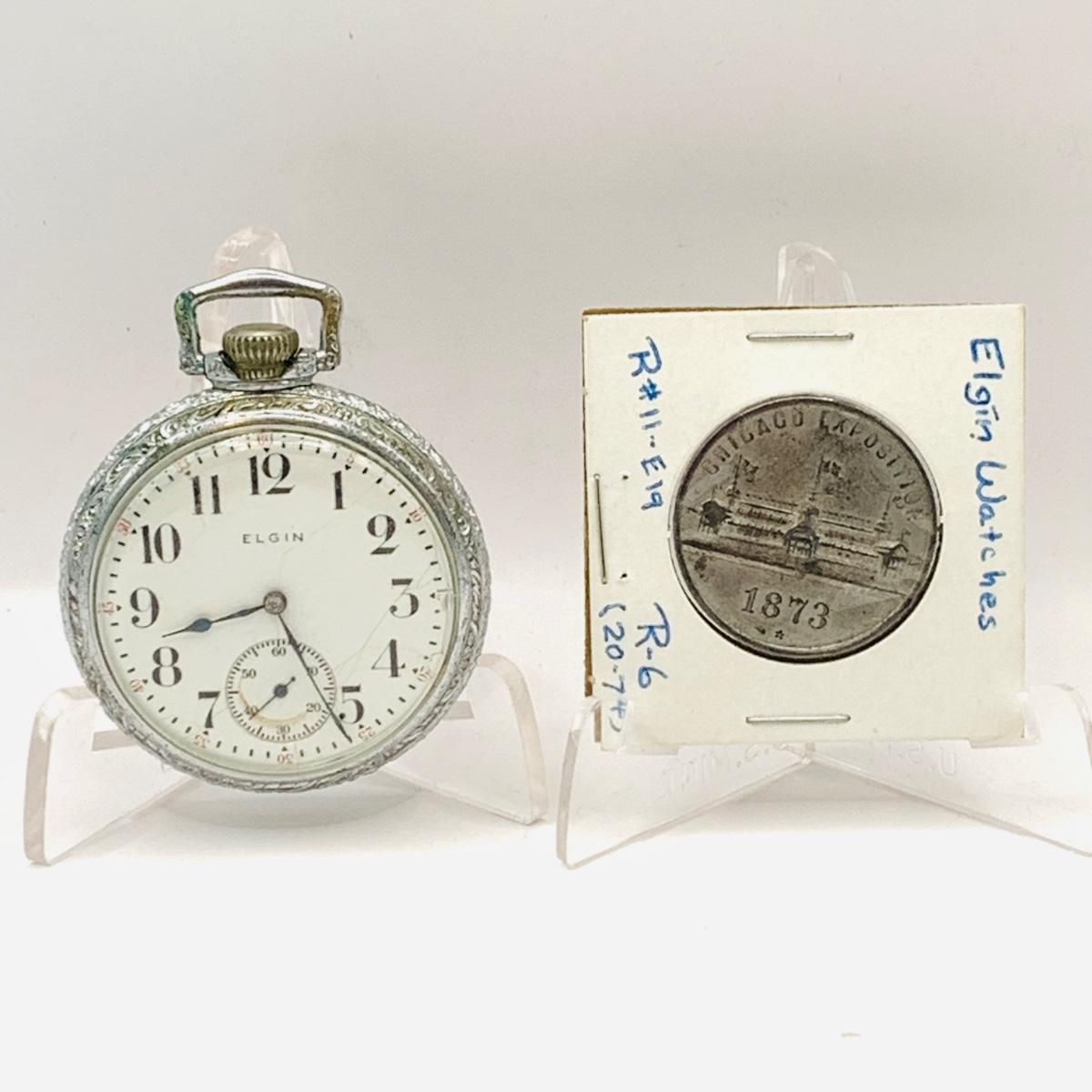 LOT 367: Elgin 17 Jewel Pocket Watch and 1873 Elgin Watches Token