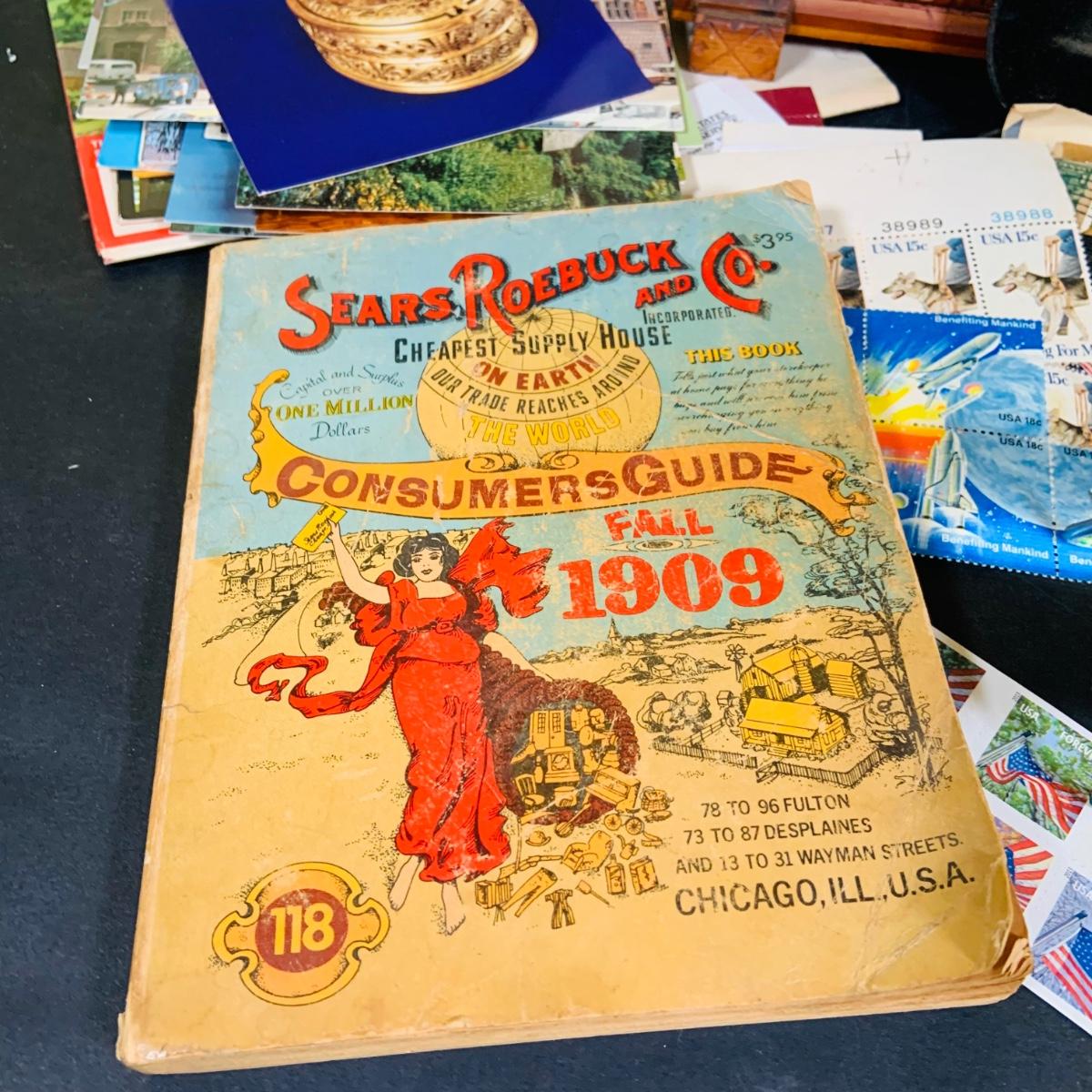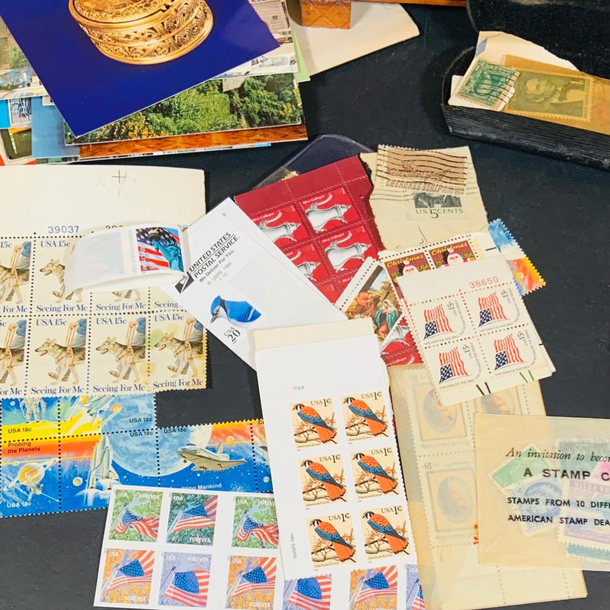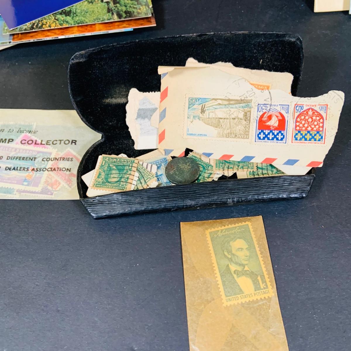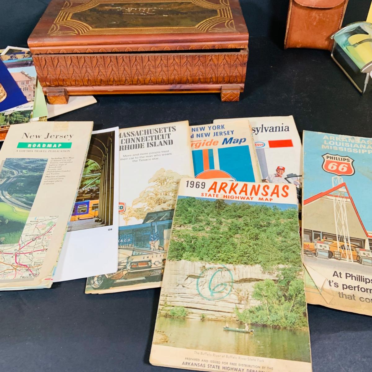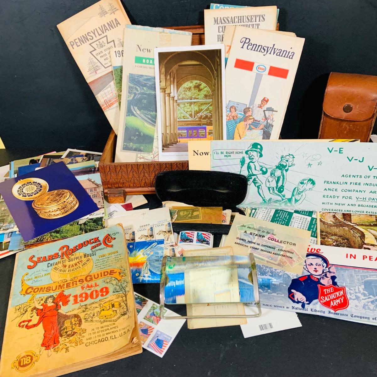 LOT 405: Large Collection of Vintage Ephemera Including Maps, Stamps, Post Cards and Much More and an Apex Ezy Rede Magnifying Glass.