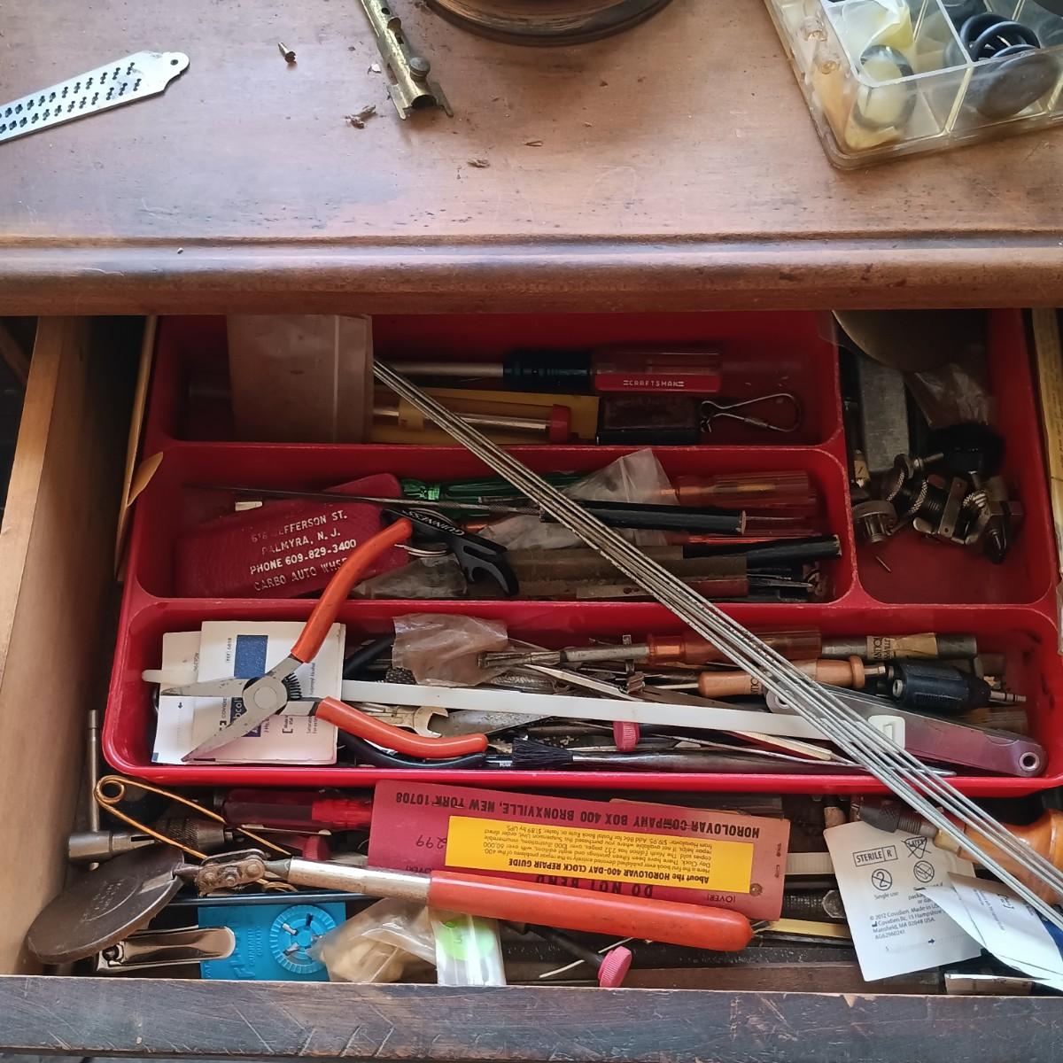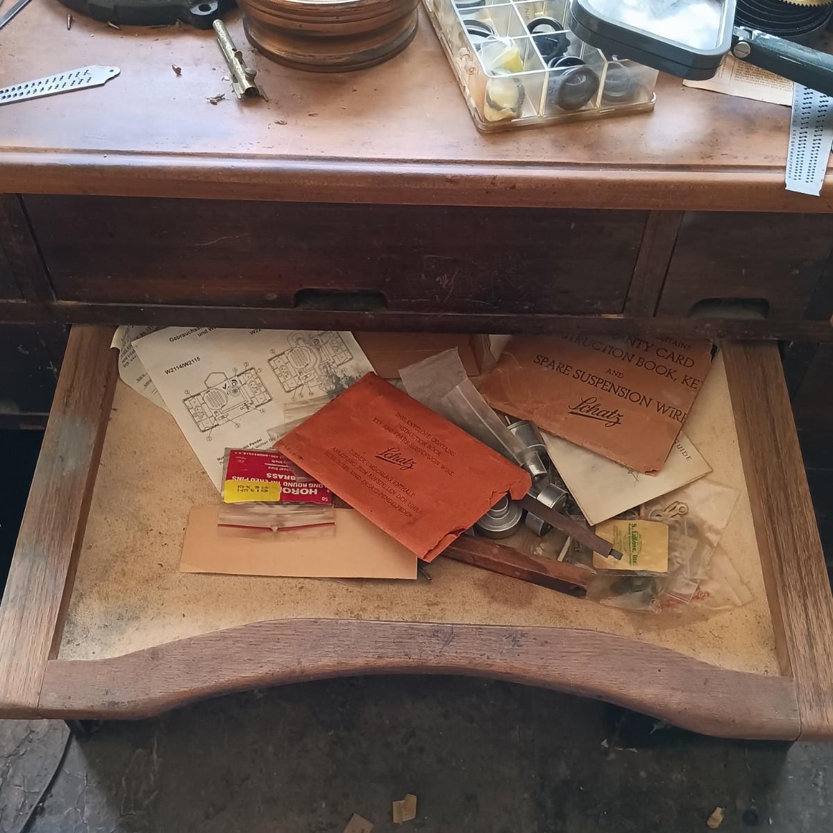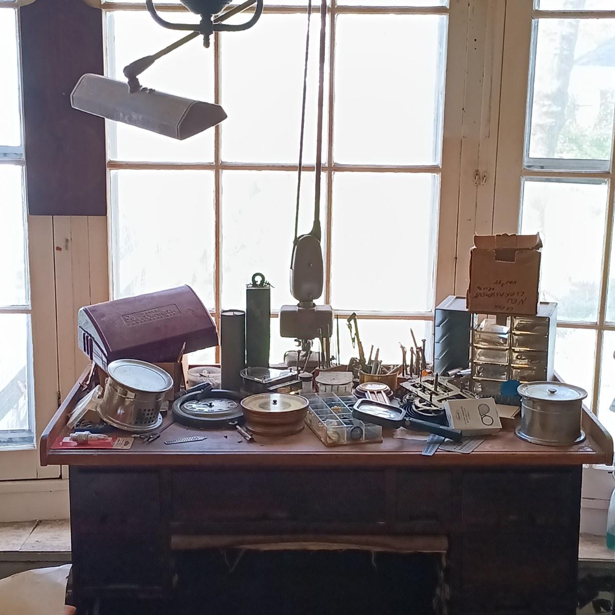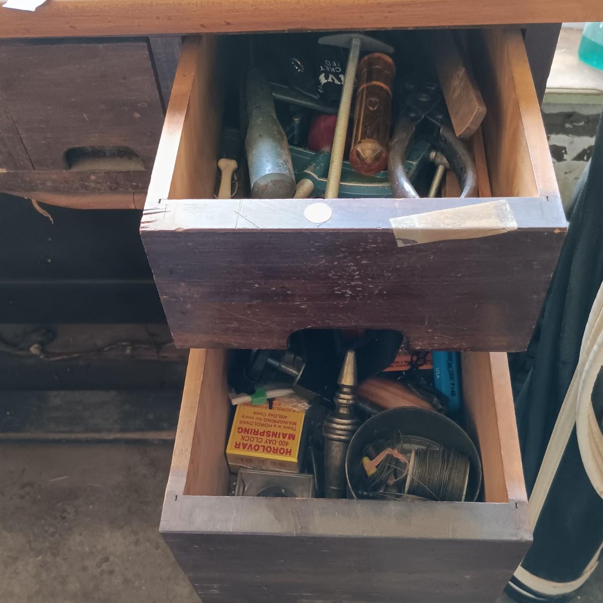 LOT 423: Vintage Watchmakers Bench with A Large Collection of Watch Making Accessories & More