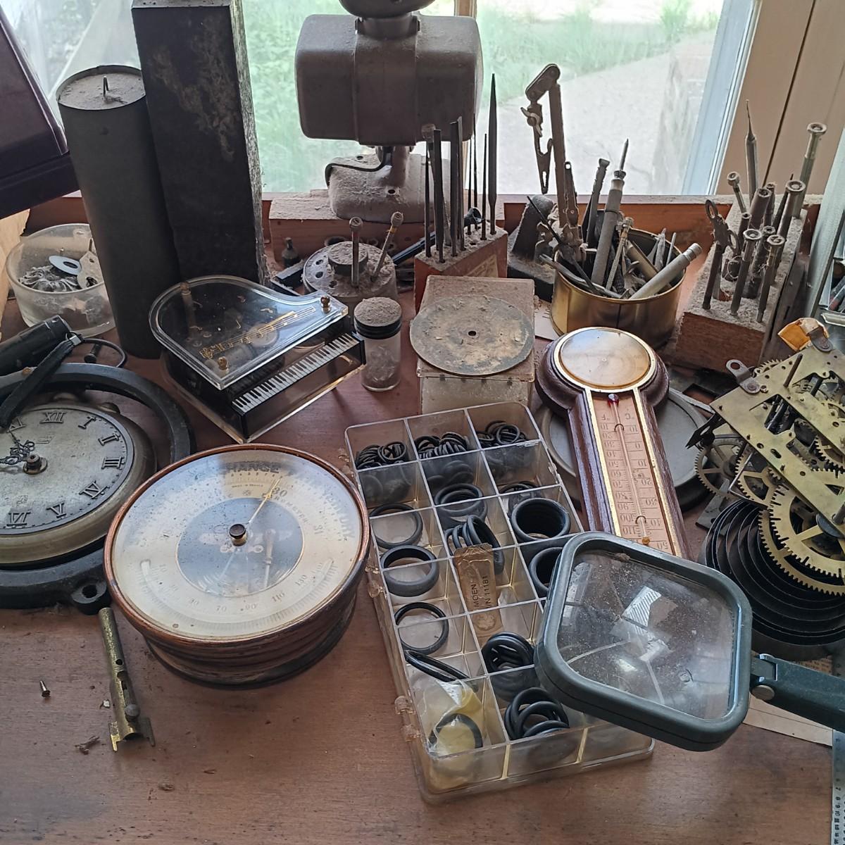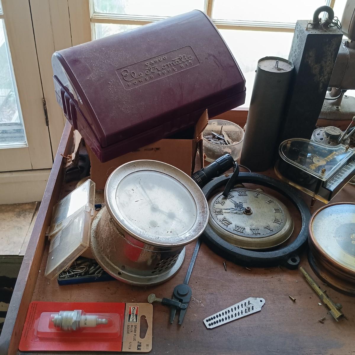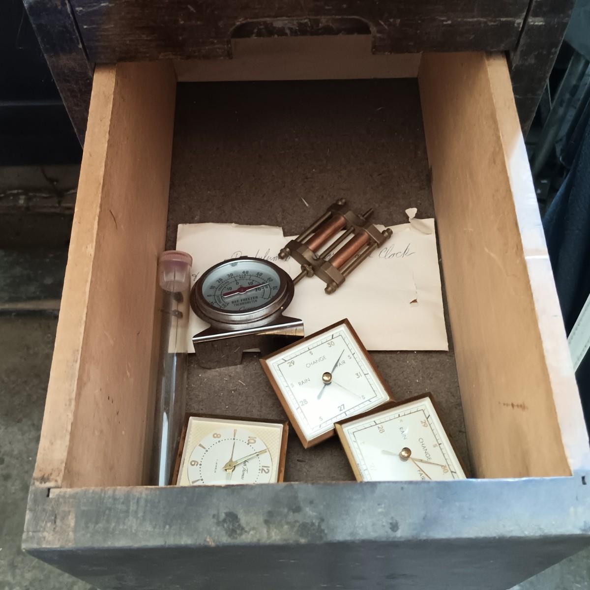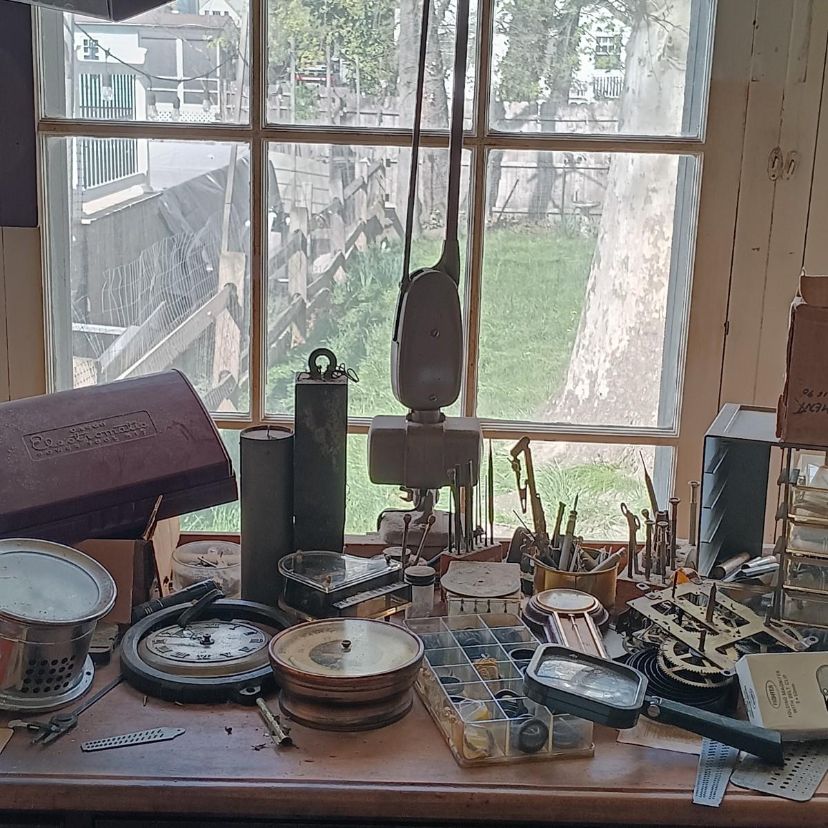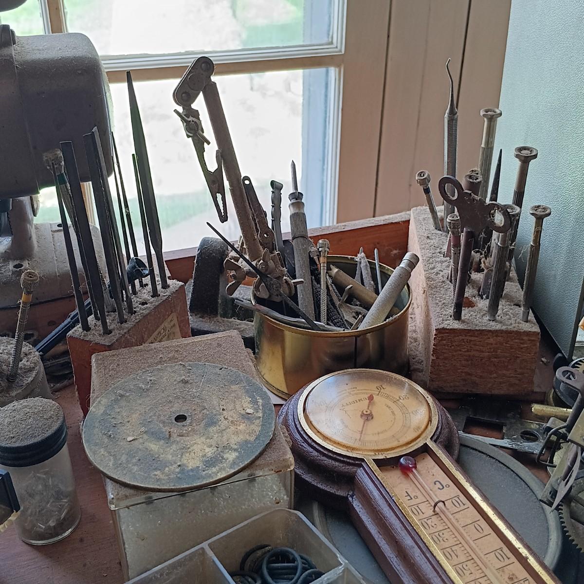 LOT 423: Vintage Watchmakers Bench with A Large Collection of Watch Making Accessories & More