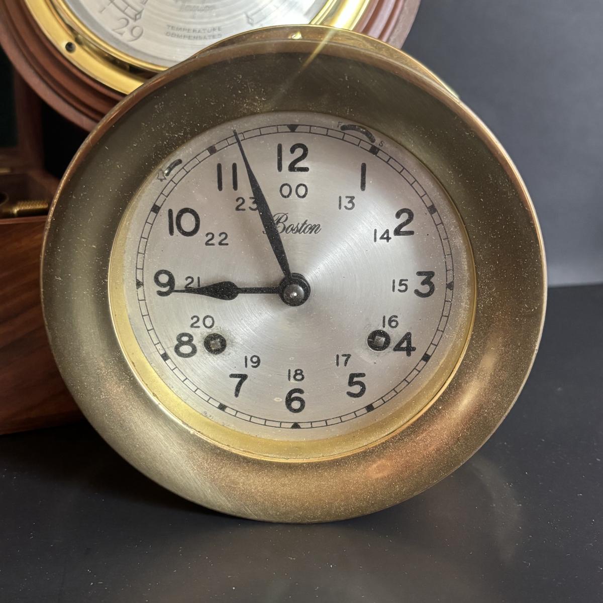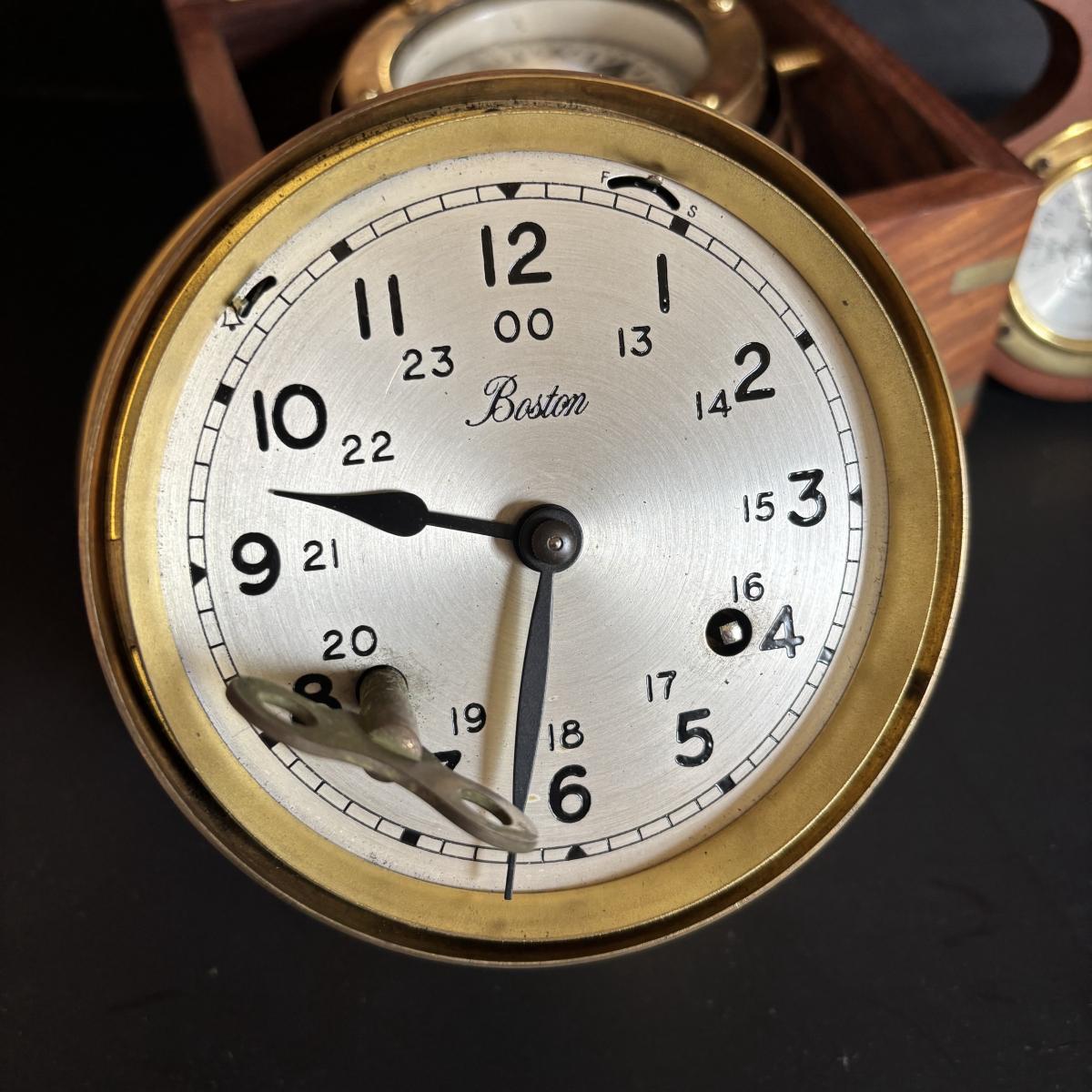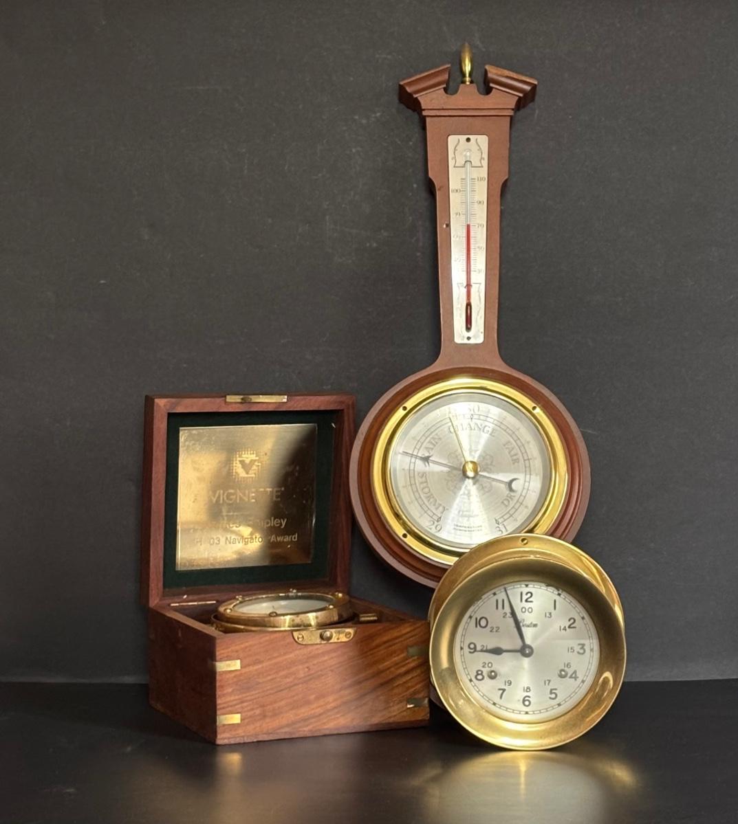 LOT 629: Brass Boston Ships Clock, C. Plath Hamburg Nautical Compass and Taylor Instruments Barometer