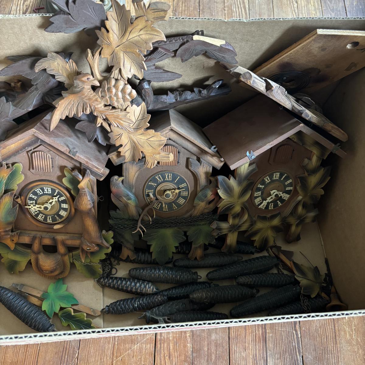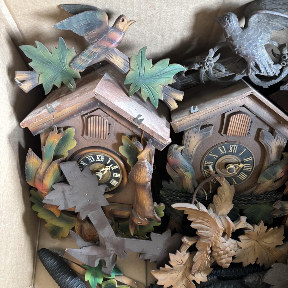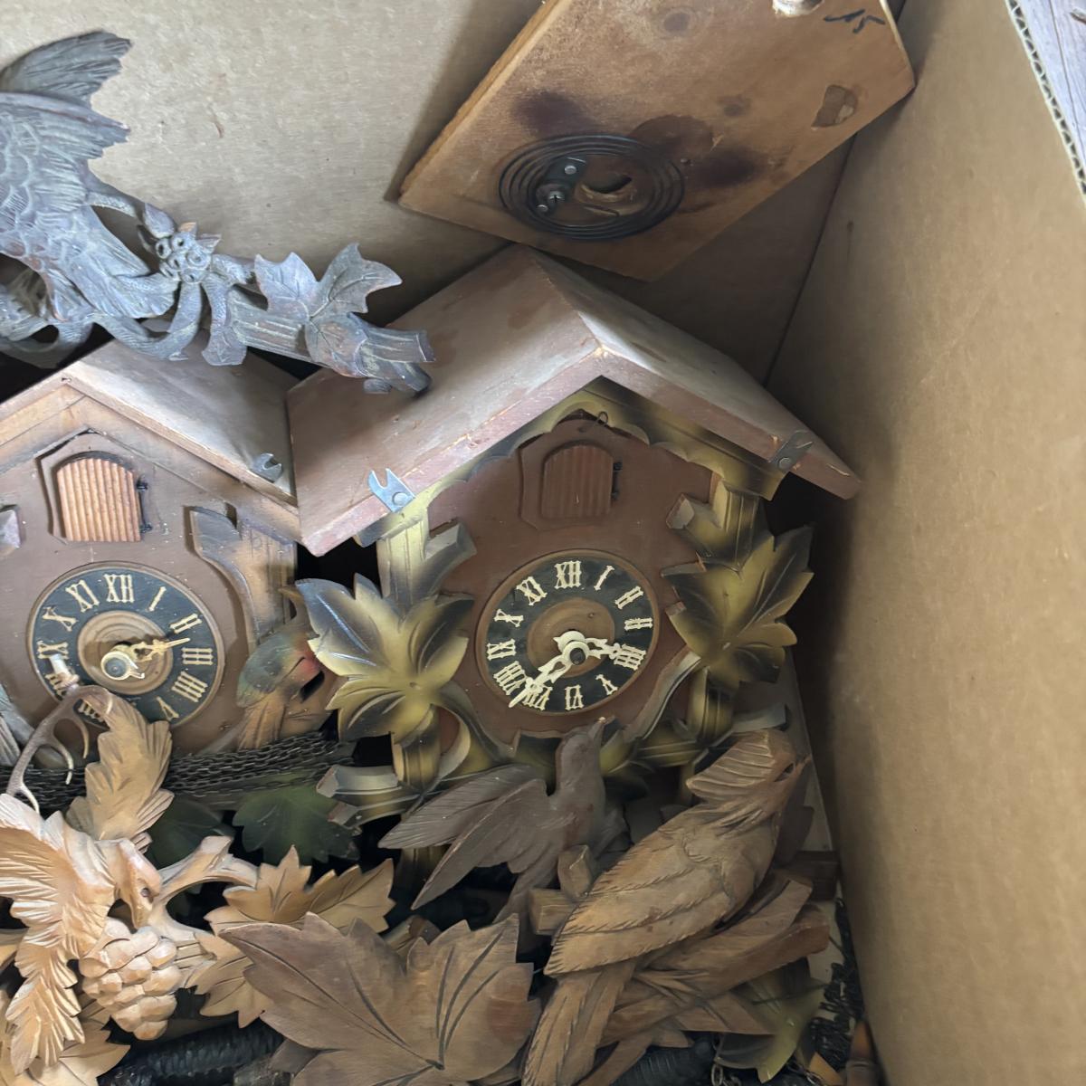 LOT 437: As Found Box of Cuckoo Clocks & Parts