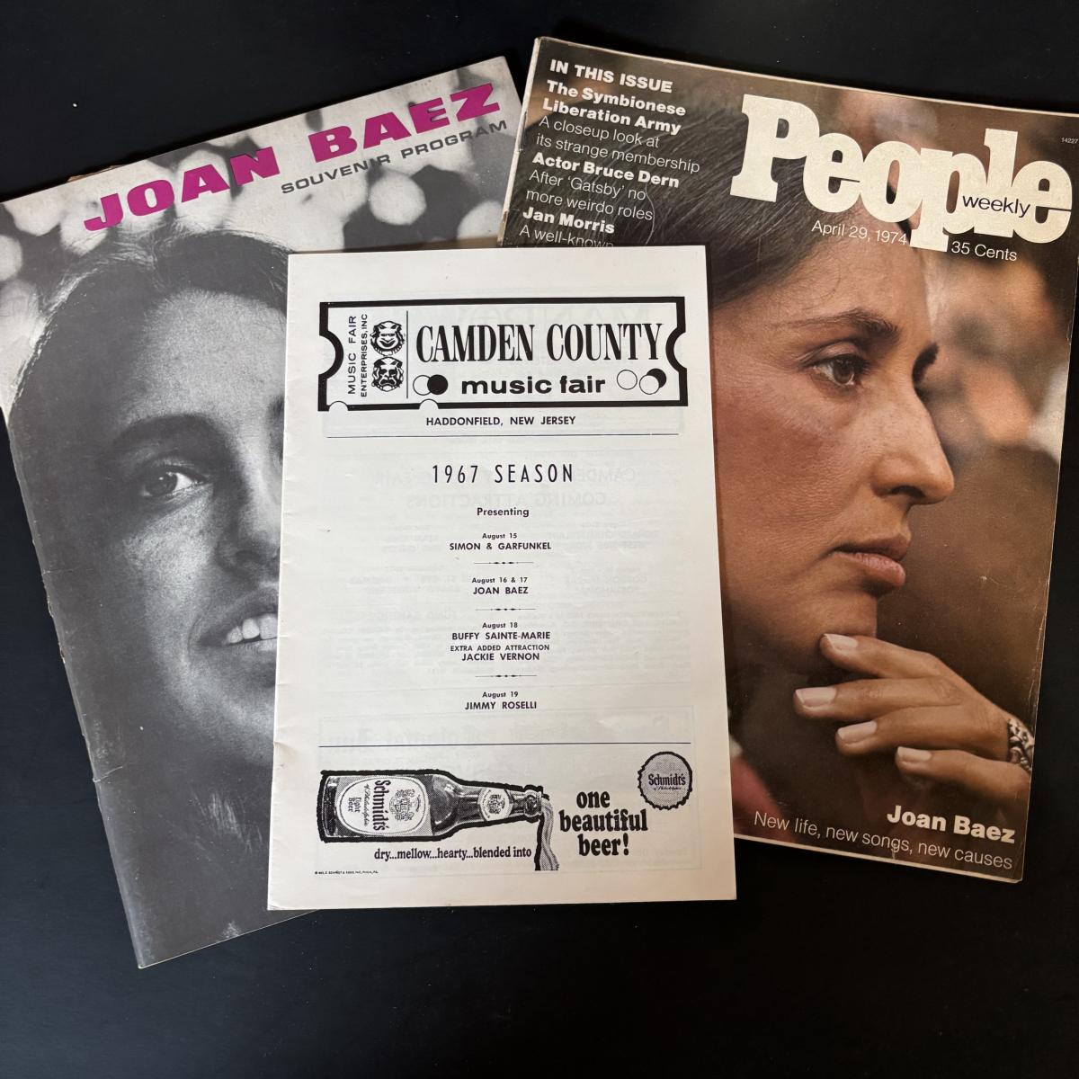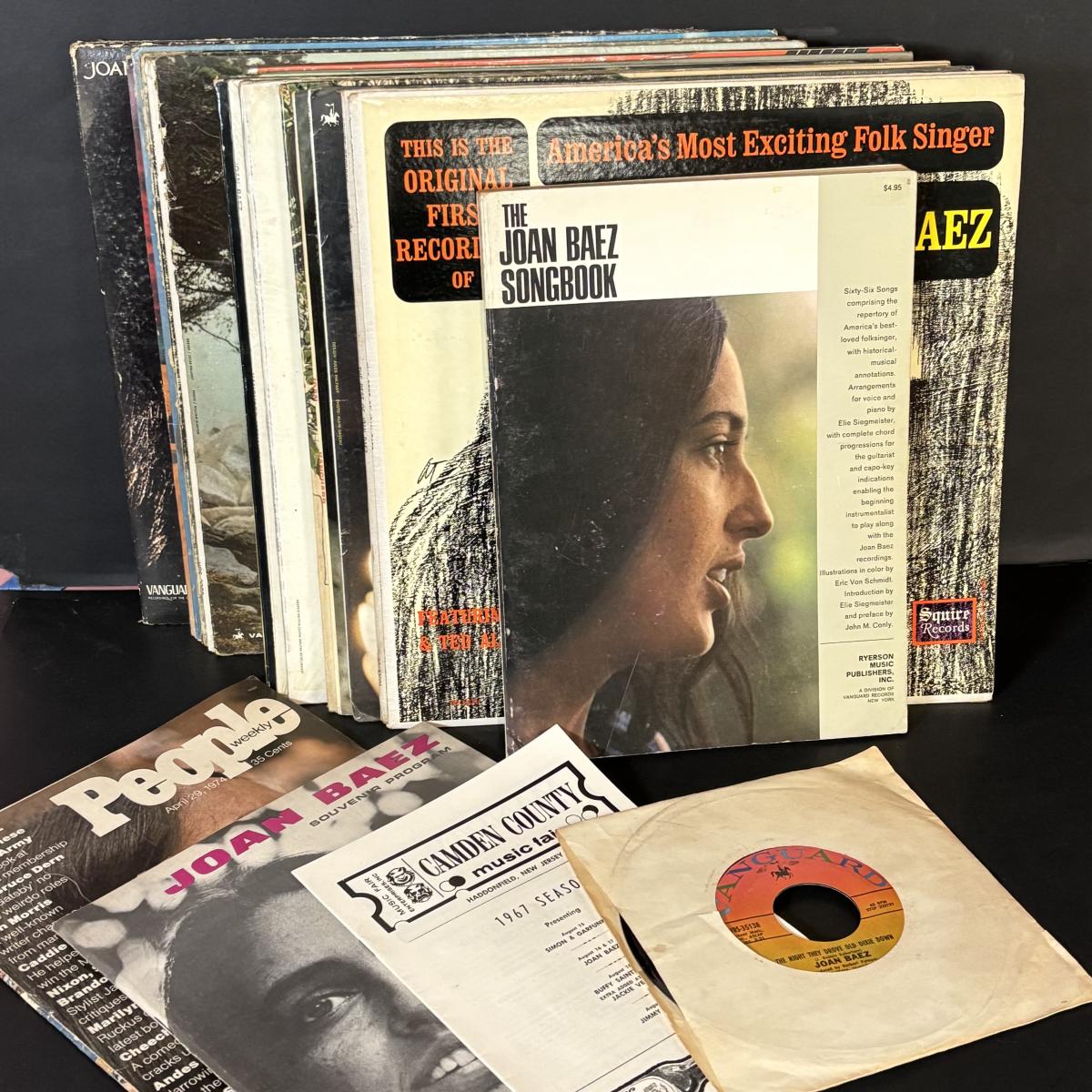 LOT 440: Vintage Joan Baez Collection: LP's & 45's, Songbook, People Magazine, Souvenir Program & Camden County 1967 Music Fair Program