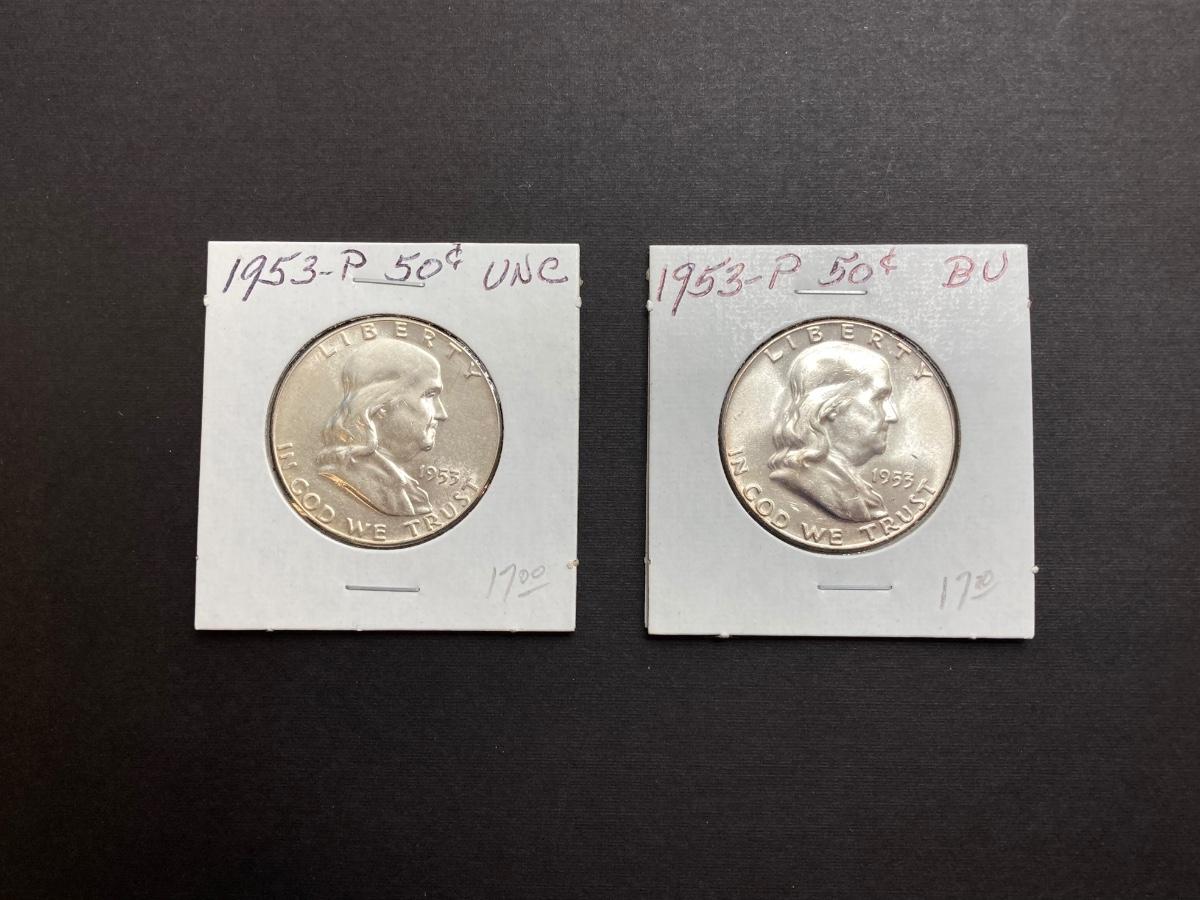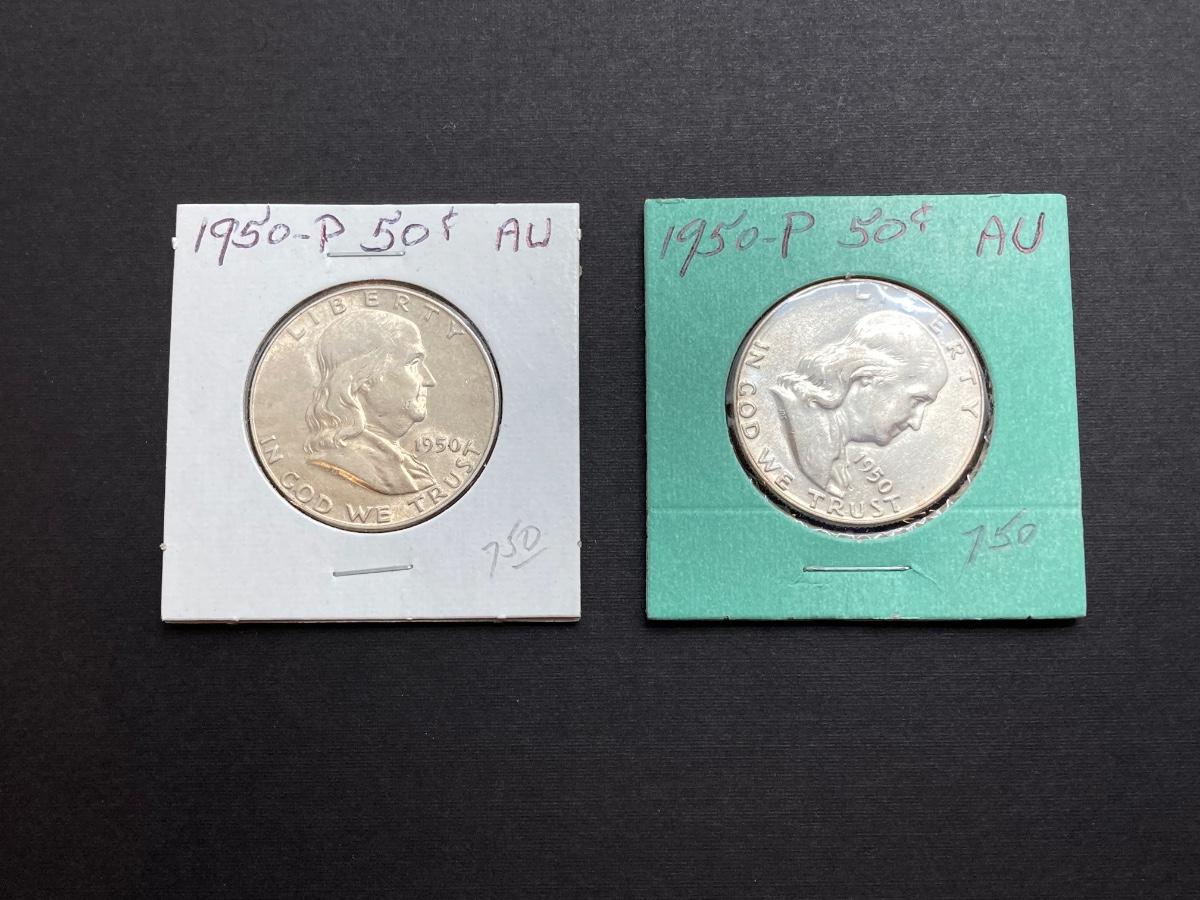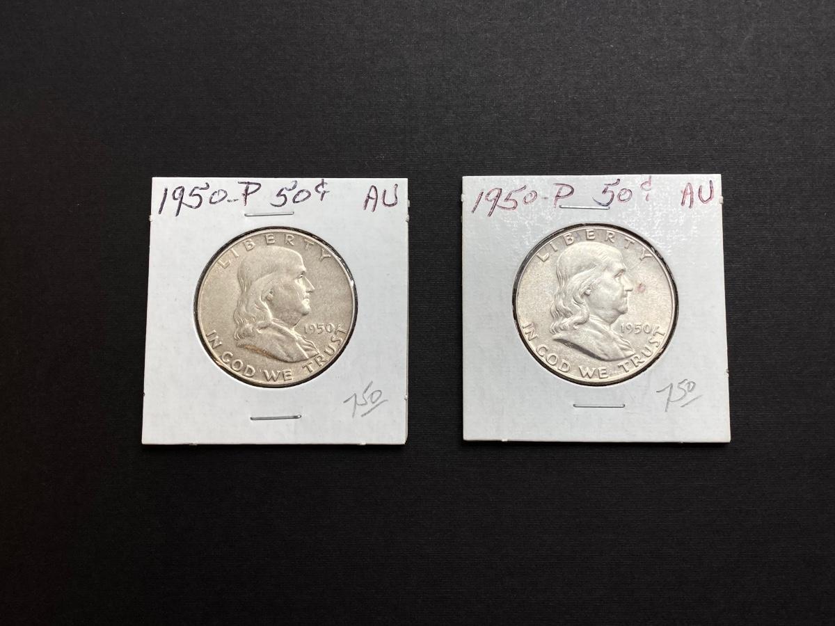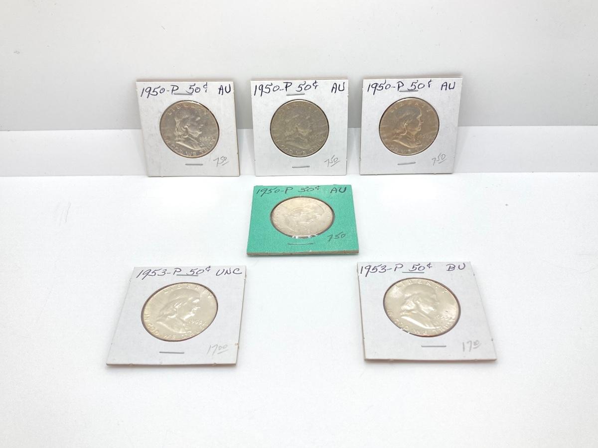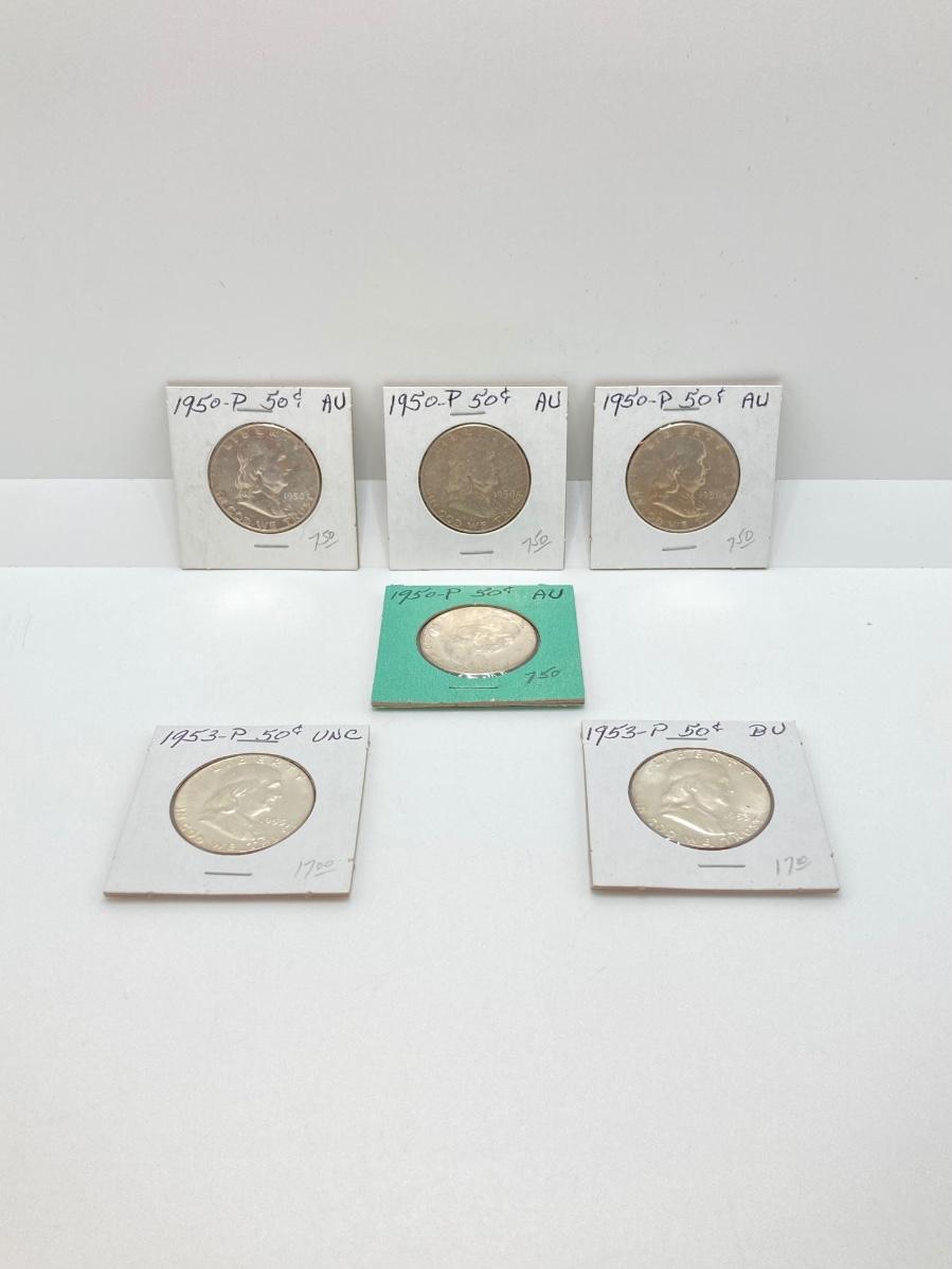LOT 476: Six U.S. Benjamin Franklin Half Dollar Silver Coins - 1950 to 1953