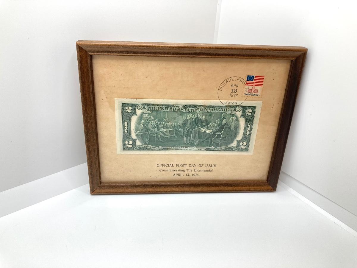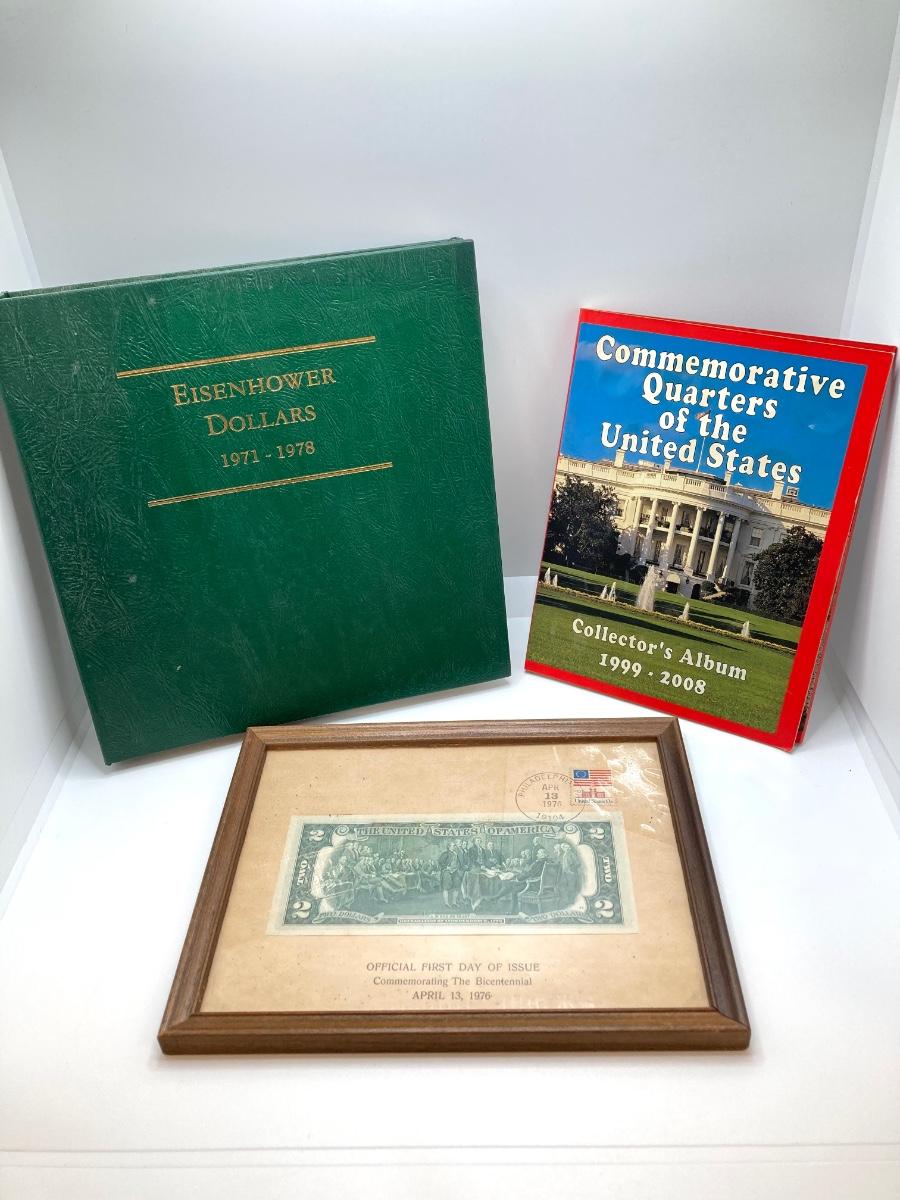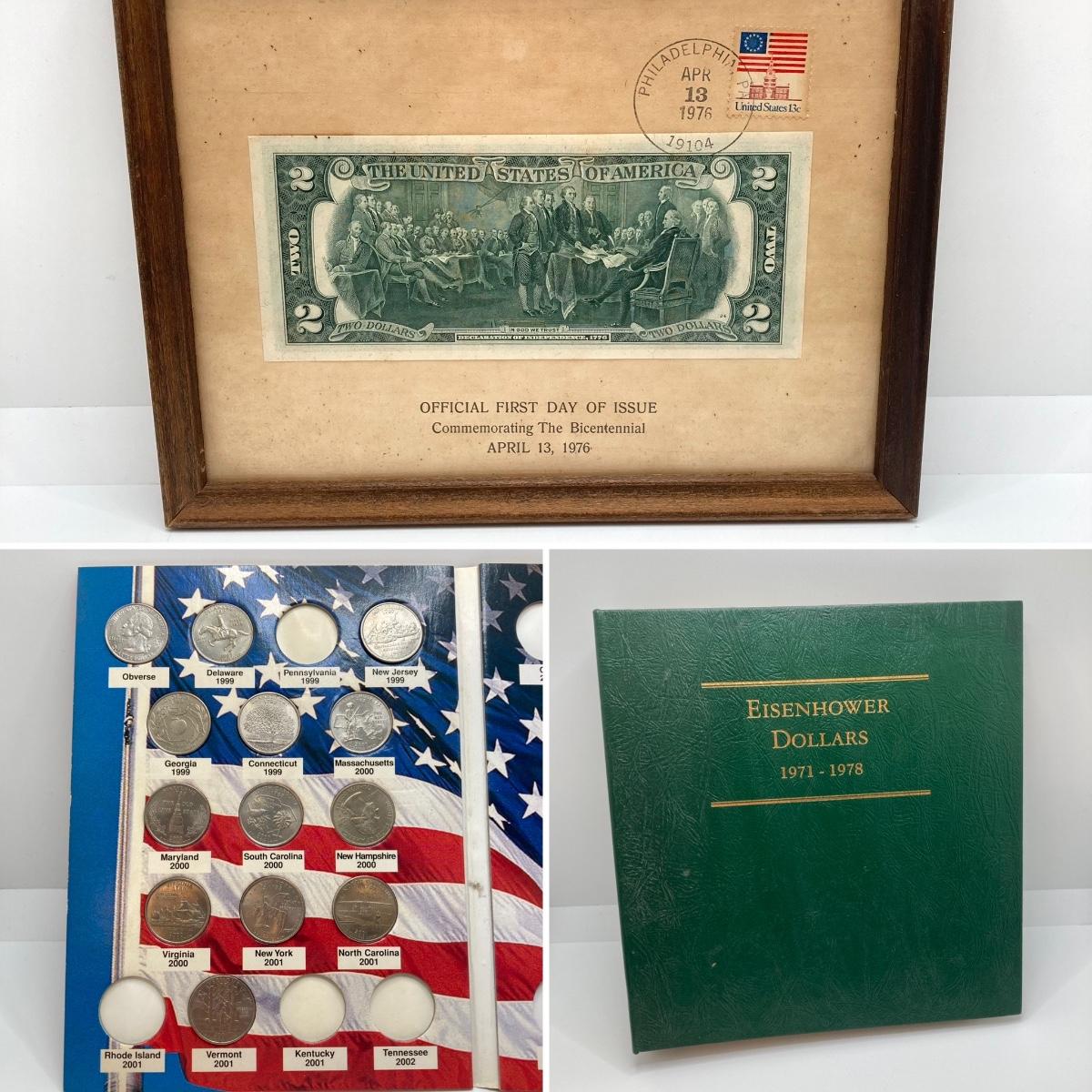 LOT 477: First Day of Issue Commemorating The Bicentennial April 13, 1976 Two Dollar Bill, U.S. Eisenhower One Dollar Coins and Commemorative U.S. Quarters