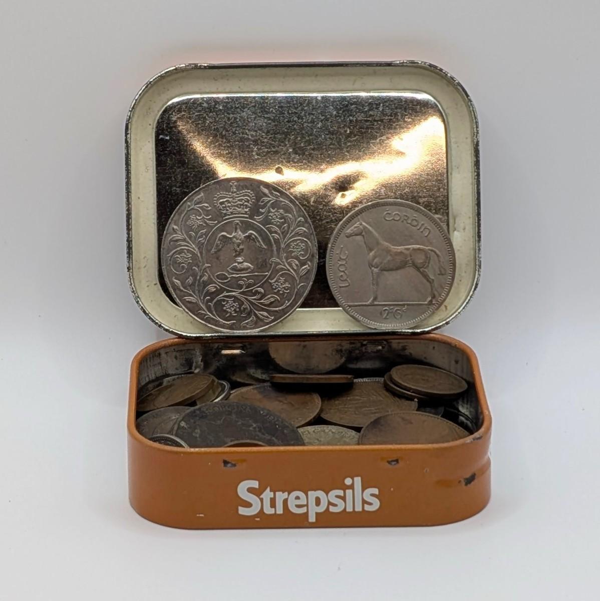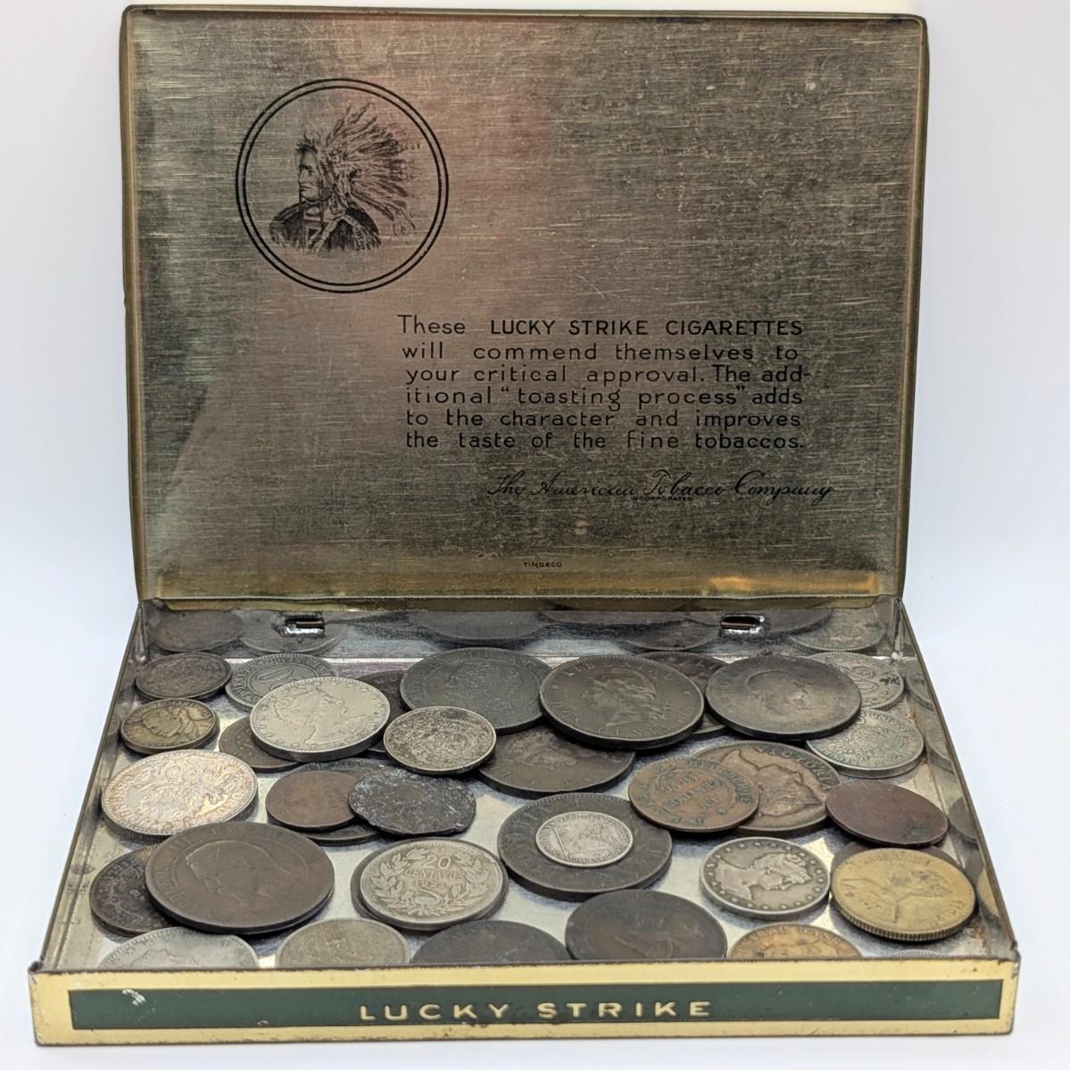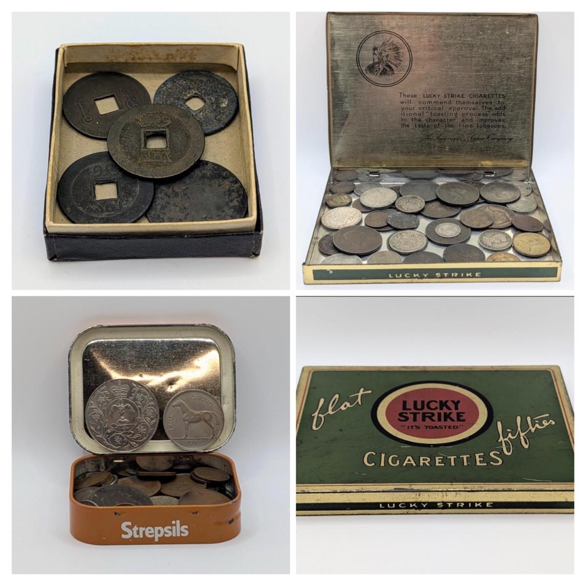 LOT 521J: Vintage Lucky Strike Container With Assorted Coins, Strepsil Container With Great Britain 1977 Queen Elizabeth II Jubilee Commemorative Coin & More