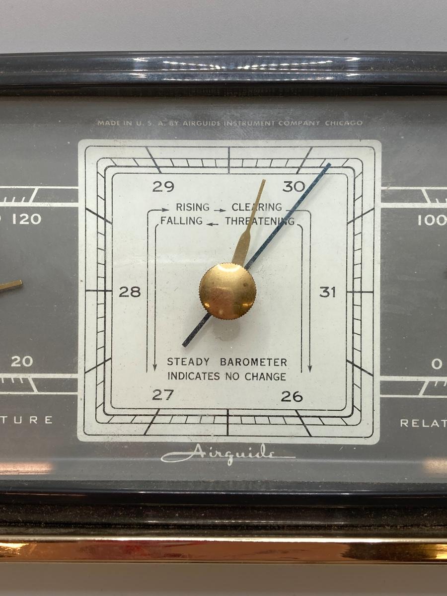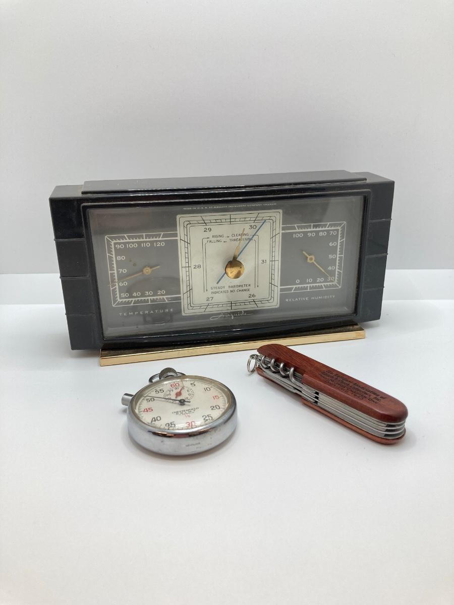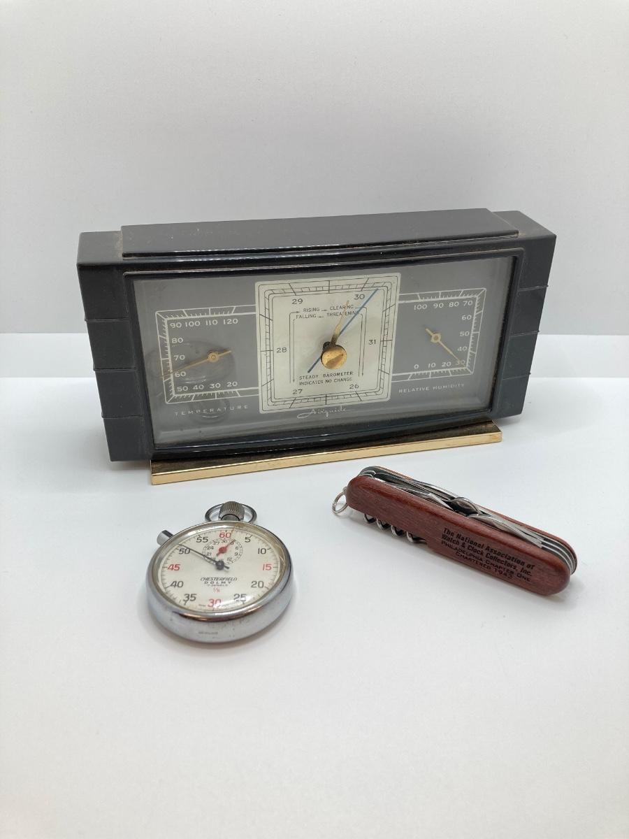 LOT 522: Vintage Airguide Table / Desk Barometer in Box, Chesterfield Dolmy Swiss Made Stop Watch and National Association of Watch & Clock Collectors Pocket Knife