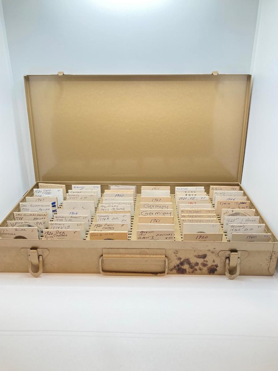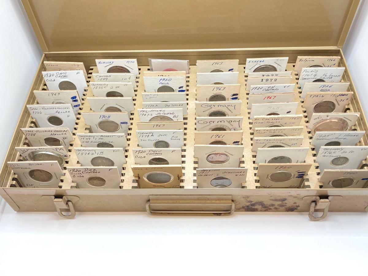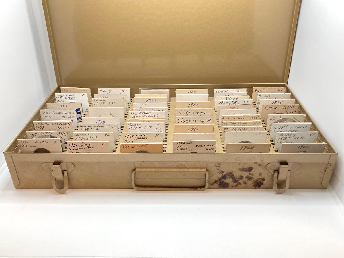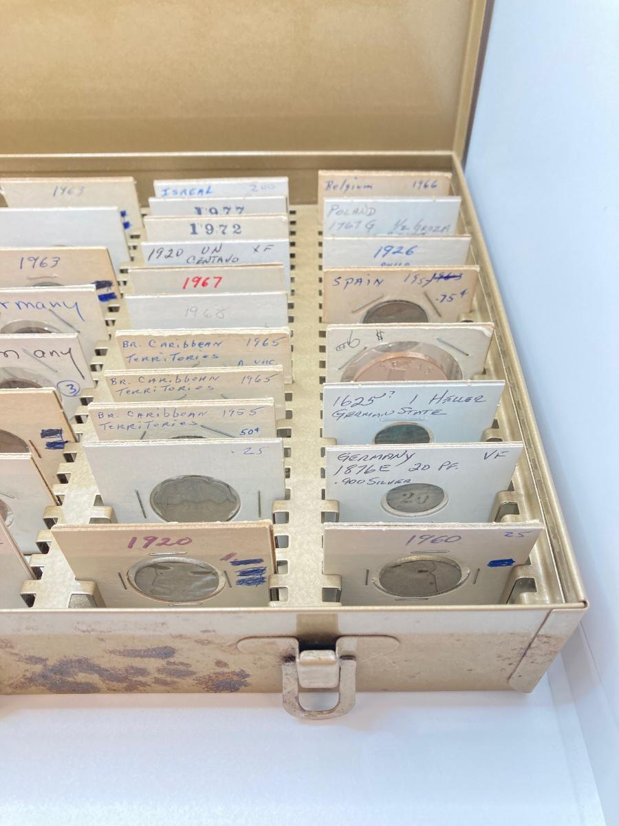 LOT 537: Large Collection of International Vintage / Antique Coins in Metal Storage Box