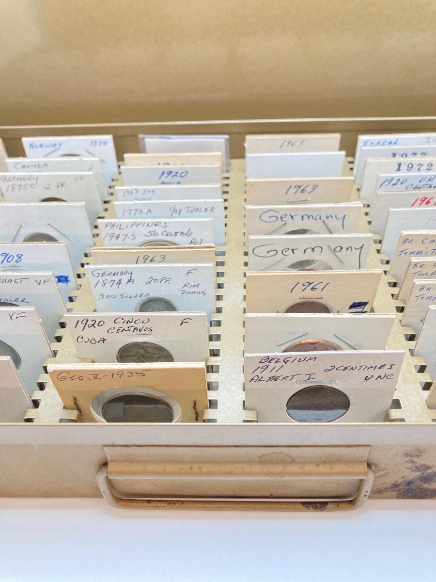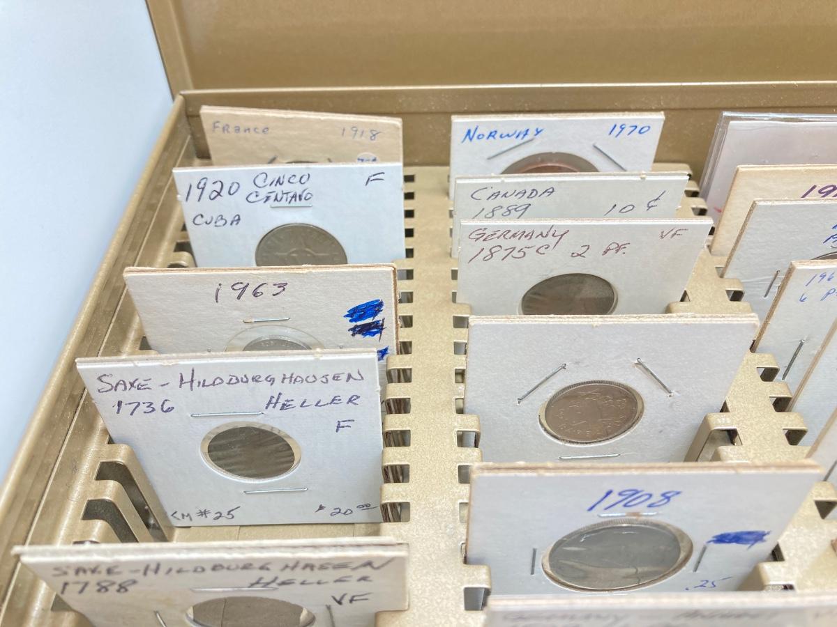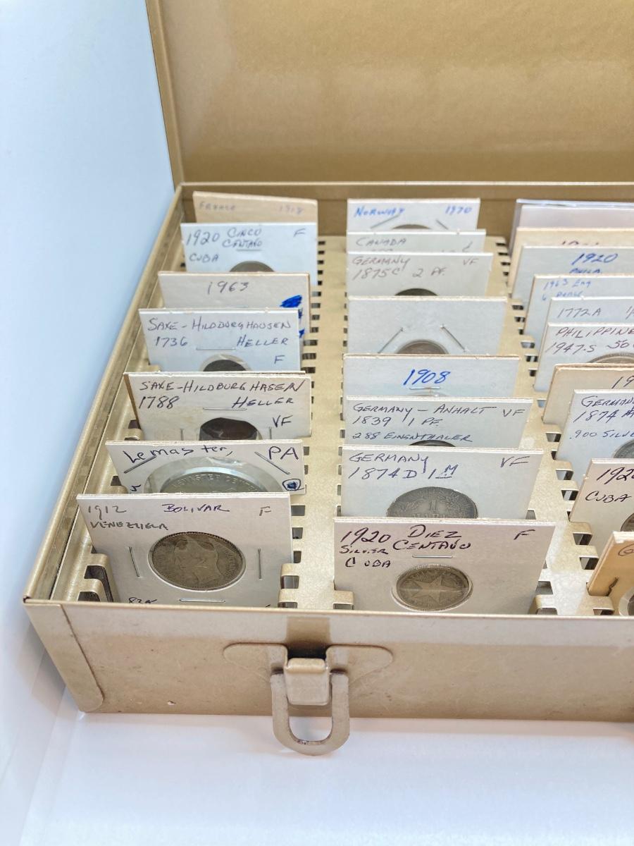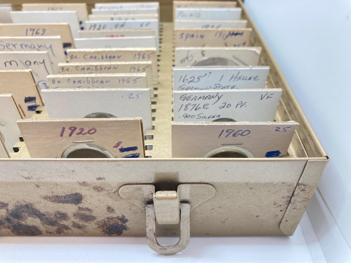 LOT 537: Large Collection of International Vintage / Antique Coins in Metal Storage Box