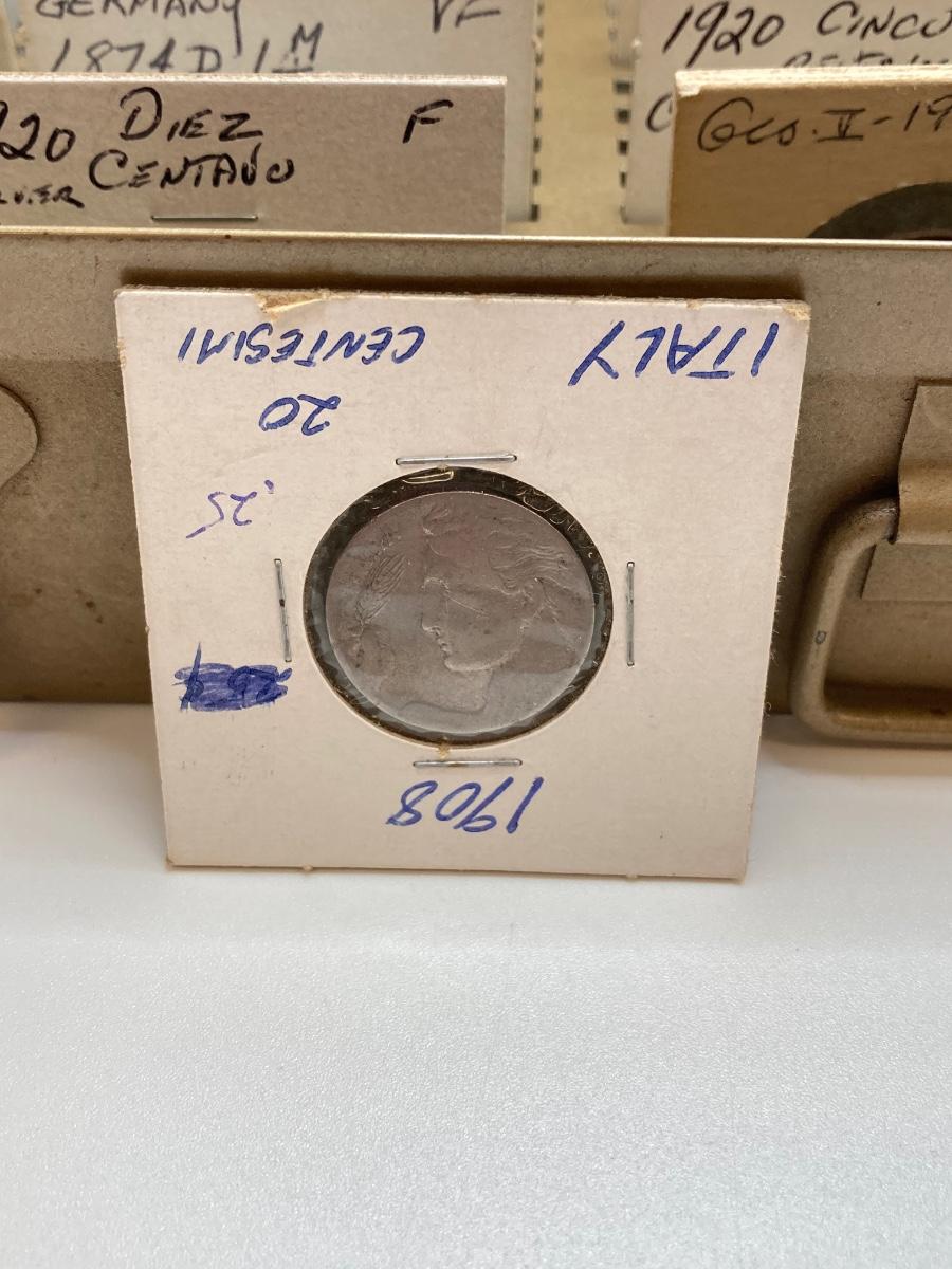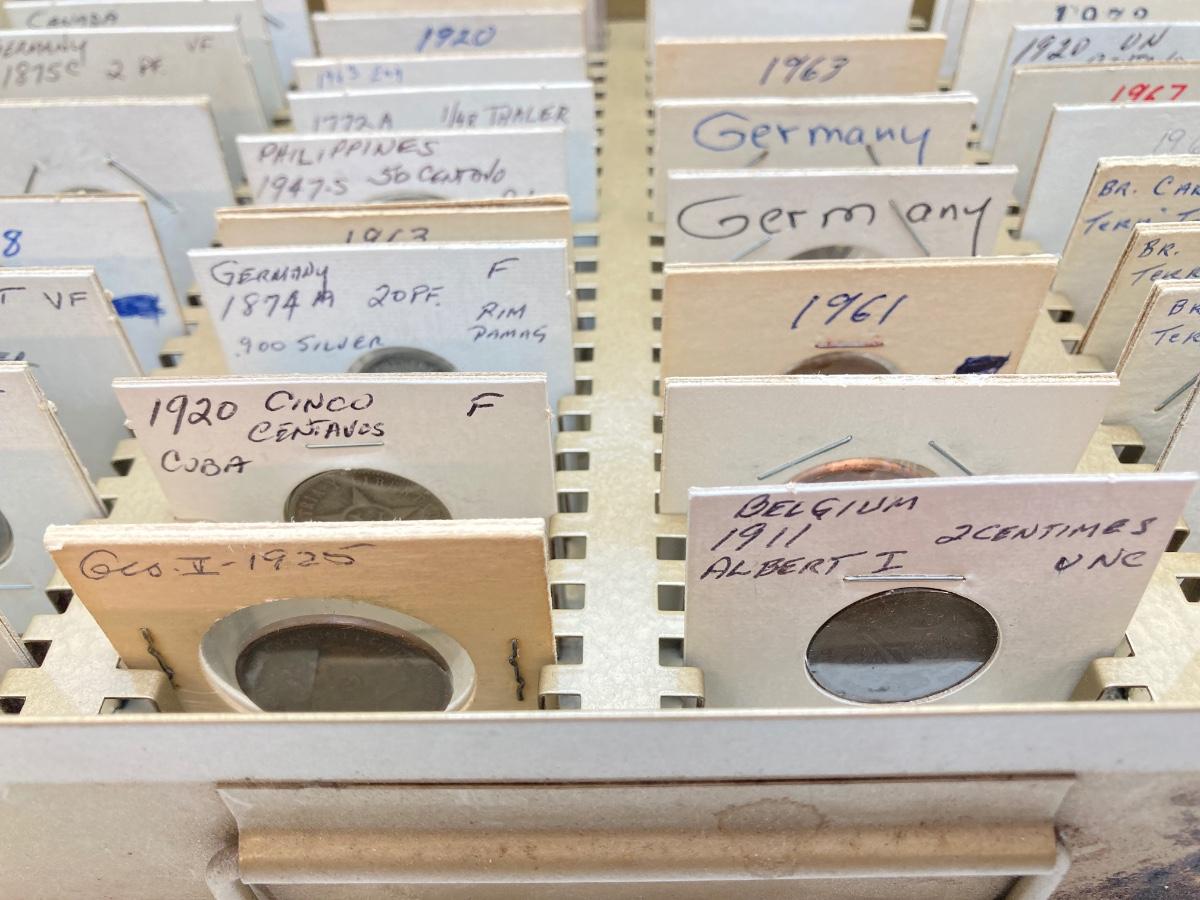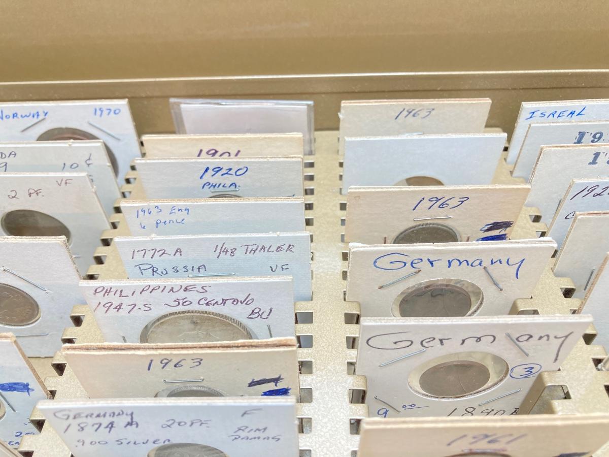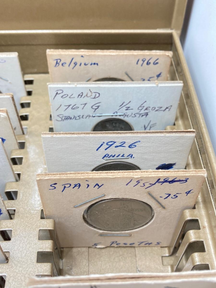 LOT 537: Large Collection of International Vintage / Antique Coins in Metal Storage Box