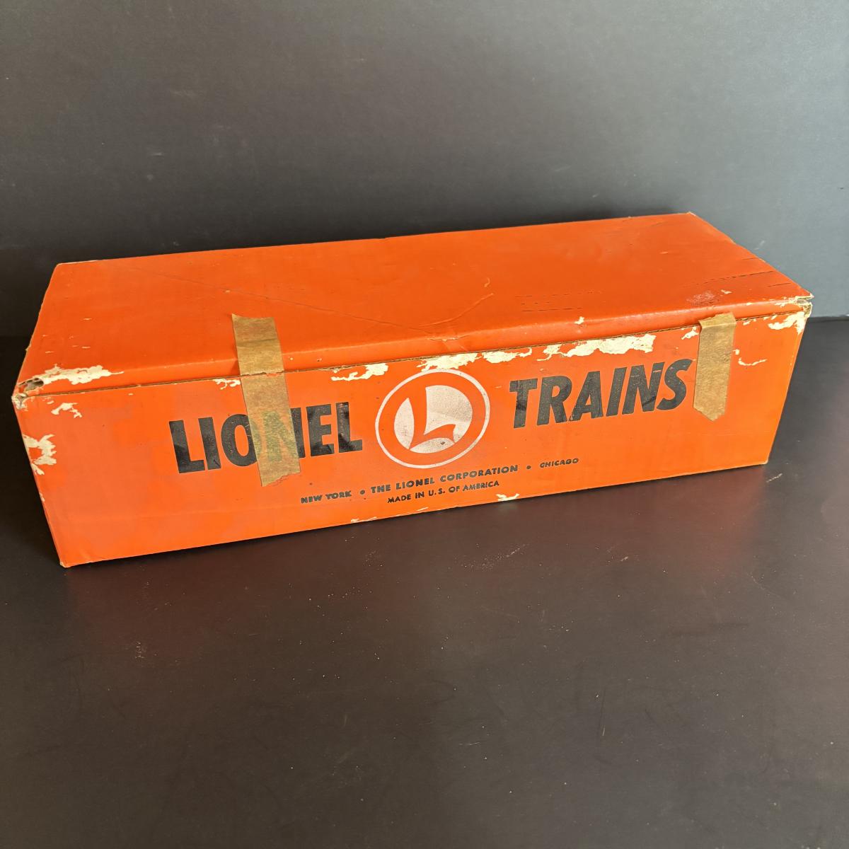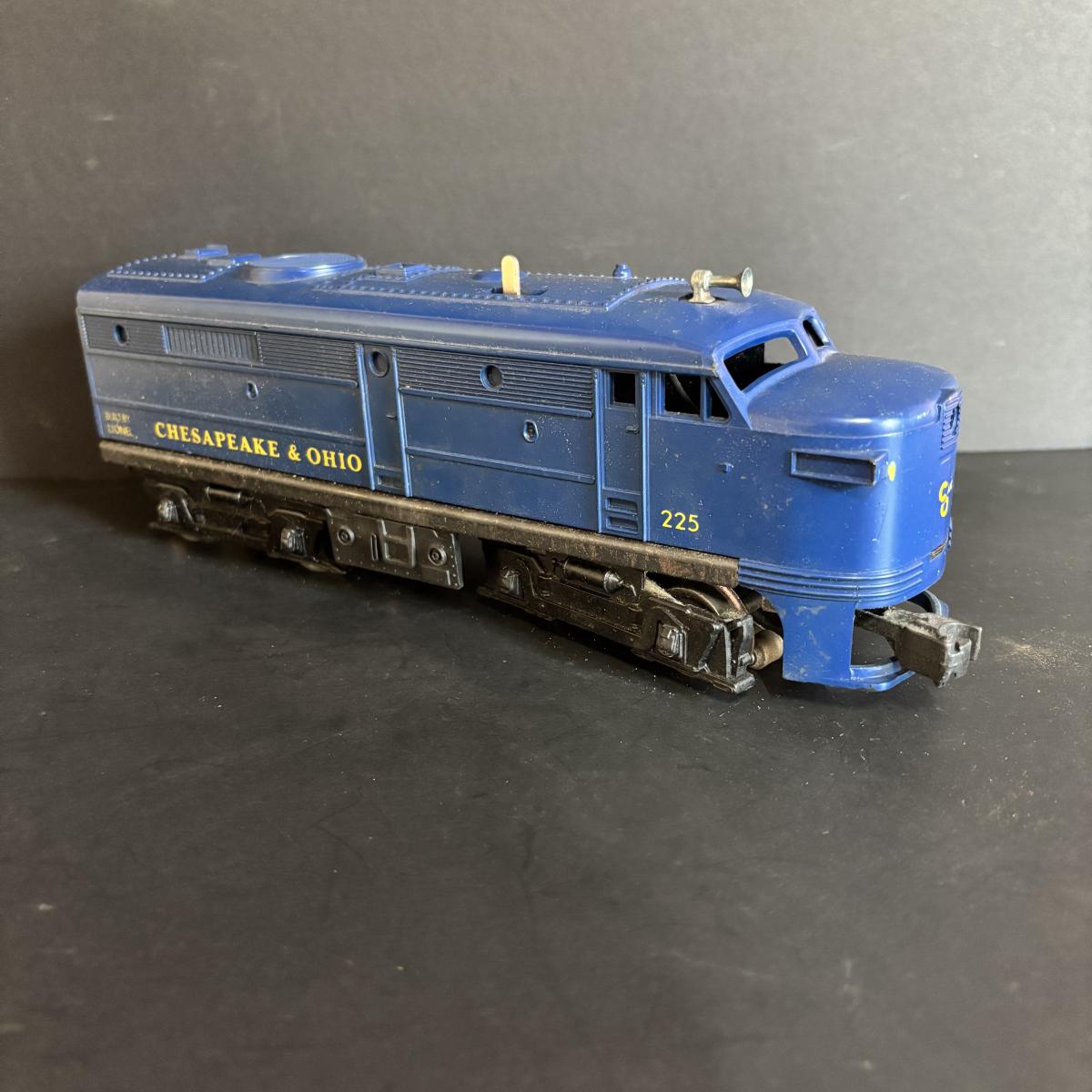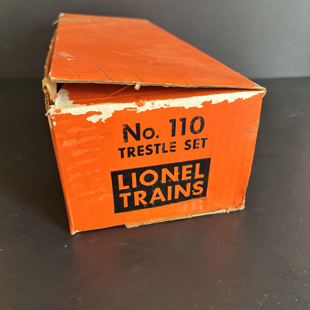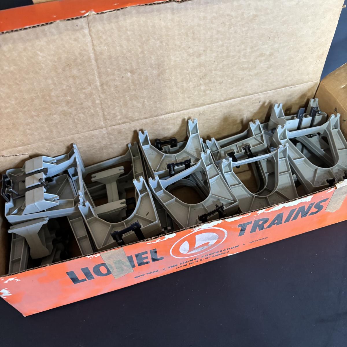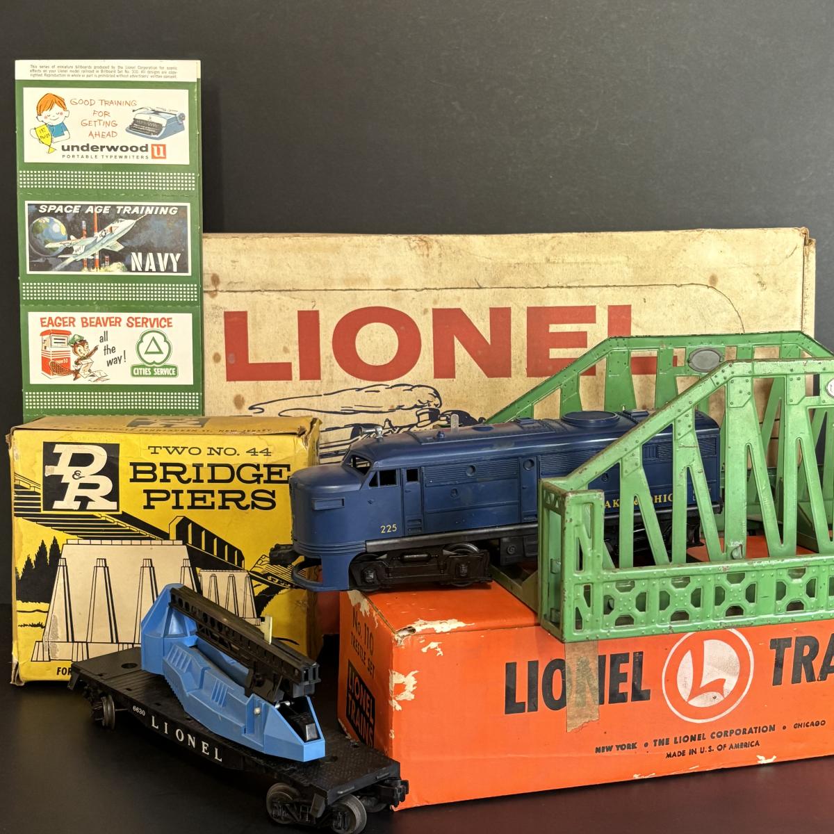 LOT 640: Lionel Chesapeake & Ohio No 225 Engine, Flatbed Train Car No 6630. Metal Bridge, D & R Bridge Piers, Lionel No. 110 Trestle Set, Cardboard Billboards & Empty Lionel Train Box