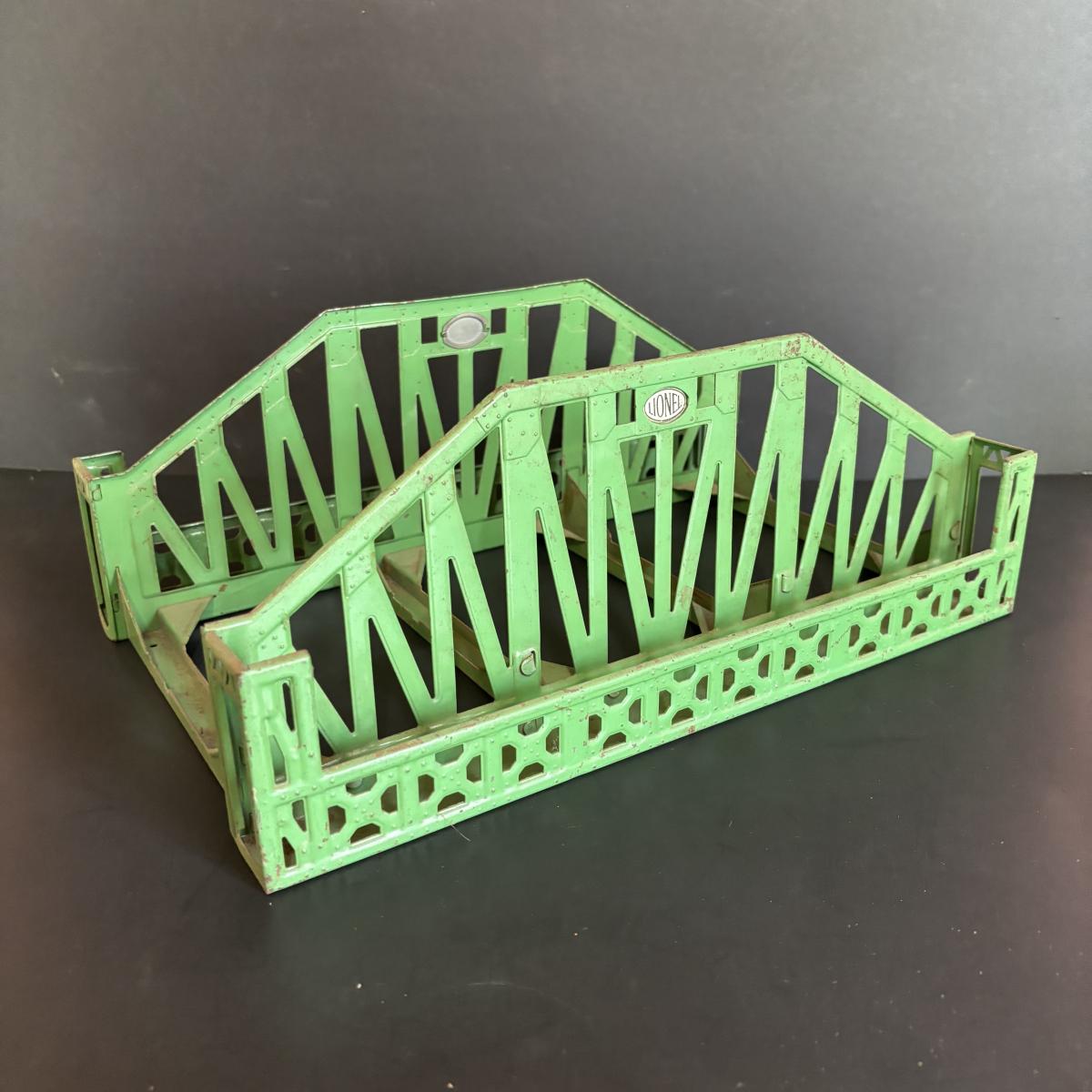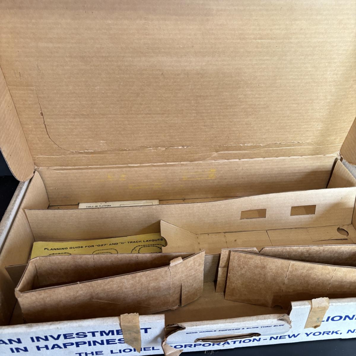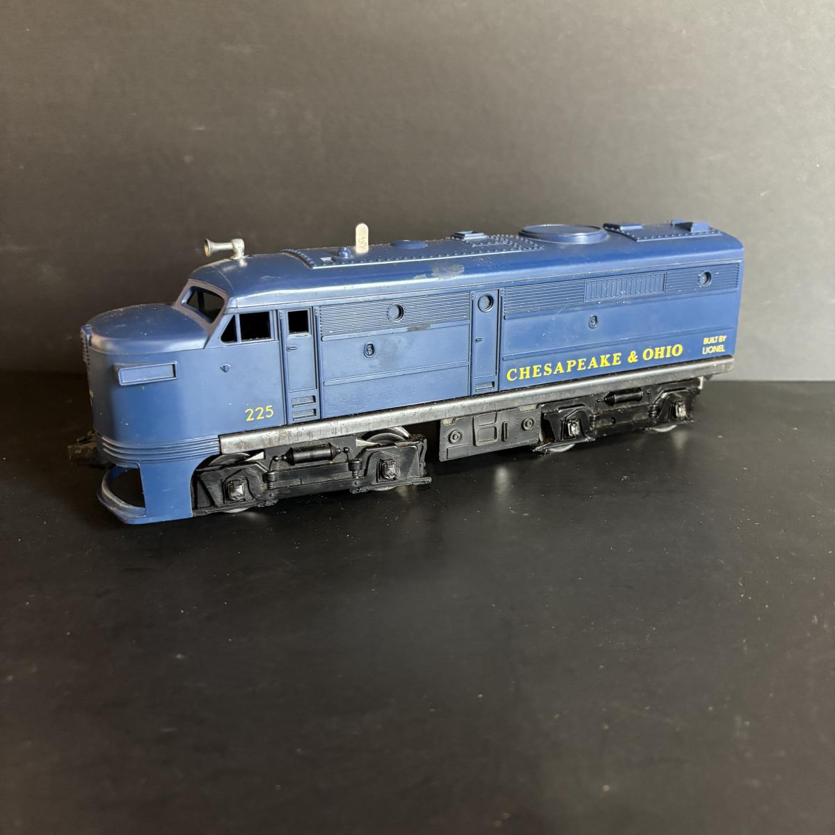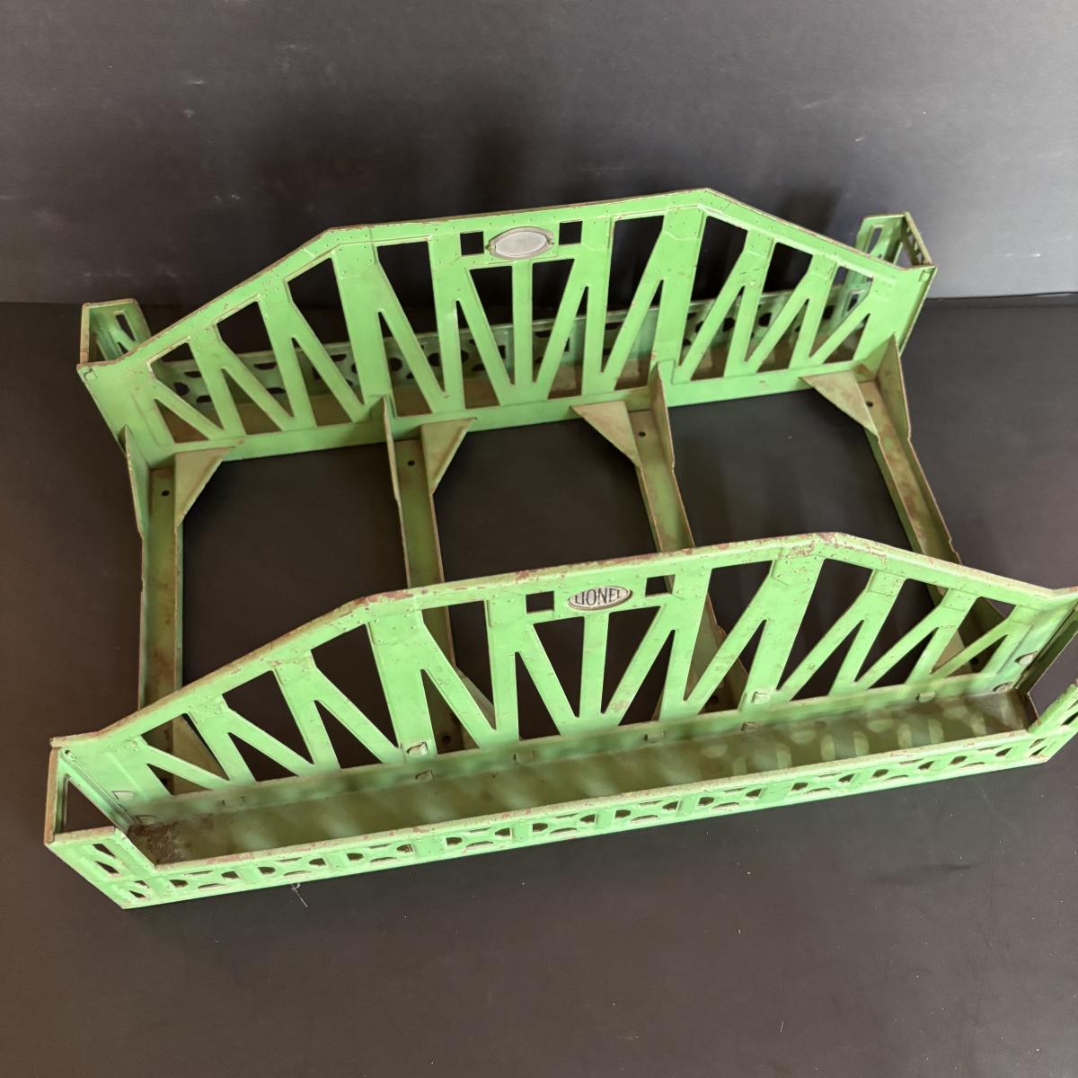 LOT 640: Lionel Chesapeake & Ohio No 225 Engine, Flatbed Train Car No 6630. Metal Bridge, D & R Bridge Piers, Lionel No. 110 Trestle Set, Cardboard Billboards & Empty Lionel Train Box