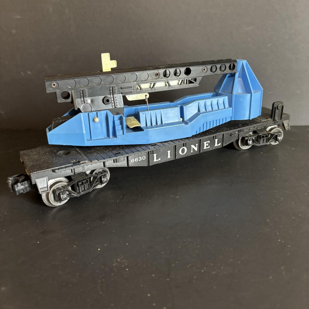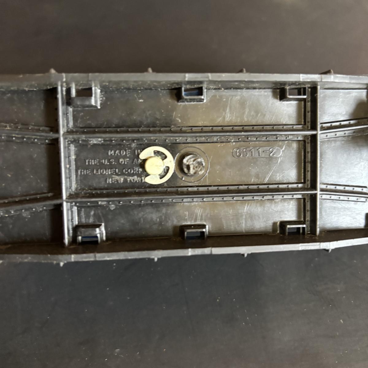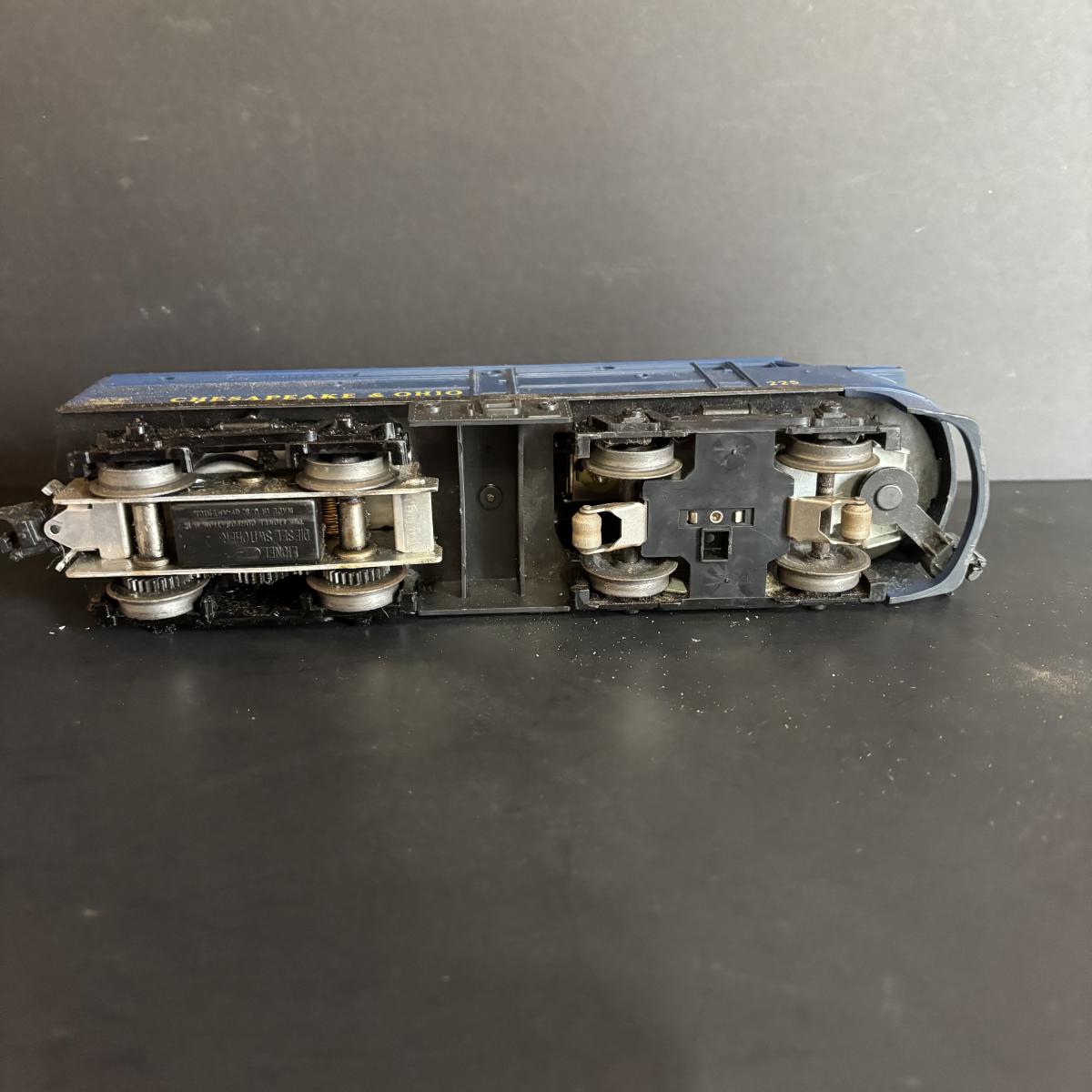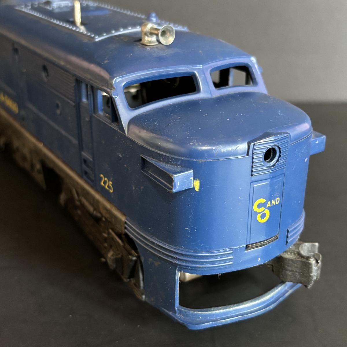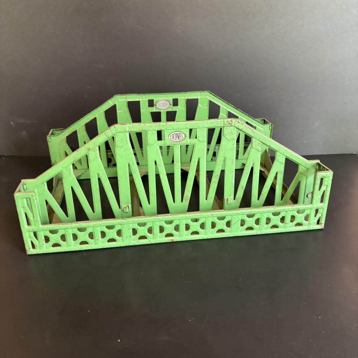 LOT 640: Lionel Chesapeake & Ohio No 225 Engine, Flatbed Train Car No 6630. Metal Bridge, D & R Bridge Piers, Lionel No. 110 Trestle Set, Cardboard Billboards & Empty Lionel Train Box