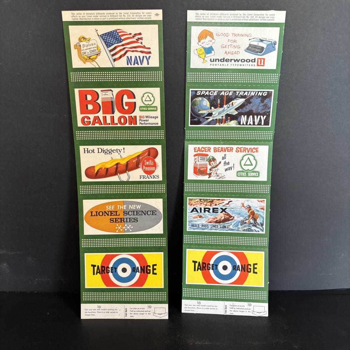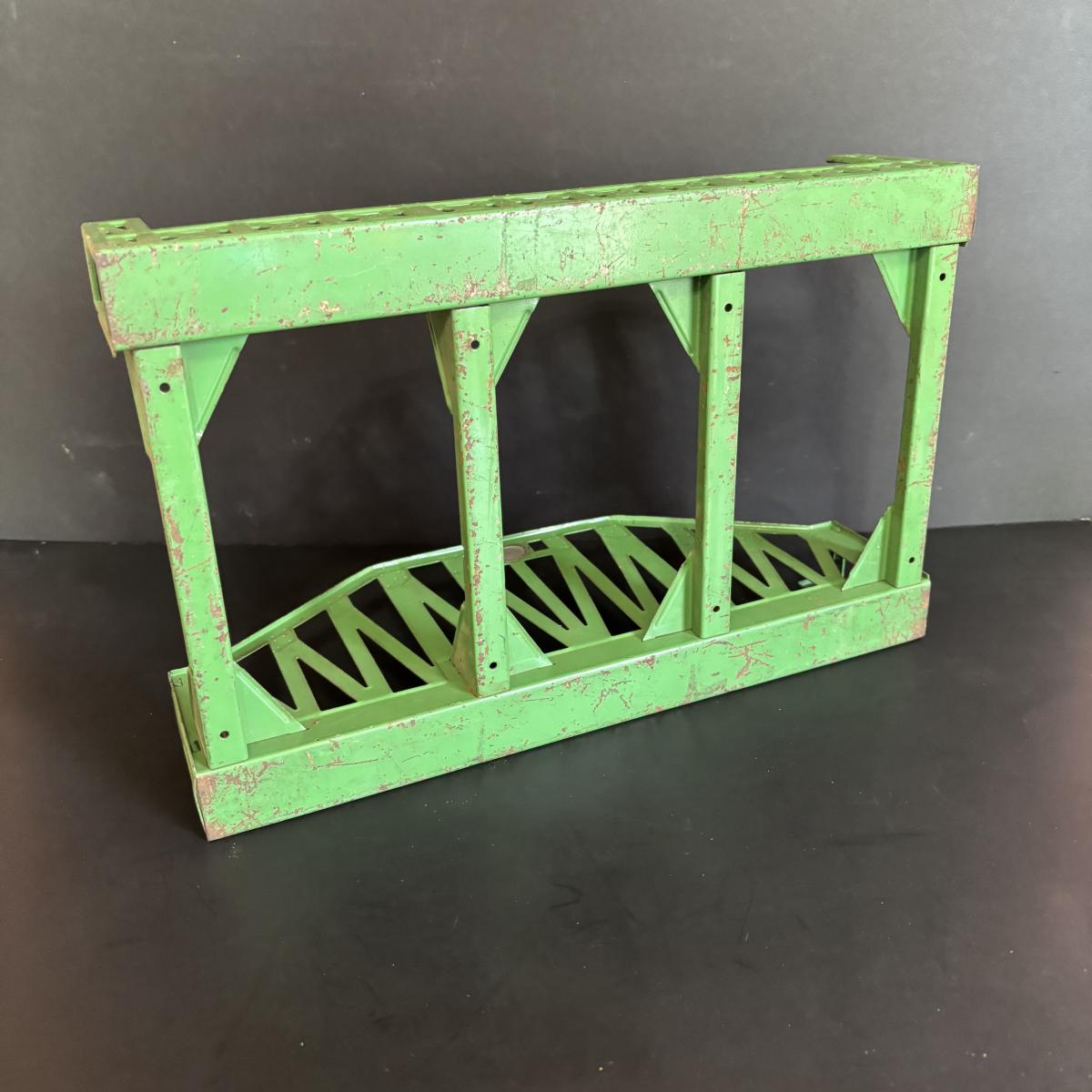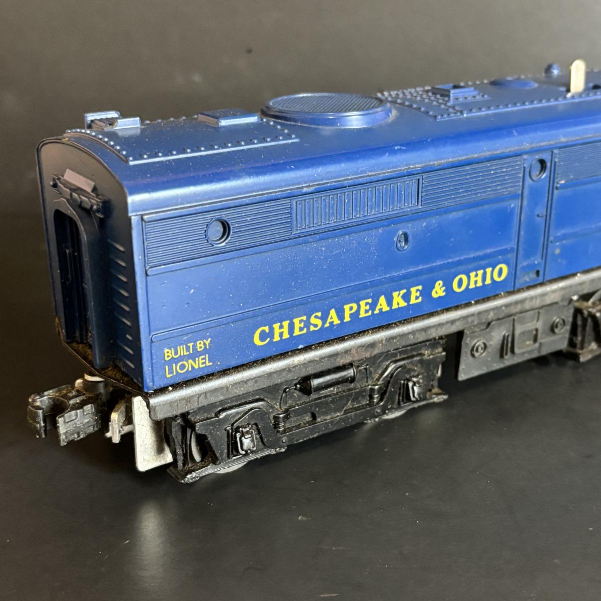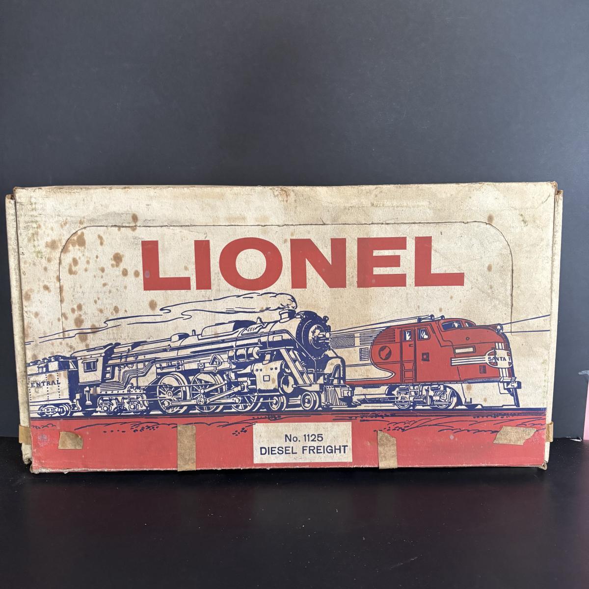 LOT 640: Lionel Chesapeake & Ohio No 225 Engine, Flatbed Train Car No 6630. Metal Bridge, D & R Bridge Piers, Lionel No. 110 Trestle Set, Cardboard Billboards & Empty Lionel Train Box