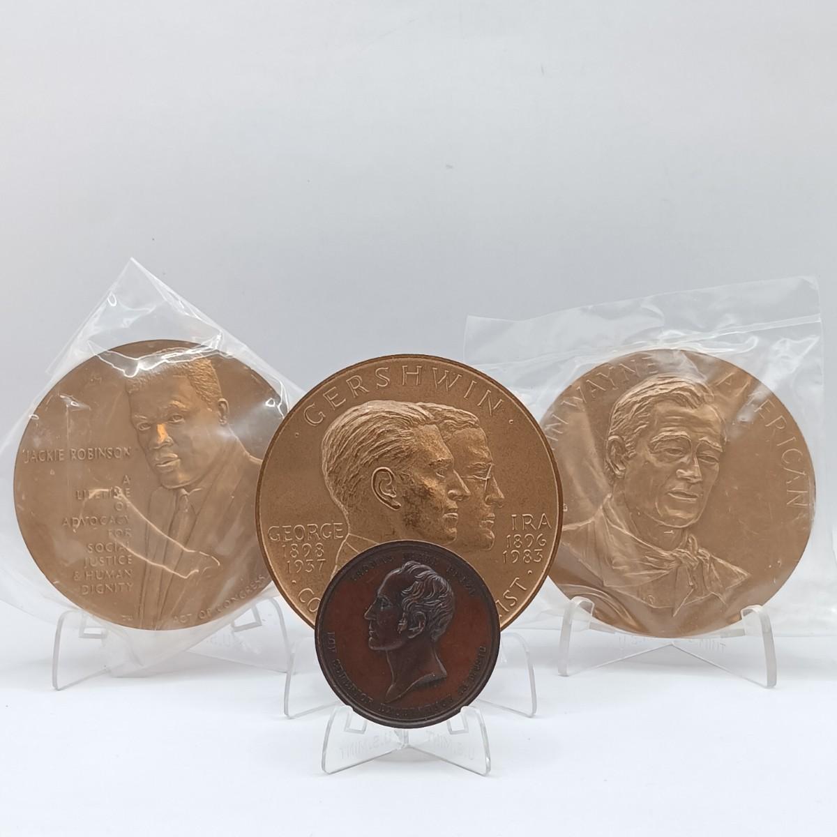 LOT 12: Set of 4 Metal Medallions- Pittsburgh Female College, Gershwin 1985, Jackie Robinson & John Wayne