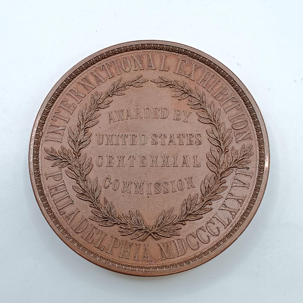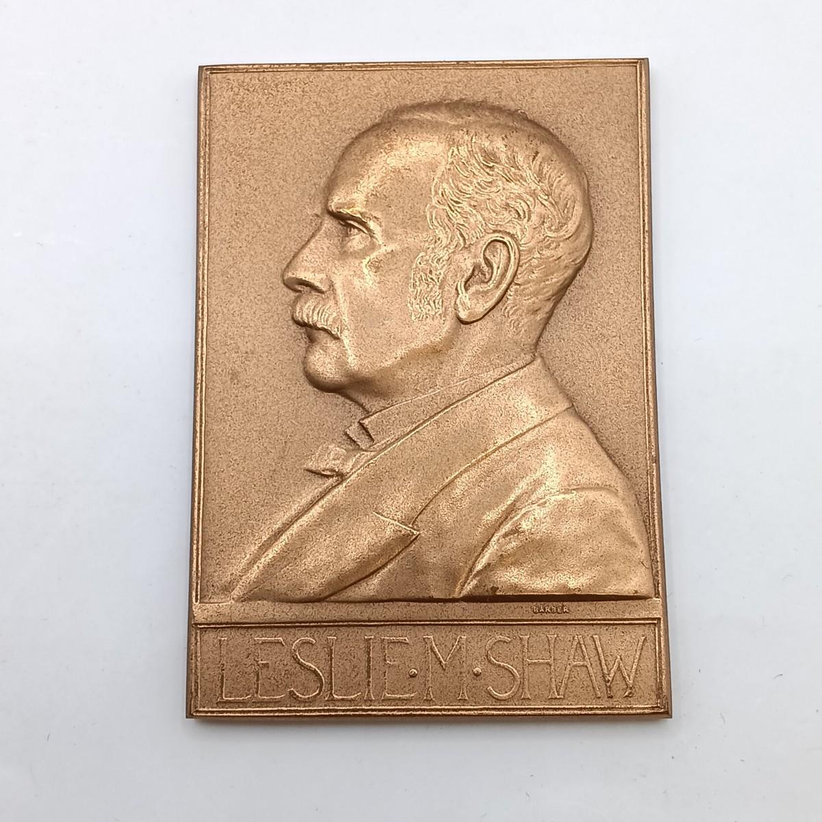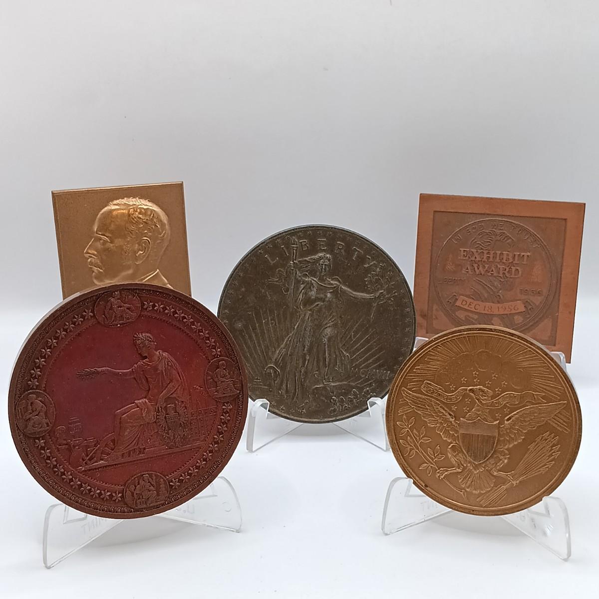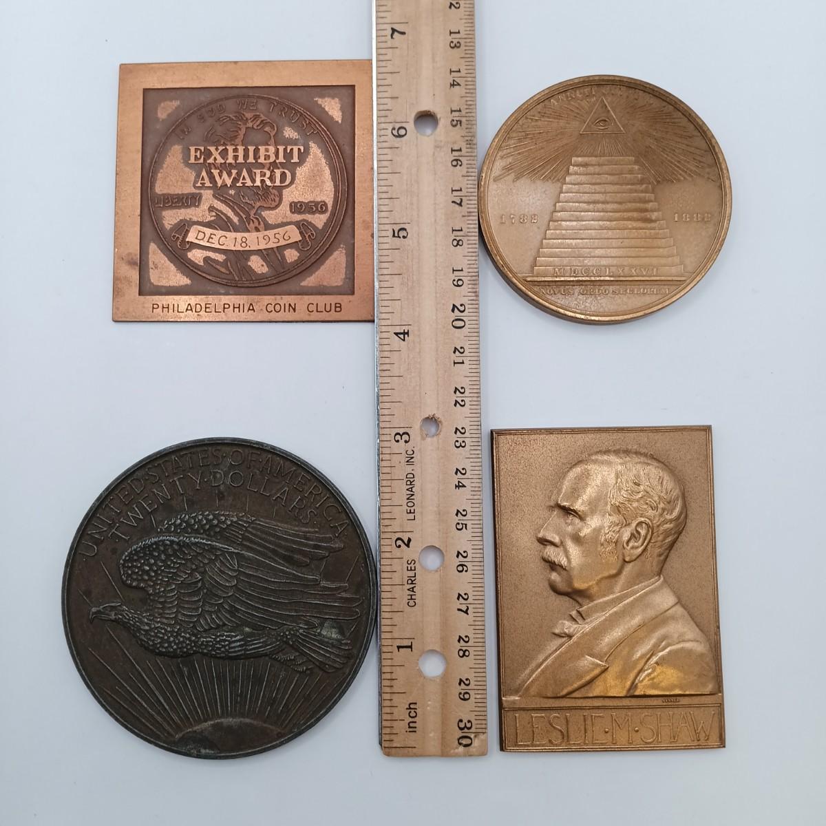 LOT 16: Set of 4 Metal Medallions with Coin Club Plaque- Philadelphia Centennial Exposition, Leslie M. Shaw & More