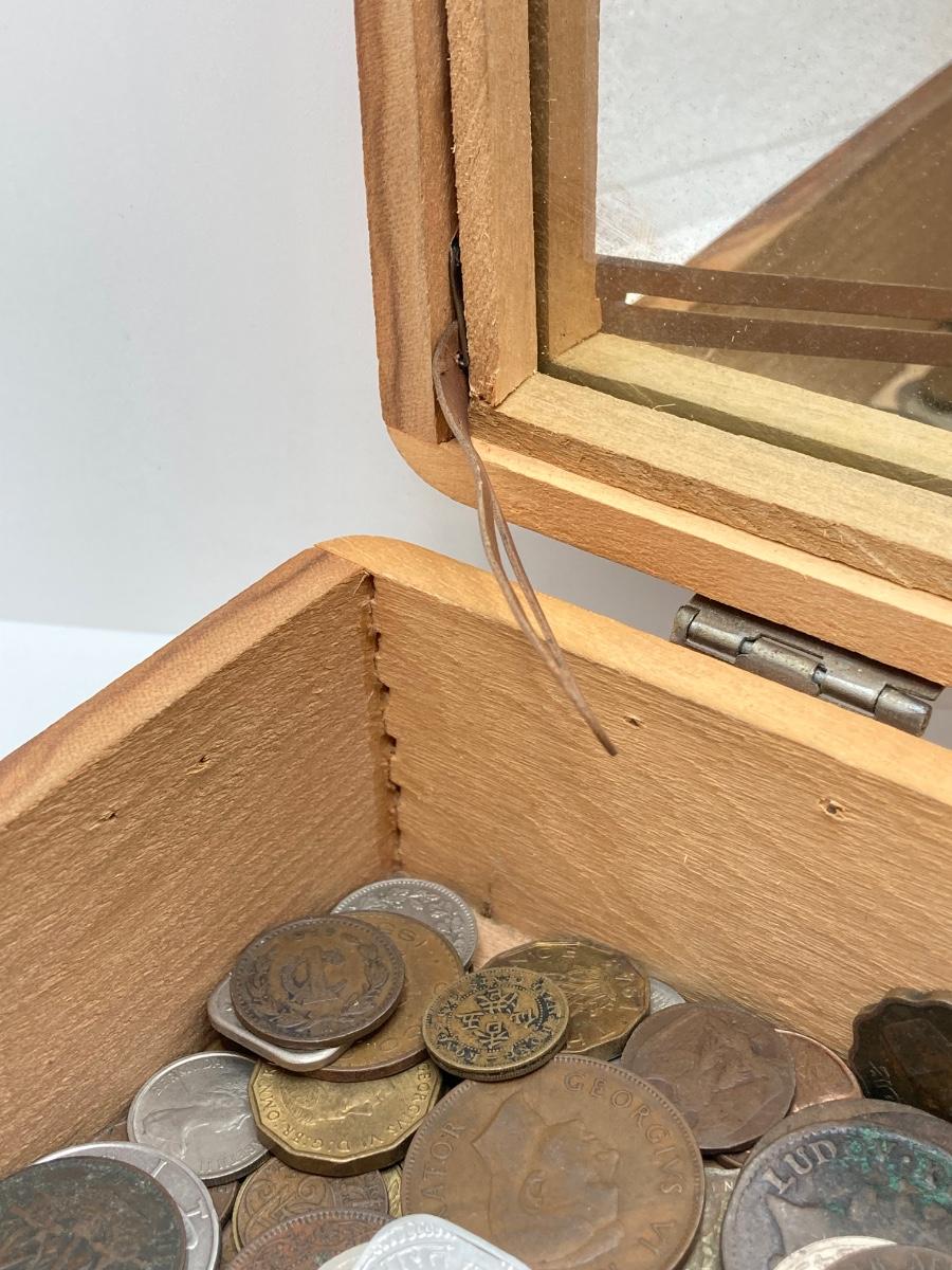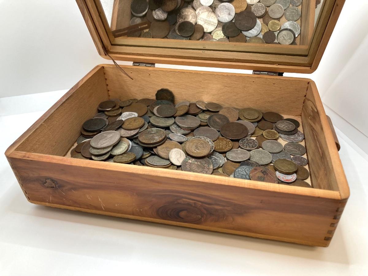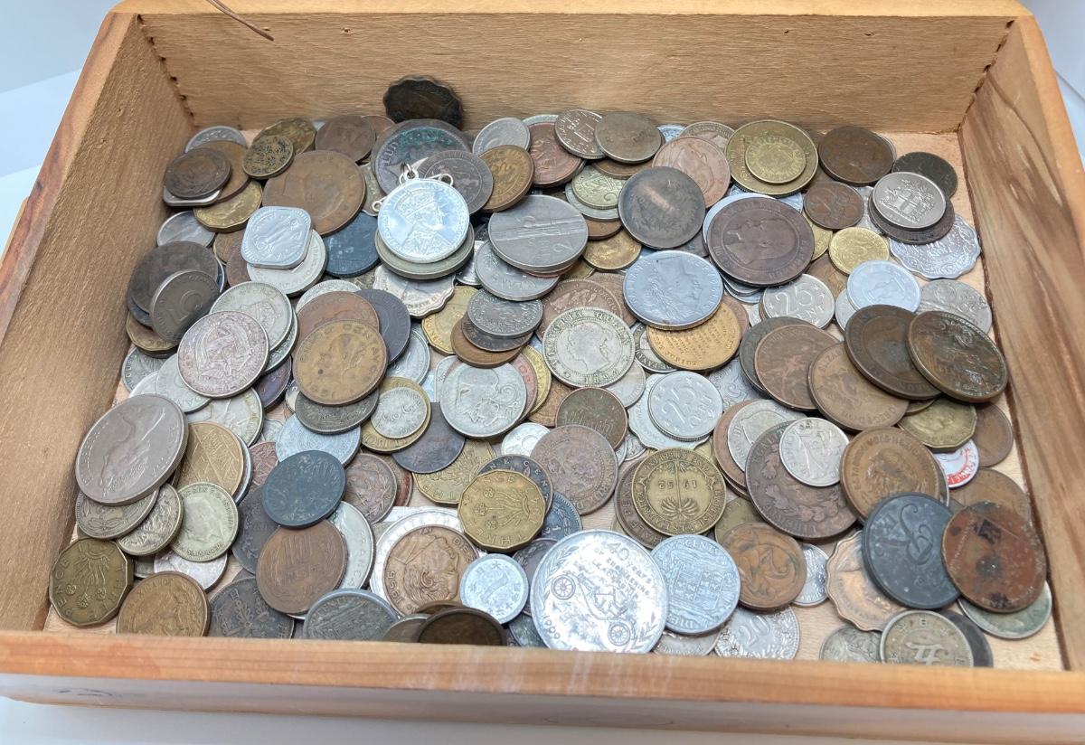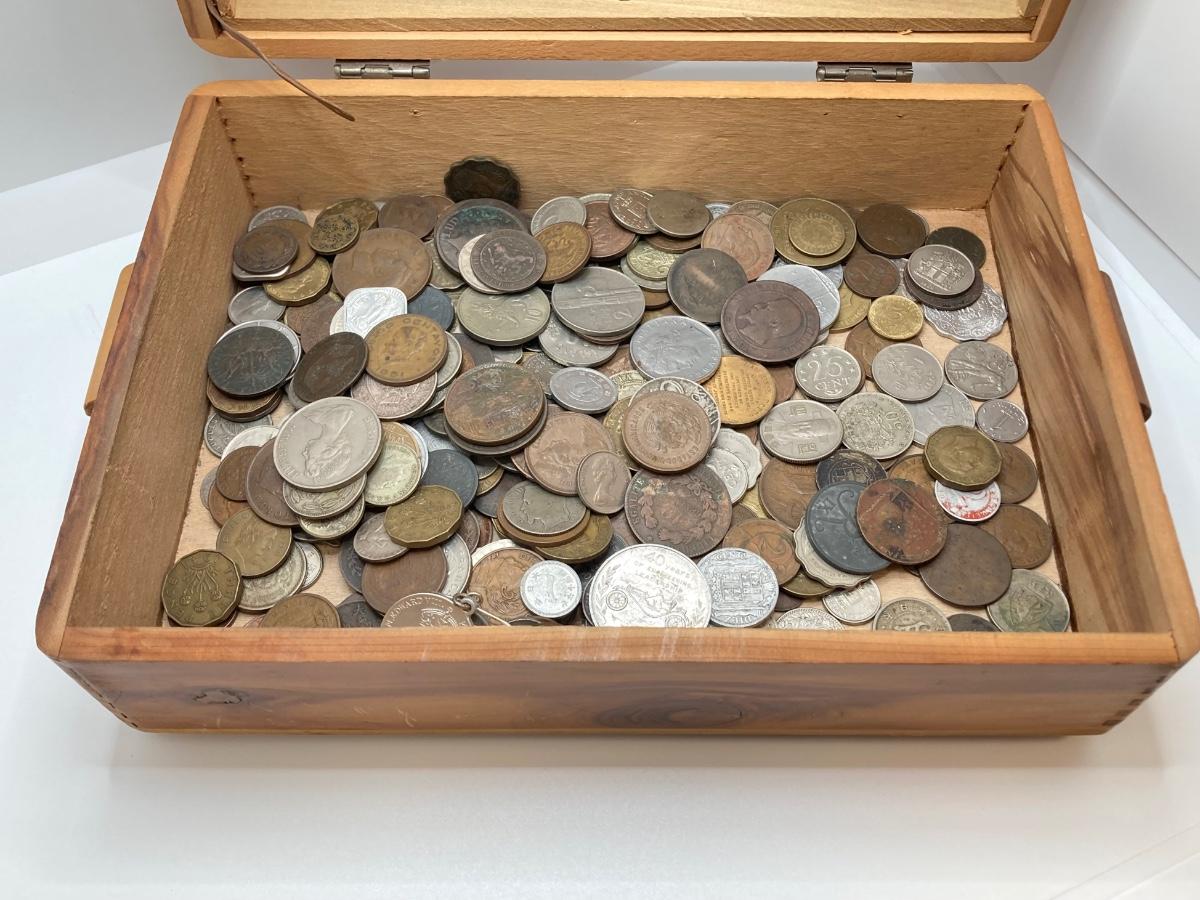 LOT 42: Vintage Cedar Box with Assorted Coins / Tokens