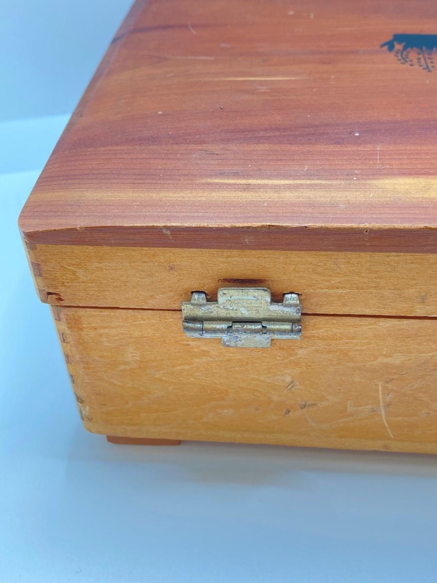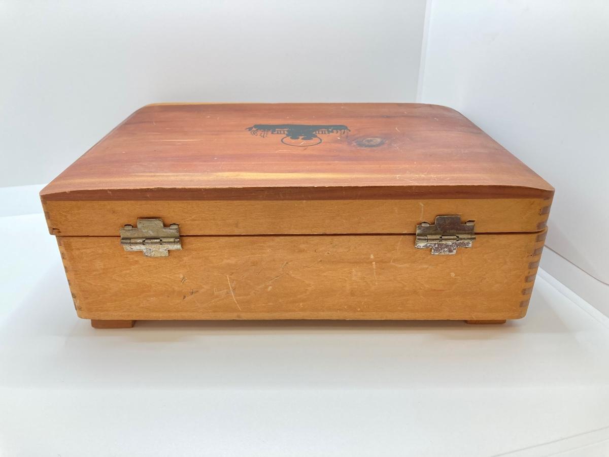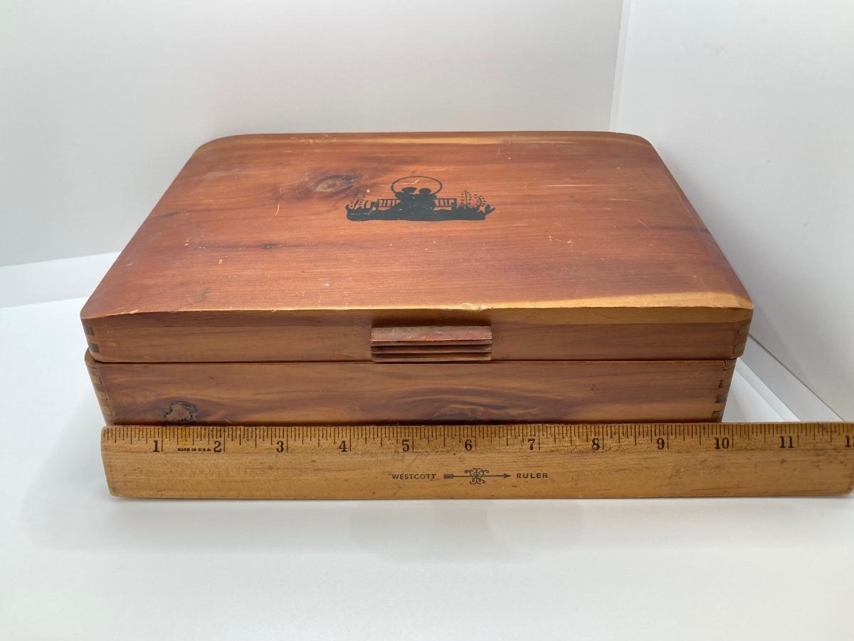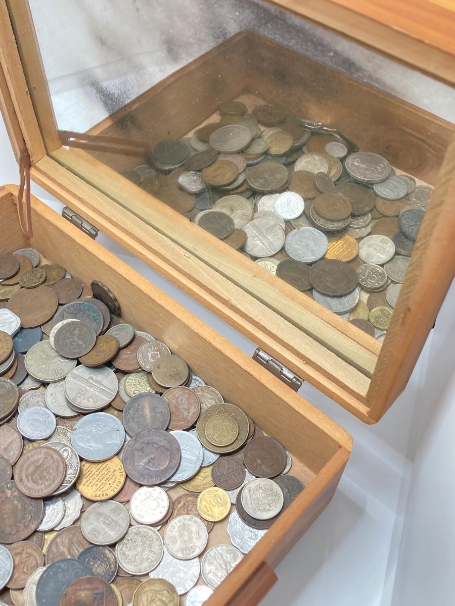 LOT 42: Vintage Cedar Box with Assorted Coins / Tokens