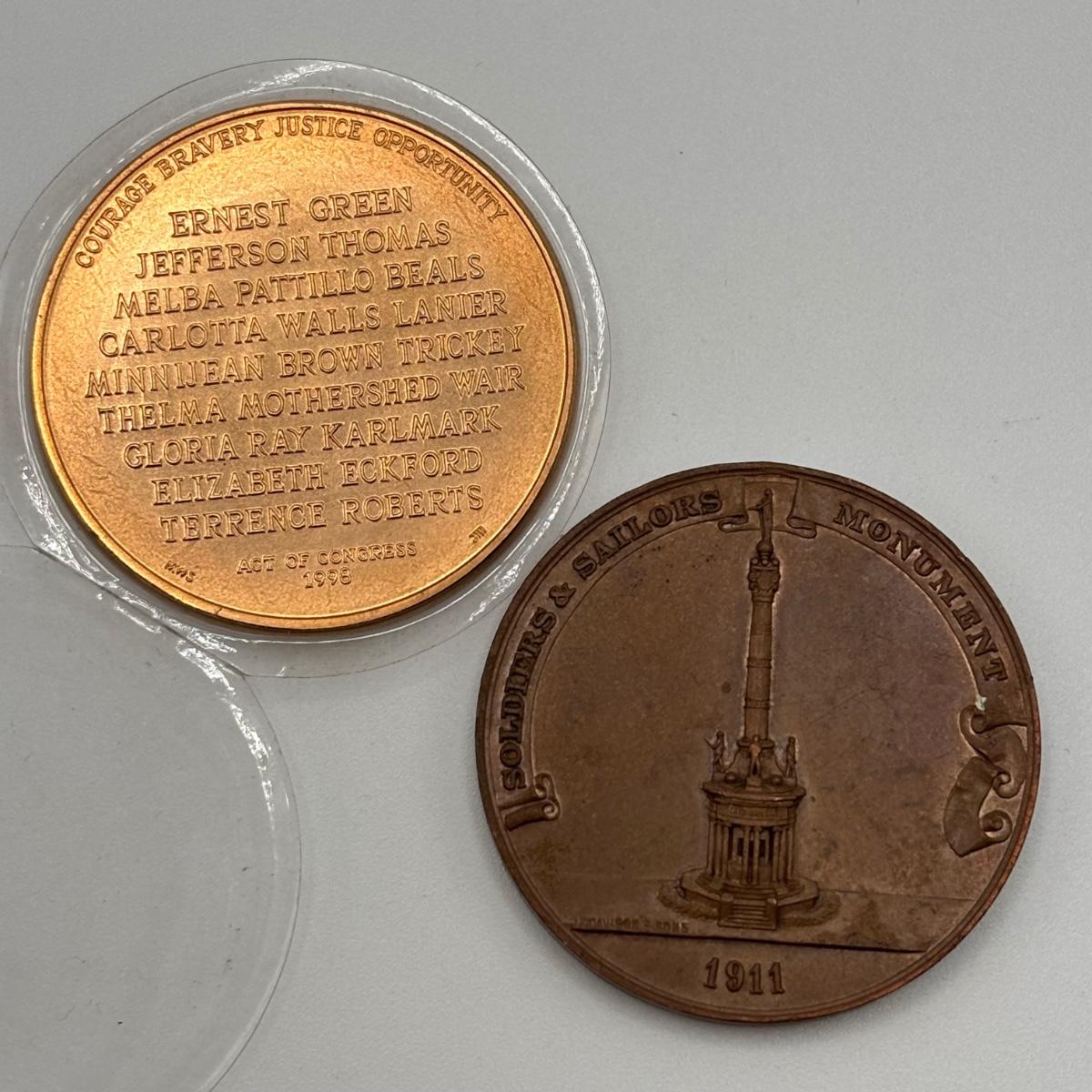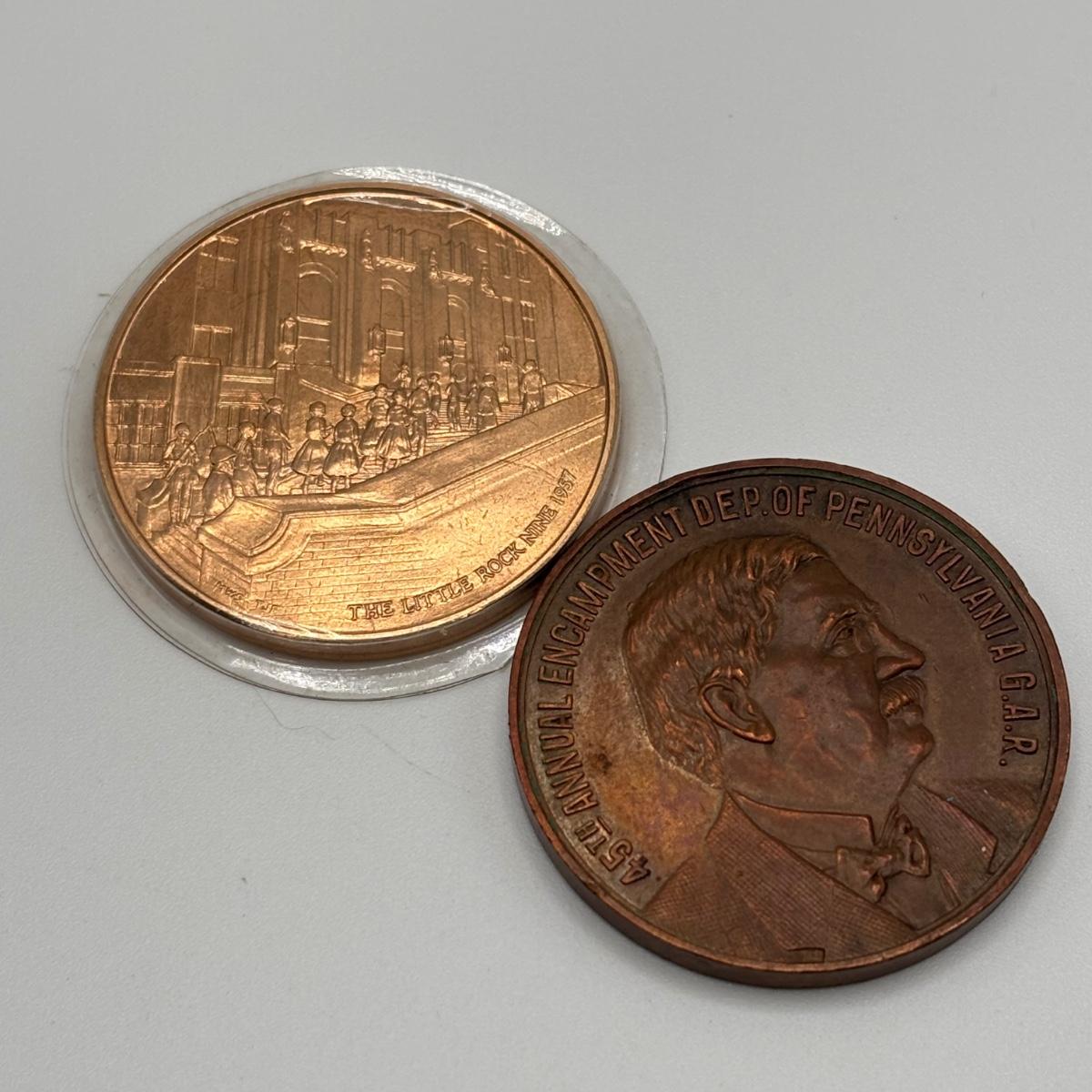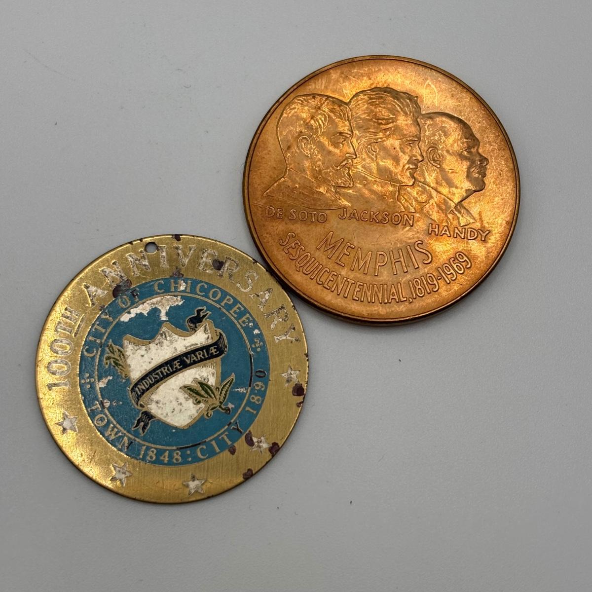 LOT 105: Medal/Medallions: US Centennial Exposition Philadelphia Medal, Soldiers & Sailors Monument, PA 45th Encampment GAR, 150th Anniversary of Memphis Tennessee, Chicopee Town