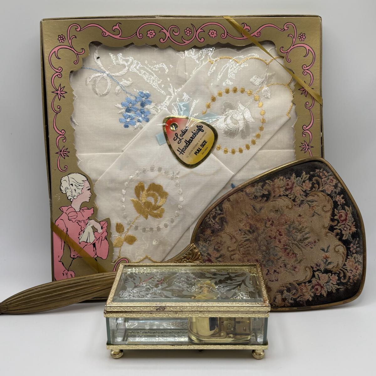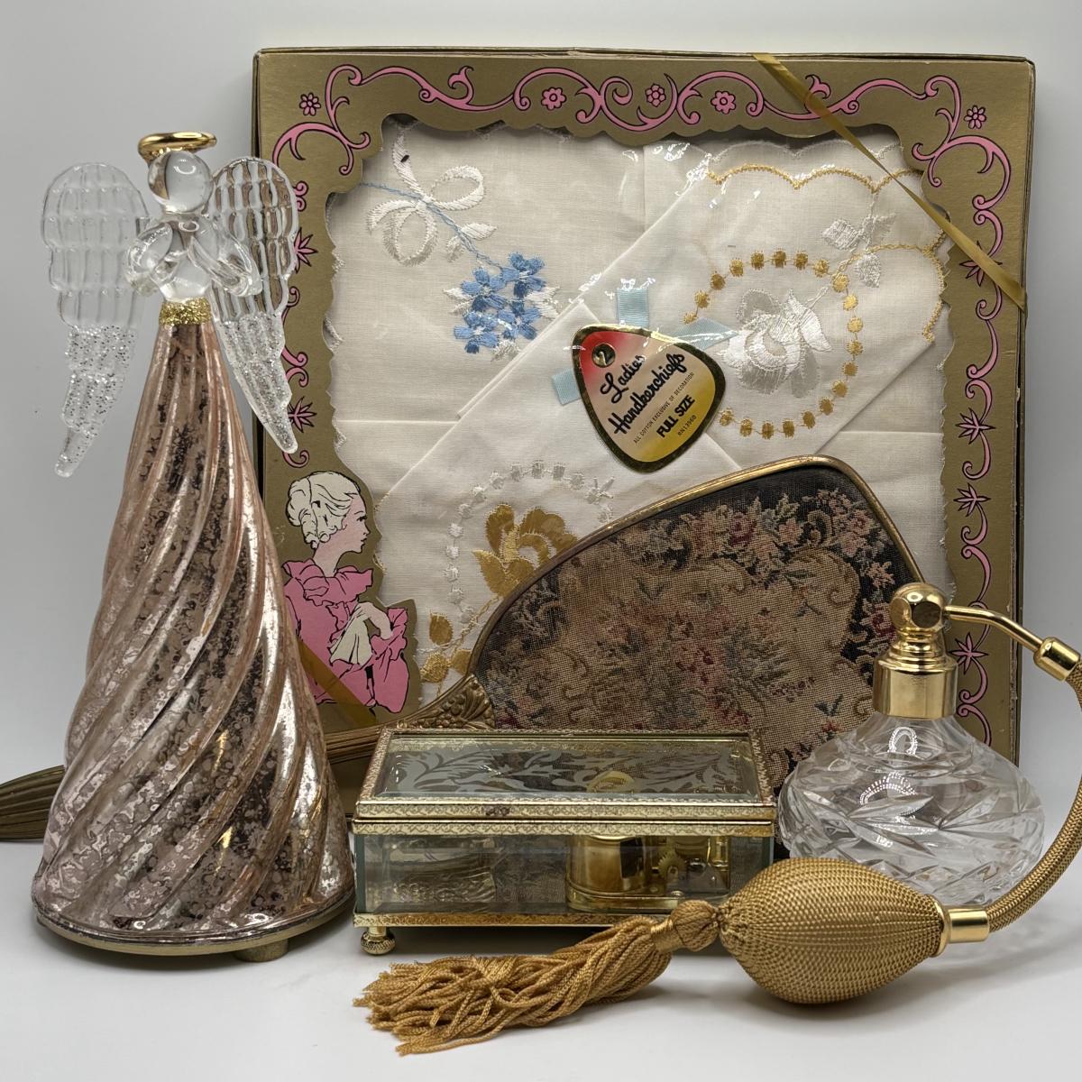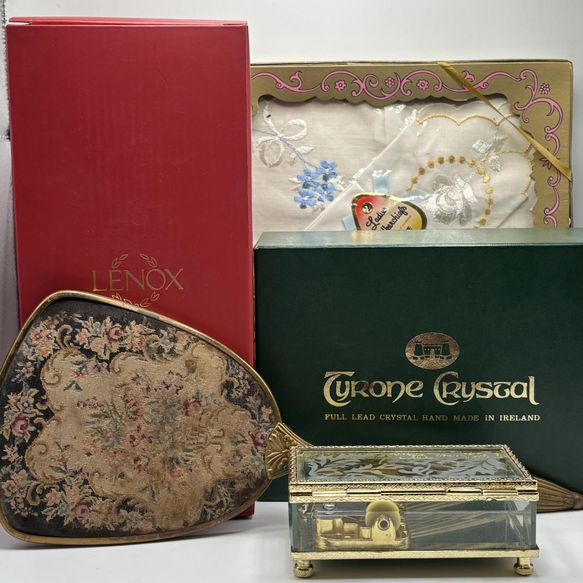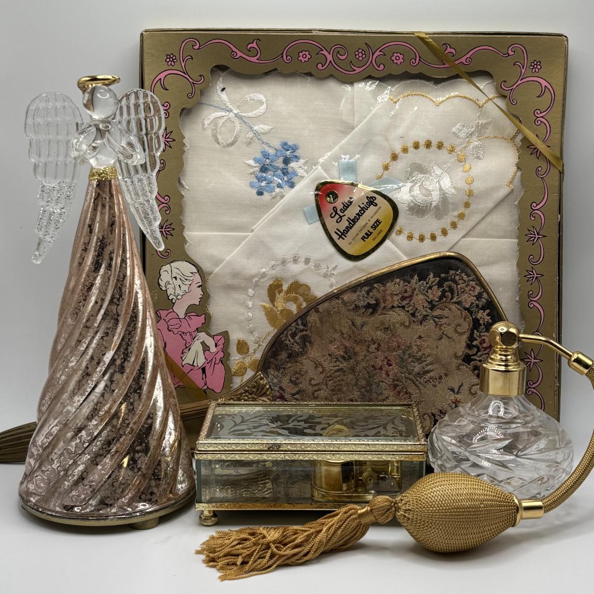 LOT 139: Lovely Ladies Dresser Collection: Vintage Tyrone Crystal Signed Cut Glass Tasseled Perfume Atomizer, Lenox Angel, Boxed Handkerchiefs, Music Box & Mirror