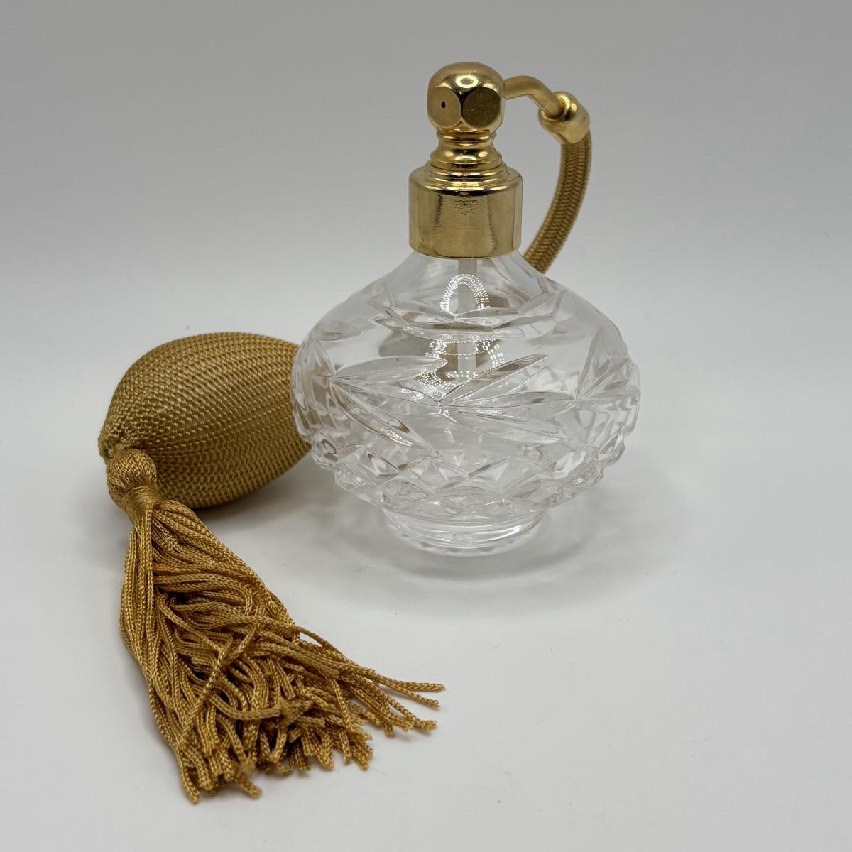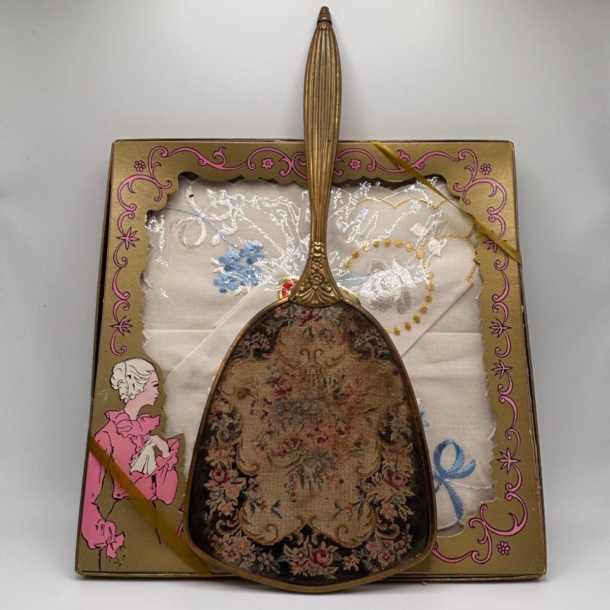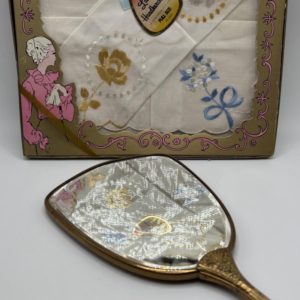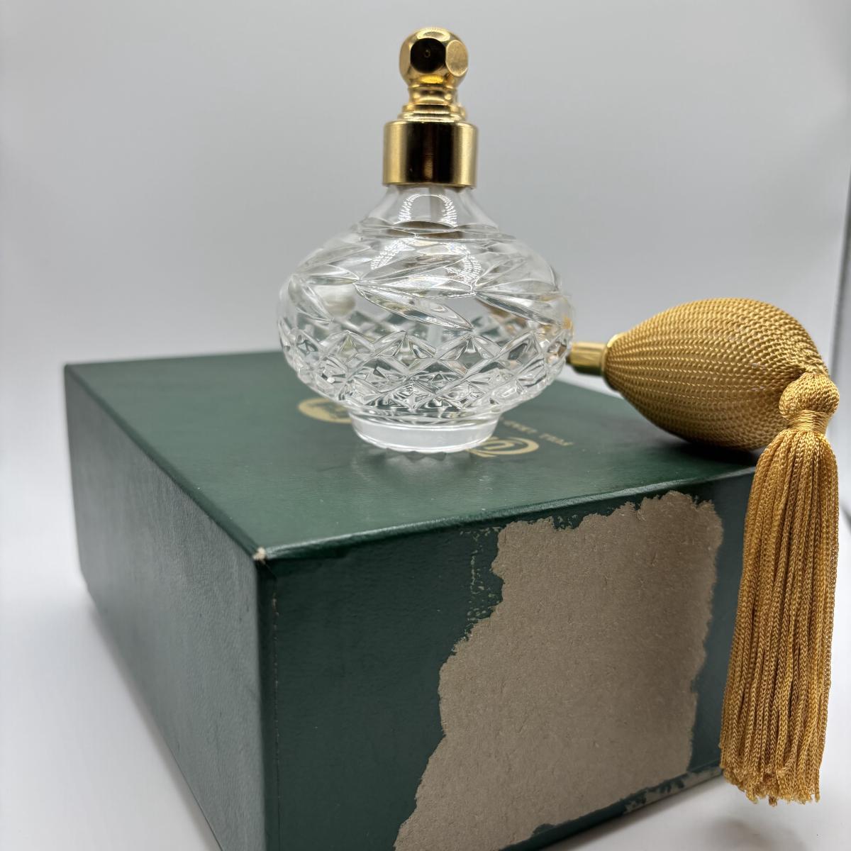 LOT 139: Lovely Ladies Dresser Collection: Vintage Tyrone Crystal Signed Cut Glass Tasseled Perfume Atomizer, Lenox Angel, Boxed Handkerchiefs, Music Box & Mirror