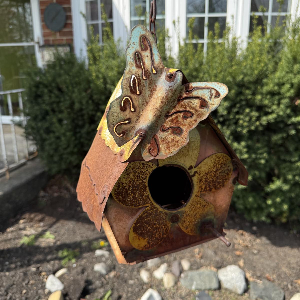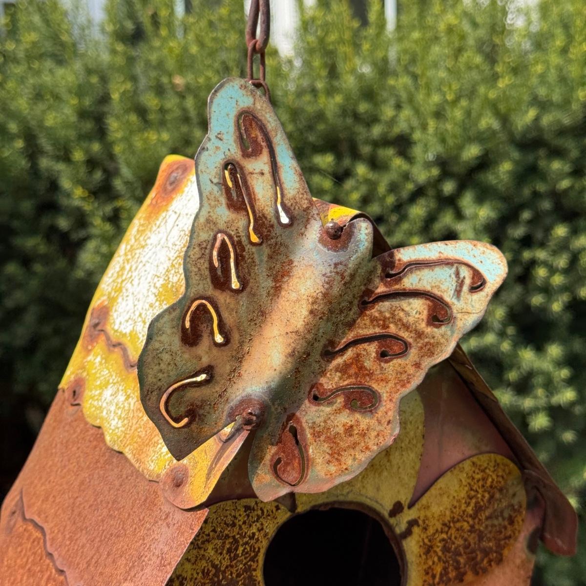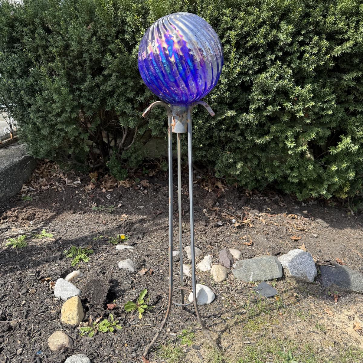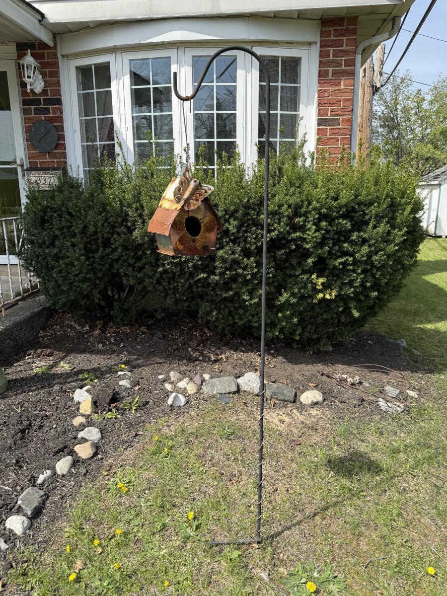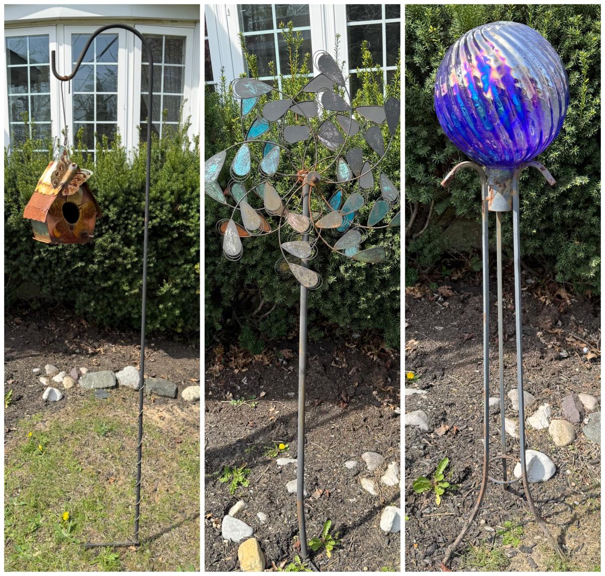 LOT 30: Garden Stake Metal Birdhouse w/ Shepherd's Hook, Wind Sculpture & Gazing Ball