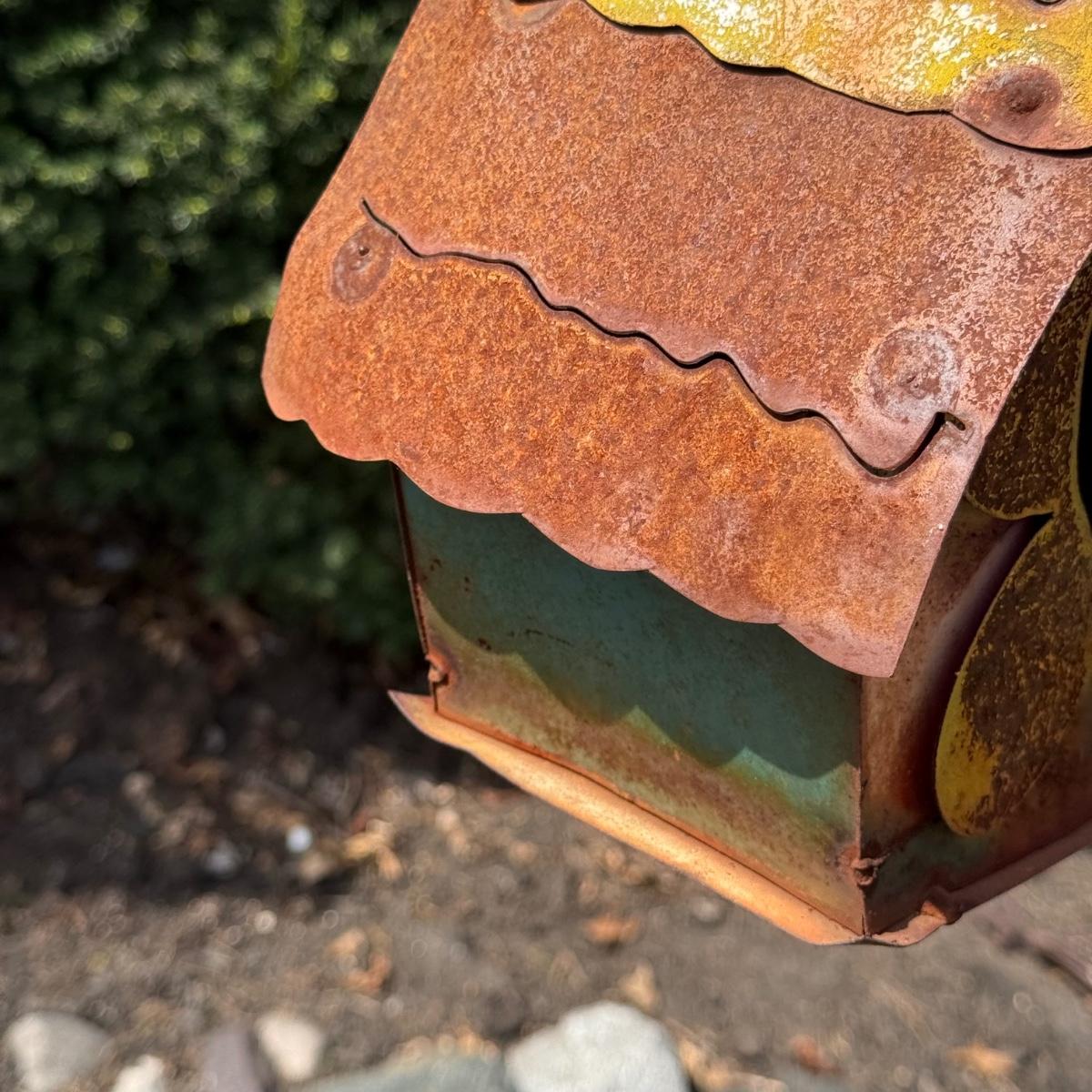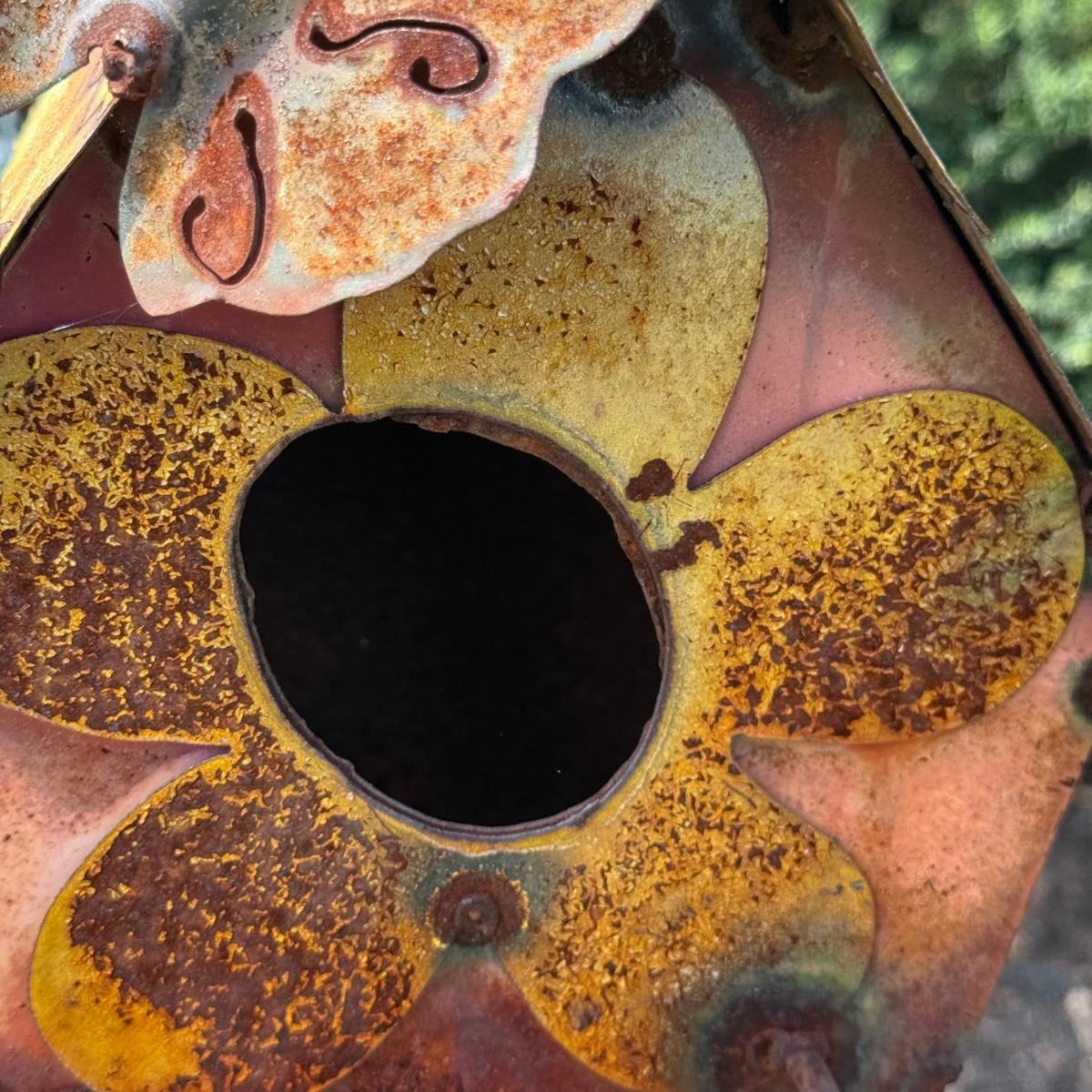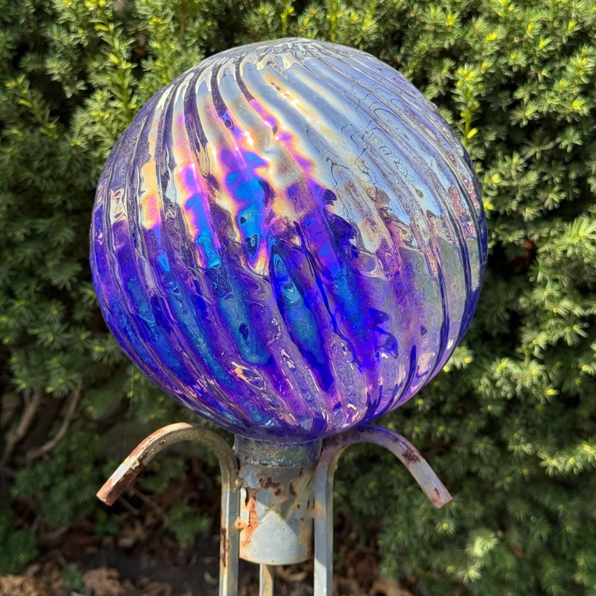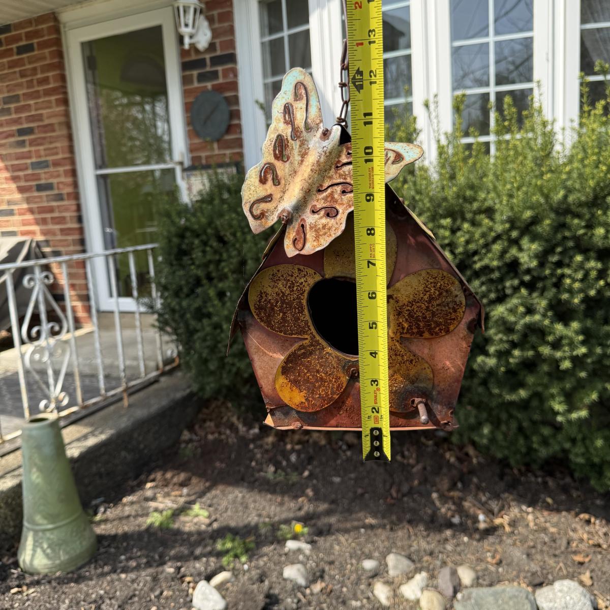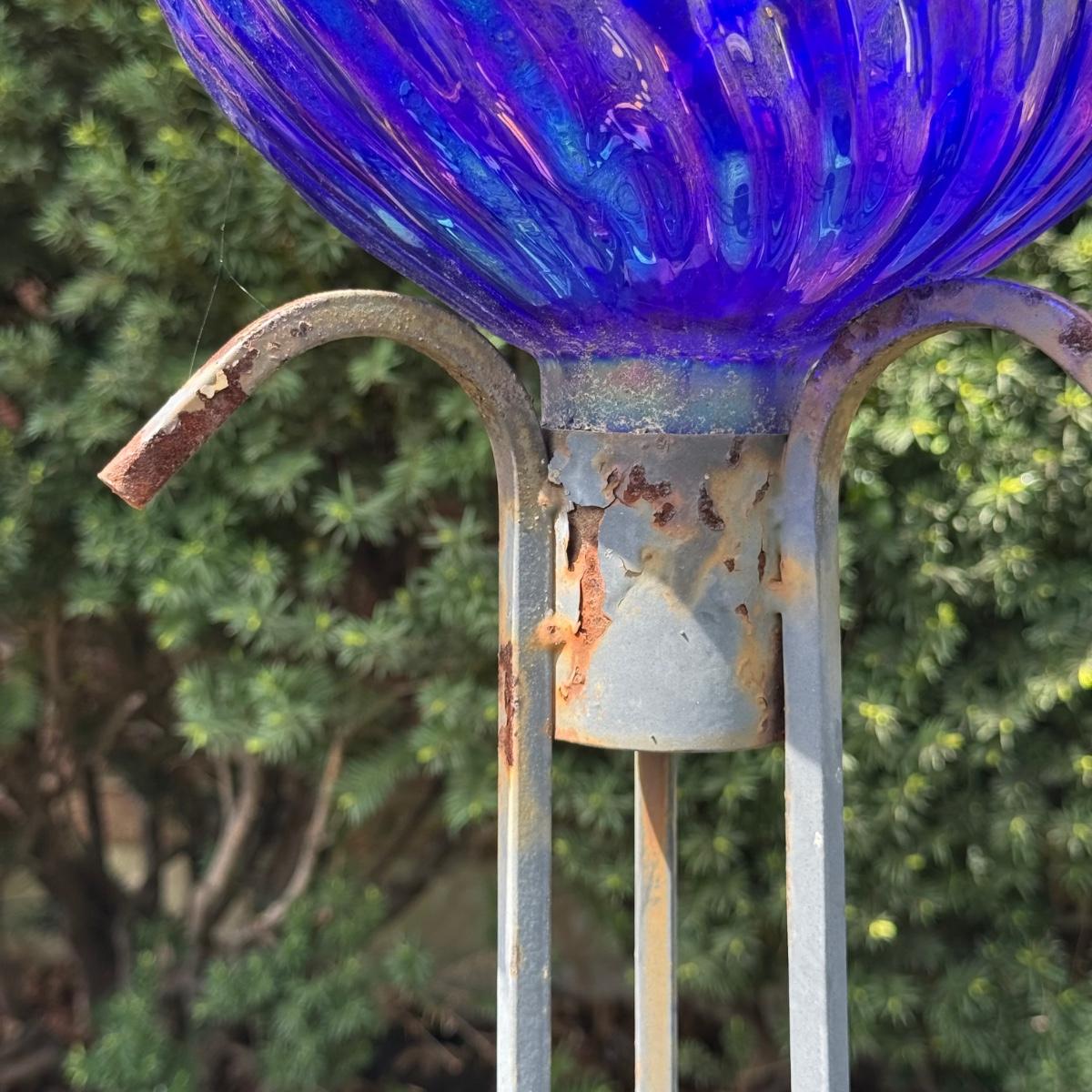 LOT 30: Garden Stake Metal Birdhouse w/ Shepherd's Hook, Wind Sculpture & Gazing Ball