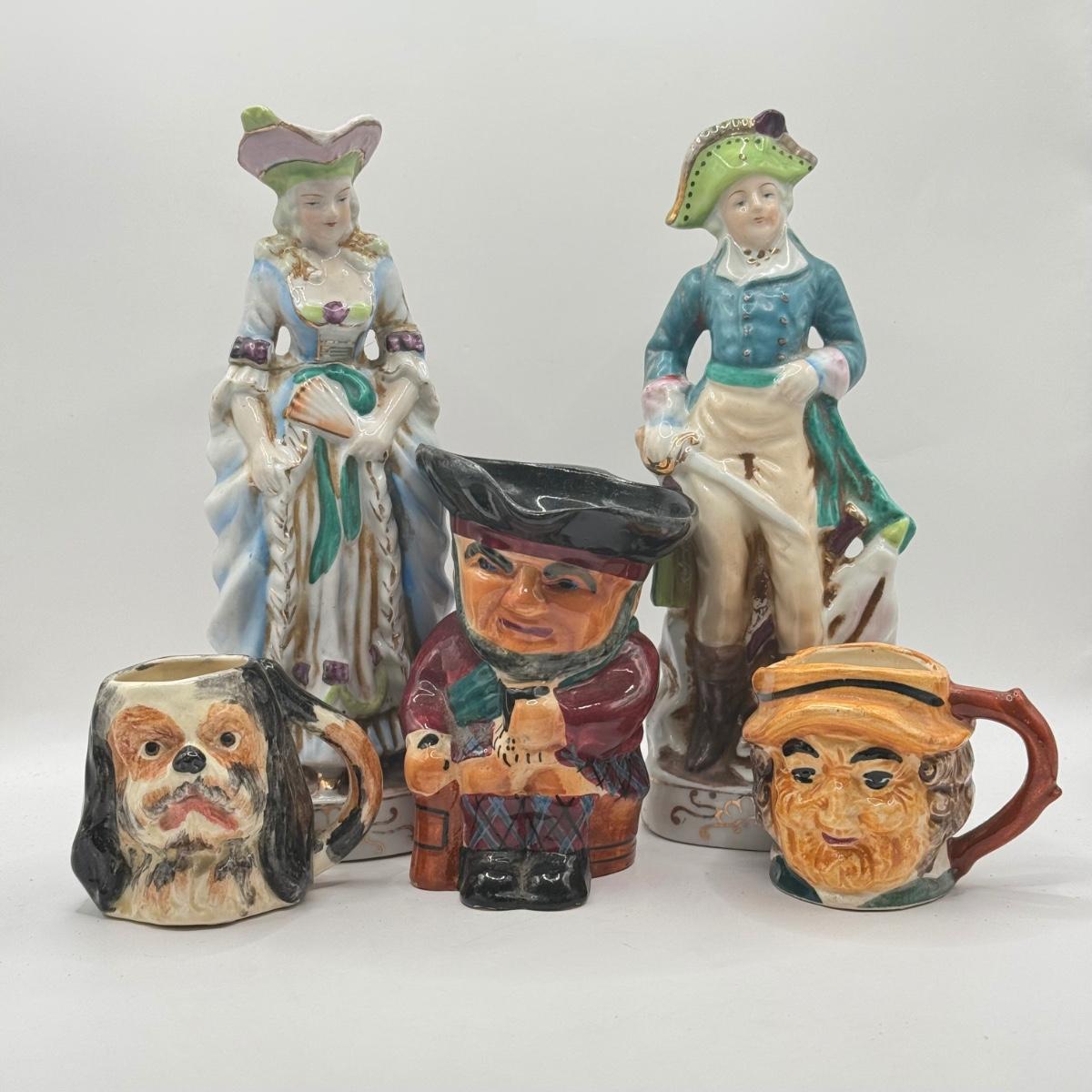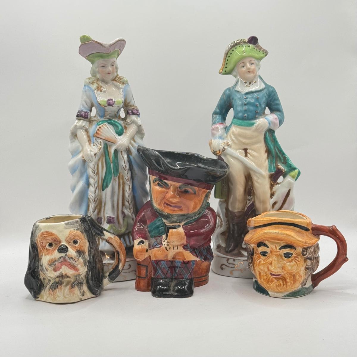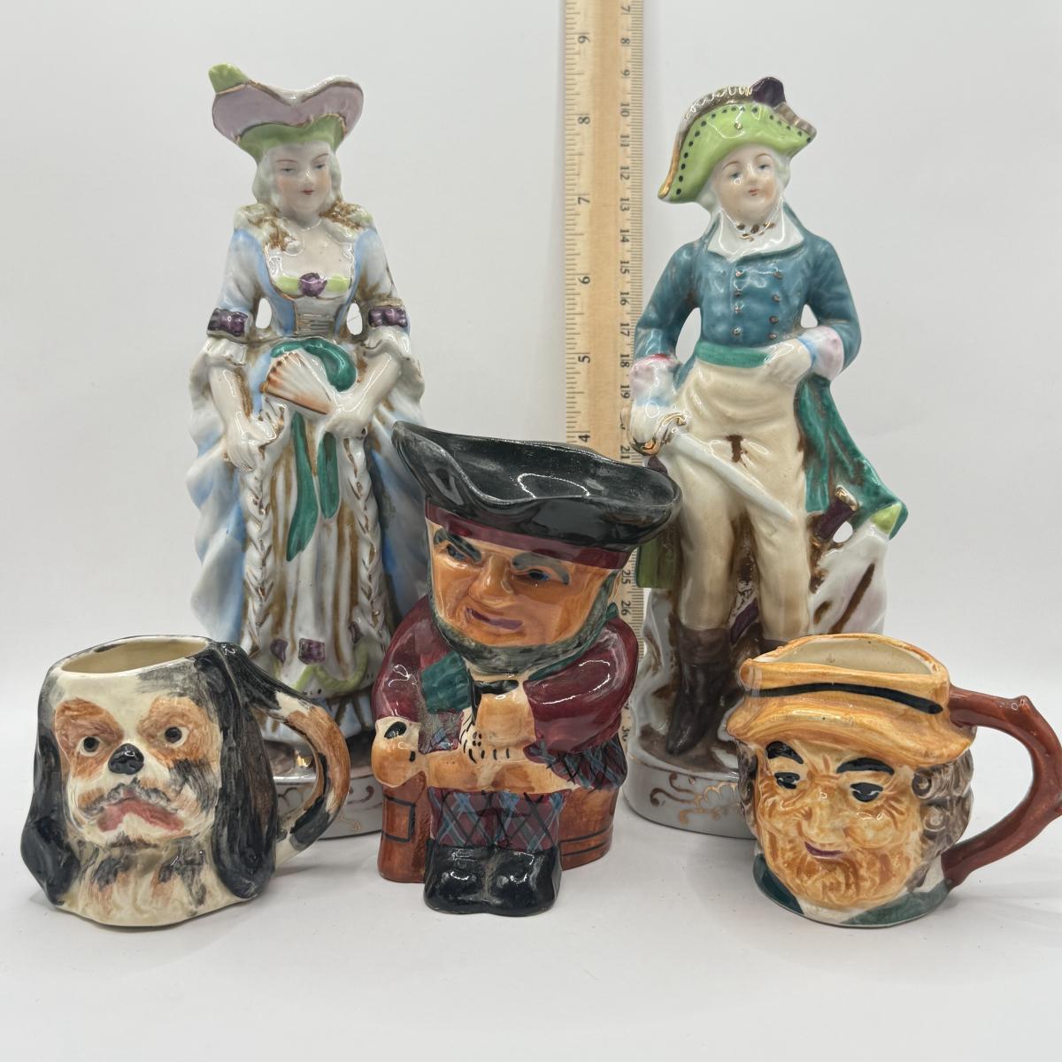 LOT 48K: 20th Century Lord & Lady Figurines Made in Japan, Staffordshire Shorter & Sons Toby Pitcher, Face Toby Mug made in Occupied Japan & Vintage Hand Painted King Charles Spaniel Toby Mug