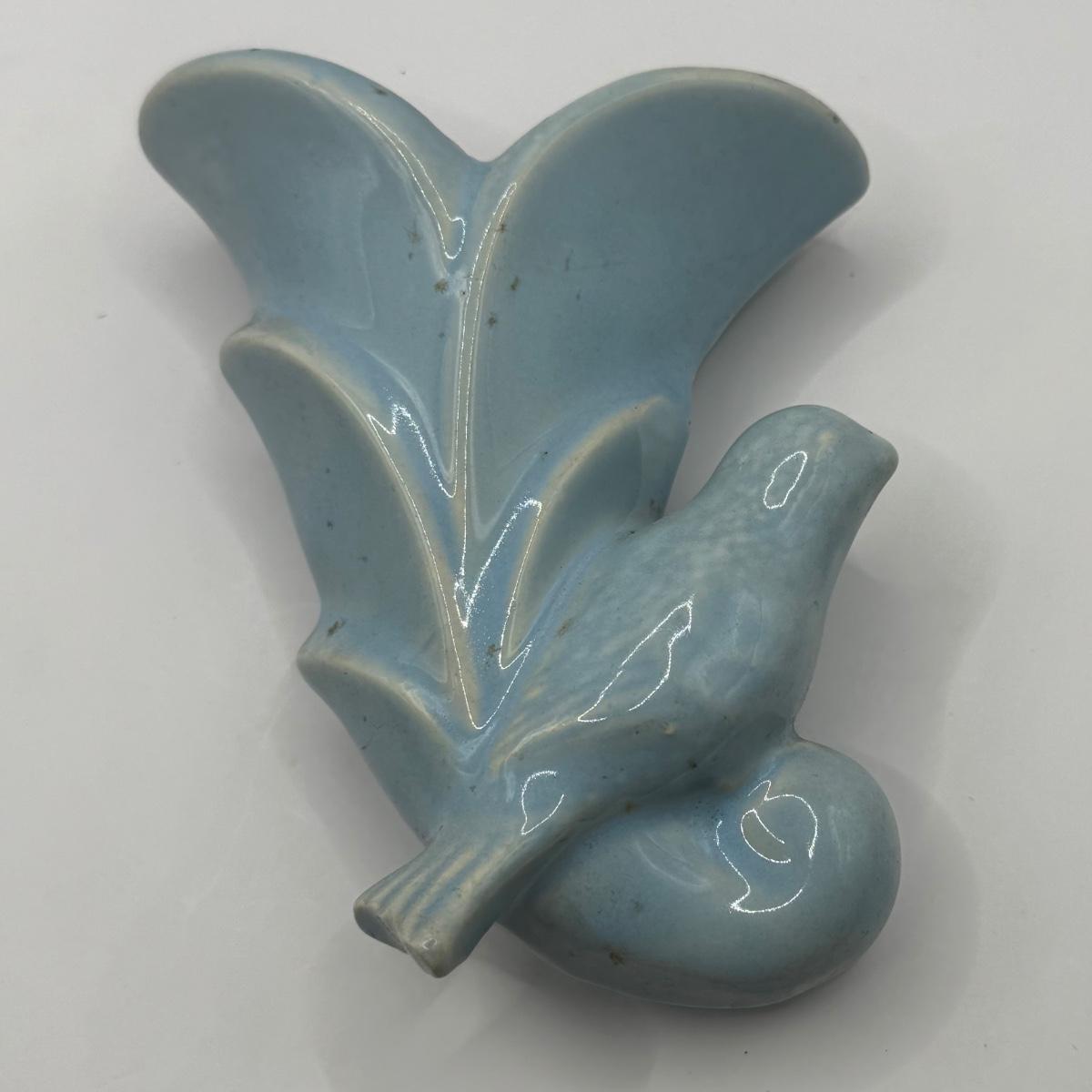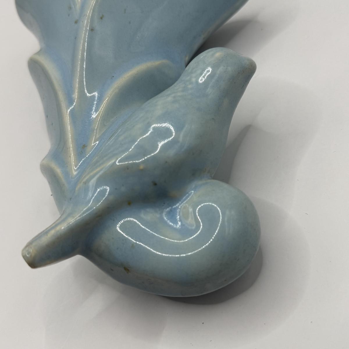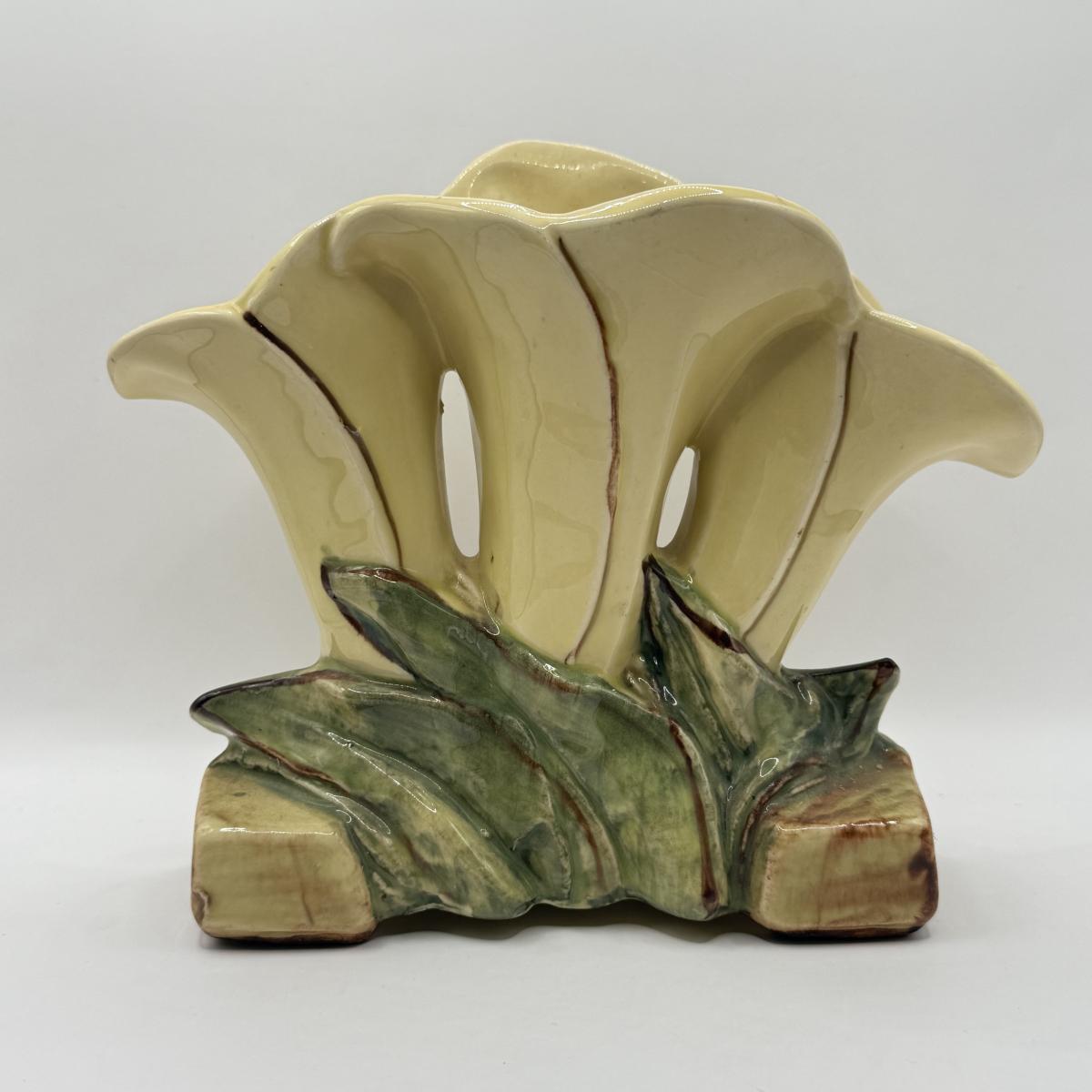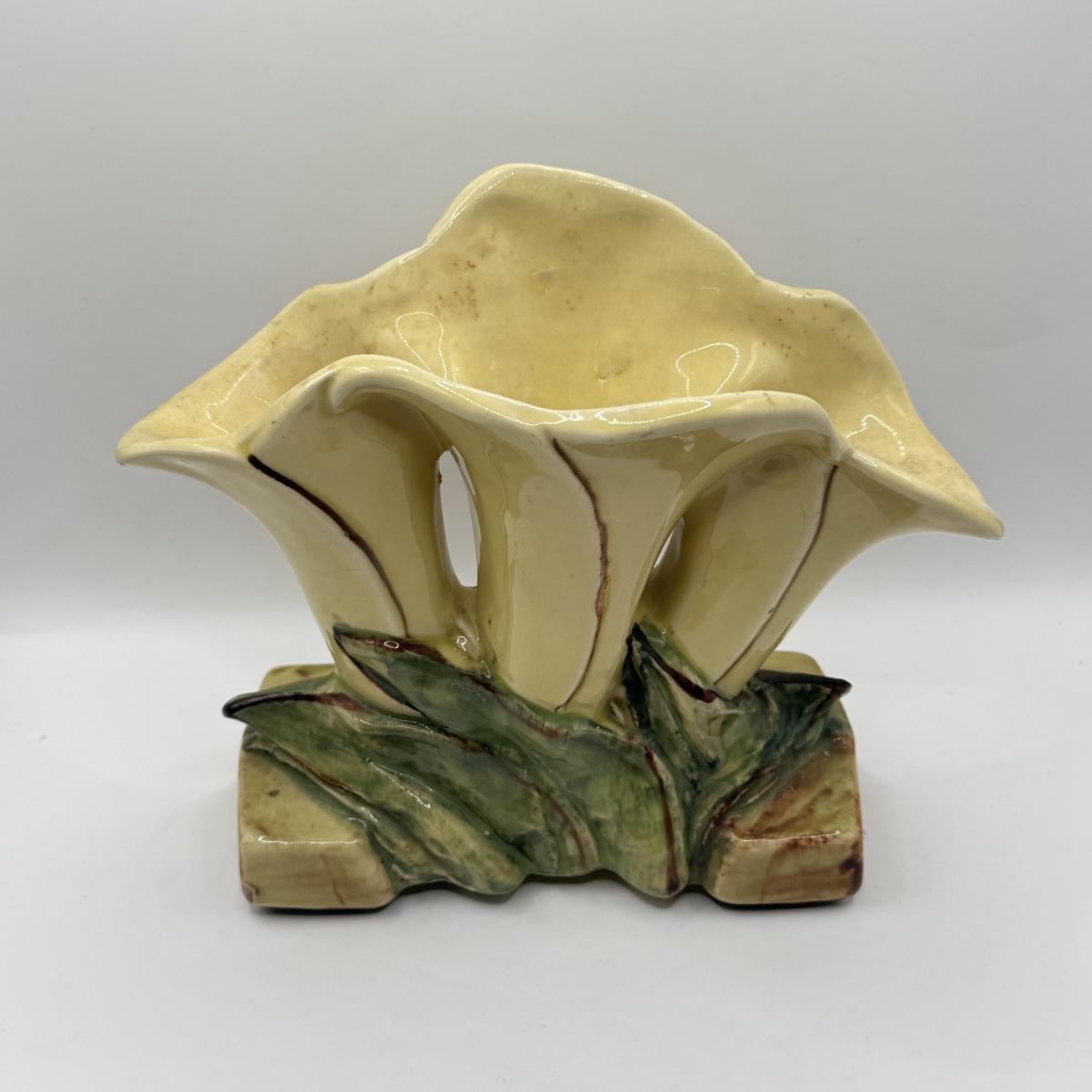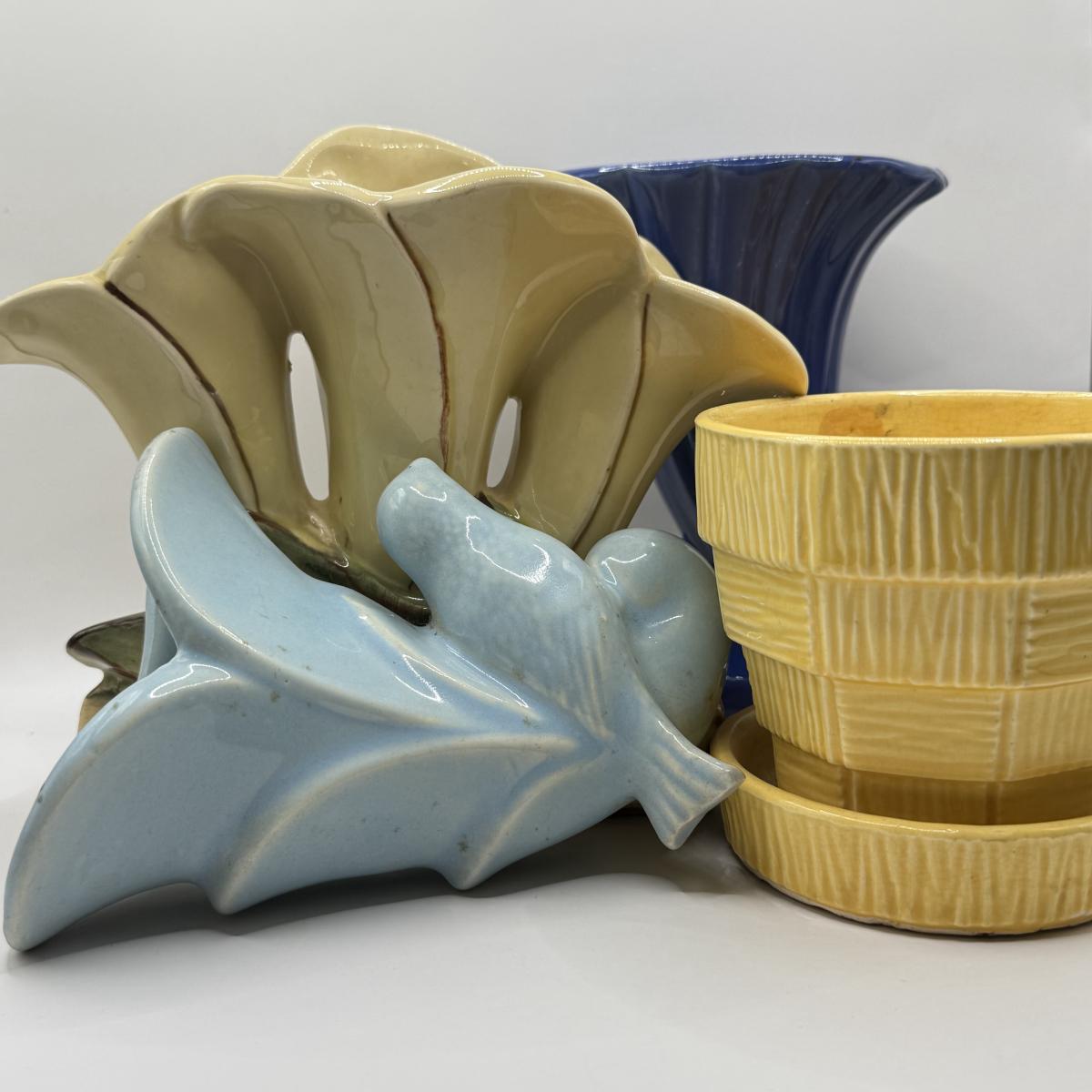 LOT 50K: Collection of Colorful Pottery: 1960s McCoy USA Triple Lily Vase, USA Pottery Cobalt Art Nouveau Vase, McCoy Yellow Pot& Wall Mounted Light Blue Bird Vase